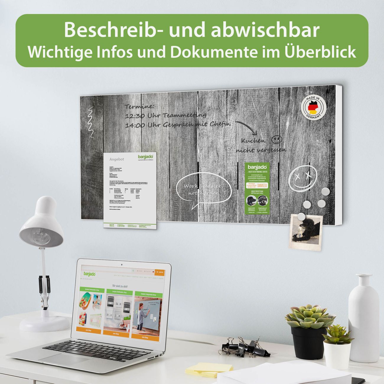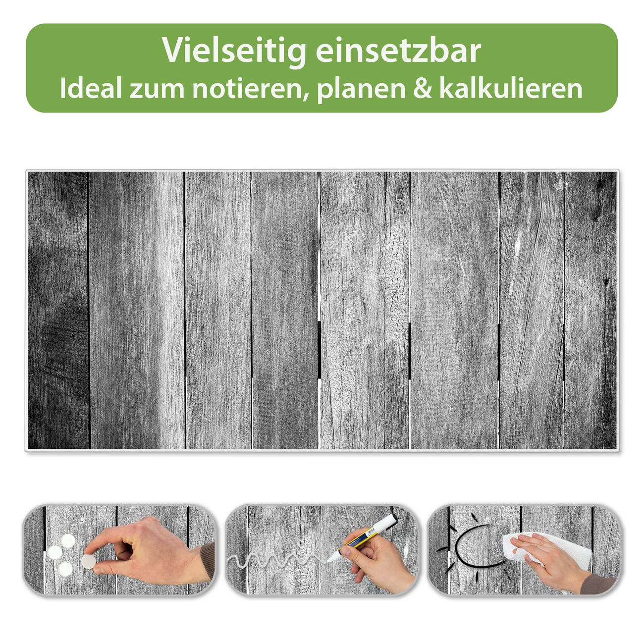 FUNKTION: Die banjado Magnettafel 78x37 cm im Design Motiv Holz Monochrom vereint Funktionalität und modernes Wohndesign auf stilvolle Weise. Diese hochwertige Magnetwand aus Metall hilft Ihnen dabei, Notizen, Fotos, Termine, Einkaufslisten oder Rezepte übersichtlich zu organisieren. Als praktisches Memoboard sorgt sie für Struktur im Alltag und setzt gleichzeitig einen dekorativen Akzent an Ihrer Wand. DESIGN: Die Metalltafel besteht aus robustem, lackiertem Stahl und ist mit allen handelsüblichen Magneten nutzbar. Besonders praktisch ist die beschreibbare Oberfläche. Sie können die Magnettafel ganz einfach mit Kreidestiften beschriften und die Inhalte bei Bedarf mit einem feuchten Tuch wieder entfernen. So eignet sich das Memoboard ideal für Wochenpläne, Menüpläne, To Do Listen oder kreative Botschaften. DETAILS: Mit ihrem großzügigen Querformat von 78x37 cm bietet die Magnettafel ausreichend Platz für Ihre Organisation. Das Motiv Motiv Holz Monochrom bringt eine warme, natürliche Optik in Küche, Flur, Büro oder Homeoffice und wirkt auch ohne Magnete oder Beschriftung wie ein modernes Wandbild. NUTZEN: Auf der Rückseite befinden sich vorgefertigte Löcher für eine schnelle und unkomplizierte Wandmontage. Jede banjado Magnettafel wird in Deutschland gefertigt und steht für Qualität, Langlebigkeit und liebevolle Verarbeitung. Dieses beschreibbare Memoboard ist die perfekte Kombination aus Metalltafel, Designobjekt und praktischer Magnetwand für Ihren Alltag. BANJADO: Wir sind ein kleines Team aus dem Herzen von Sachsen. Wir fertigen alle Artikel von Hand für Sie an, Sie erhalten keine preiswerte Importware. Auf Wunsch können Sie auch Ihr eigenes Foto auf die Magnettafel aufbringen, schreiben Sie uns an. Herzlichst, Ihr banjado-Team