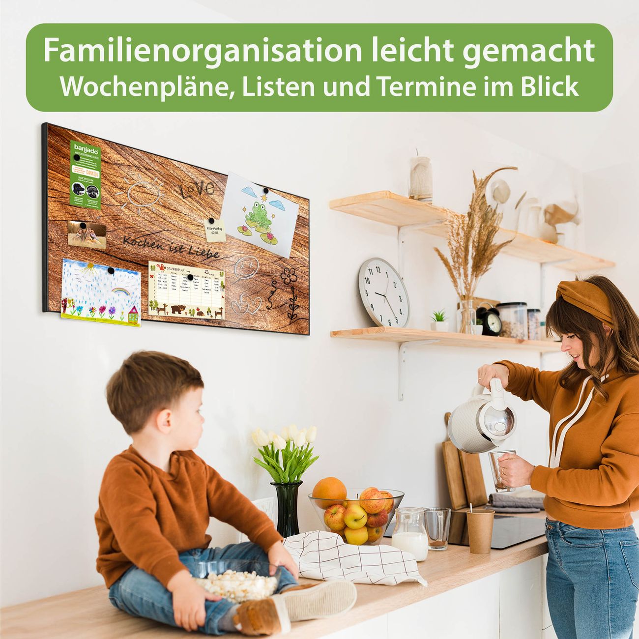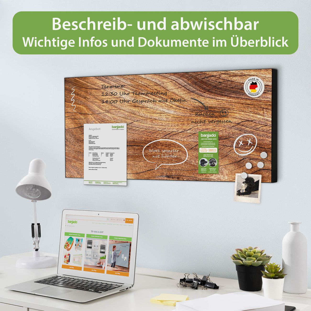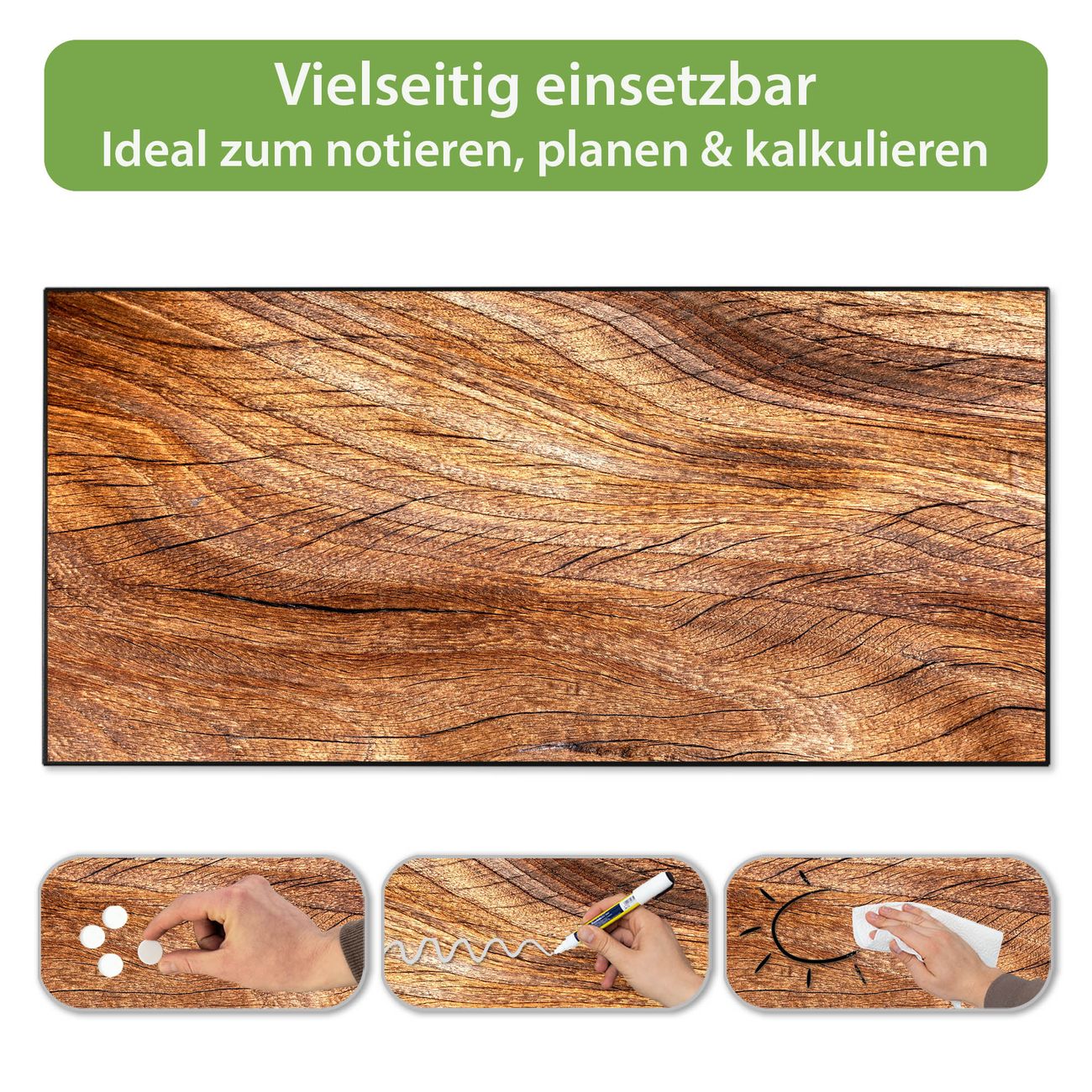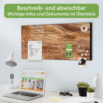 FUNKTION: Die banjado Magnettafel 78x37 cm im Design Motiv Holz Struktur Fließend vereint Funktionalität und modernes Wohndesign auf stilvolle Weise. Diese hochwertige Magnetwand aus Metall hilft Ihnen dabei, Notizen, Fotos, Termine, Einkaufslisten oder Rezepte übersichtlich zu organisieren. Als praktisches Memoboard sorgt sie für Struktur im Alltag und setzt gleichzeitig einen dekorativen Akzent an Ihrer Wand. DESIGN: Die Metalltafel besteht aus robustem, lackiertem Stahl und ist mit allen handelsüblichen Magneten nutzbar. Besonders praktisch ist die beschreibbare Oberfläche. Sie können die Magnettafel ganz einfach mit Kreidestiften beschriften und die Inhalte bei Bedarf mit einem feuchten Tuch wieder entfernen. So eignet sich das Memoboard ideal für Wochenpläne, Menüpläne, To Do Listen oder kreative Botschaften. DETAILS: Mit ihrem großzügigen Querformat von 78x37 cm bietet die Magnettafel ausreichend Platz für Ihre Organisation. Das Motiv Motiv Holz Struktur Fließend bringt eine warme, natürliche Optik in Küche, Flur, Büro oder Homeoffice und wirkt auch ohne Magnete oder Beschriftung wie ein modernes Wandbild. NUTZEN: Auf der Rückseite befinden sich vorgefertigte Löcher für eine schnelle und unkomplizierte Wandmontage. Jede banjado Magnettafel wird in Deutschland gefertigt und steht für Qualität, Langlebigkeit und liebevolle Verarbeitung. Dieses beschreibbare Memoboard ist die perfekte Kombination aus Metalltafel, Designobjekt und praktischer Magnetwand für Ihren Alltag. BANJADO: Wir sind ein kleines Team aus dem Herzen von Sachsen. Wir fertigen alle Artikel von Hand für Sie an, Sie erhalten keine preiswerte Importware. Auf Wunsch können Sie auch Ihr eigenes Foto auf die Magnettafel aufbringen, schreiben Sie uns an. Herzlichst, Ihr banjado-Team