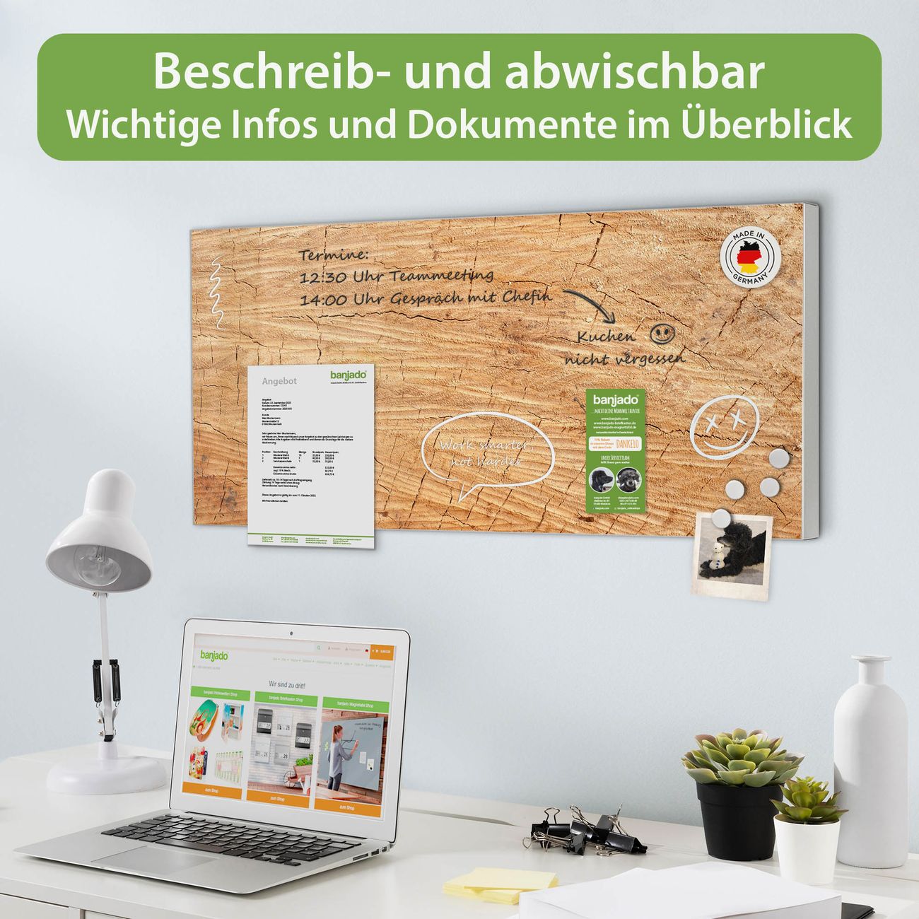 FUNKTION: Die banjado Magnettafel 78x37 cm im Design Motiv Holz Struktur Honig vereint Funktionalität und modernes Wohndesign auf stilvolle Weise. Diese hochwertige Magnetwand aus Metall hilft Ihnen dabei, Notizen, Fotos, Termine, Einkaufslisten oder Rezepte übersichtlich zu organisieren. Als praktisches Memoboard sorgt sie für Struktur im Alltag und setzt gleichzeitig einen dekorativen Akzent an Ihrer Wand. DESIGN: Die Metalltafel besteht aus robustem, lackiertem Stahl und ist mit allen handelsüblichen Magneten nutzbar. Besonders praktisch ist die beschreibbare Oberfläche. Sie können die Magnettafel ganz einfach mit Kreidestiften beschriften und die Inhalte bei Bedarf mit einem feuchten Tuch wieder entfernen. So eignet sich das Memoboard ideal für Wochenpläne, Menüpläne, To Do Listen oder kreative Botschaften. DETAILS: Mit ihrem großzügigen Querformat von 78x37 cm bietet die Magnettafel ausreichend Platz für Ihre Organisation. Das Motiv Motiv Holz Struktur Honig bringt eine warme, natürliche Optik in Küche, Flur, Büro oder Homeoffice und wirkt auch ohne Magnete oder Beschriftung wie ein modernes Wandbild. NUTZEN: Auf der Rückseite befinden sich vorgefertigte Löcher für eine schnelle und unkomplizierte Wandmontage. Jede banjado Magnettafel wird in Deutschland gefertigt und steht für Qualität, Langlebigkeit und liebevolle Verarbeitung. Dieses beschreibbare Memoboard ist die perfekte Kombination aus Metalltafel, Designobjekt und praktischer Magnetwand für Ihren Alltag. BANJADO: Wir sind ein kleines Team aus dem Herzen von Sachsen. Wir fertigen alle Artikel von Hand für Sie an, Sie erhalten keine preiswerte Importware. Auf Wunsch können Sie auch Ihr eigenes Foto auf die Magnettafel aufbringen, schreiben Sie uns an. Herzlichst, Ihr banjado-Team