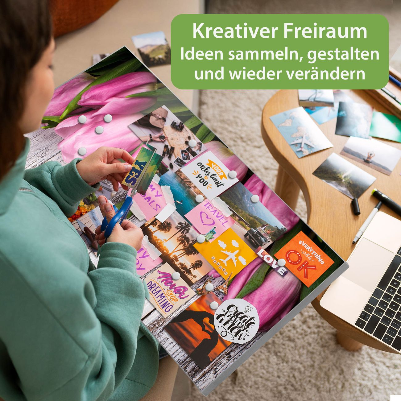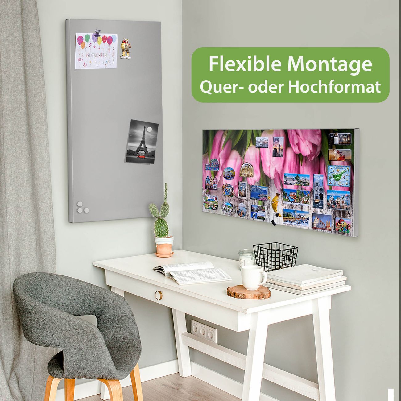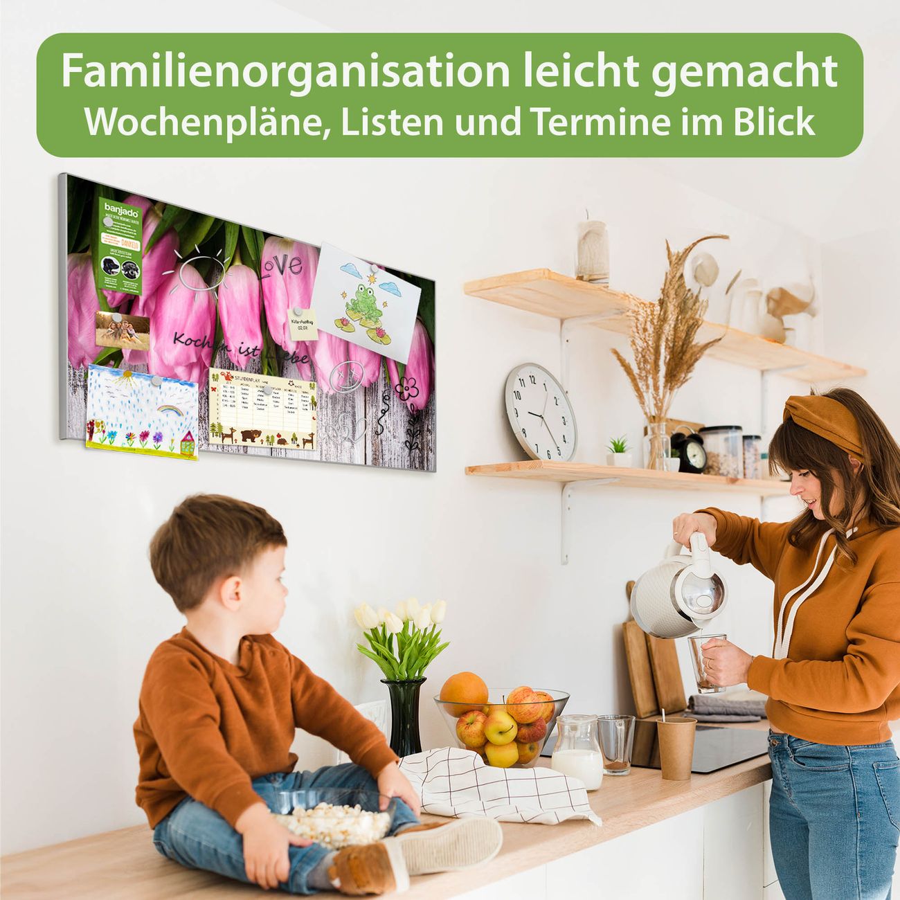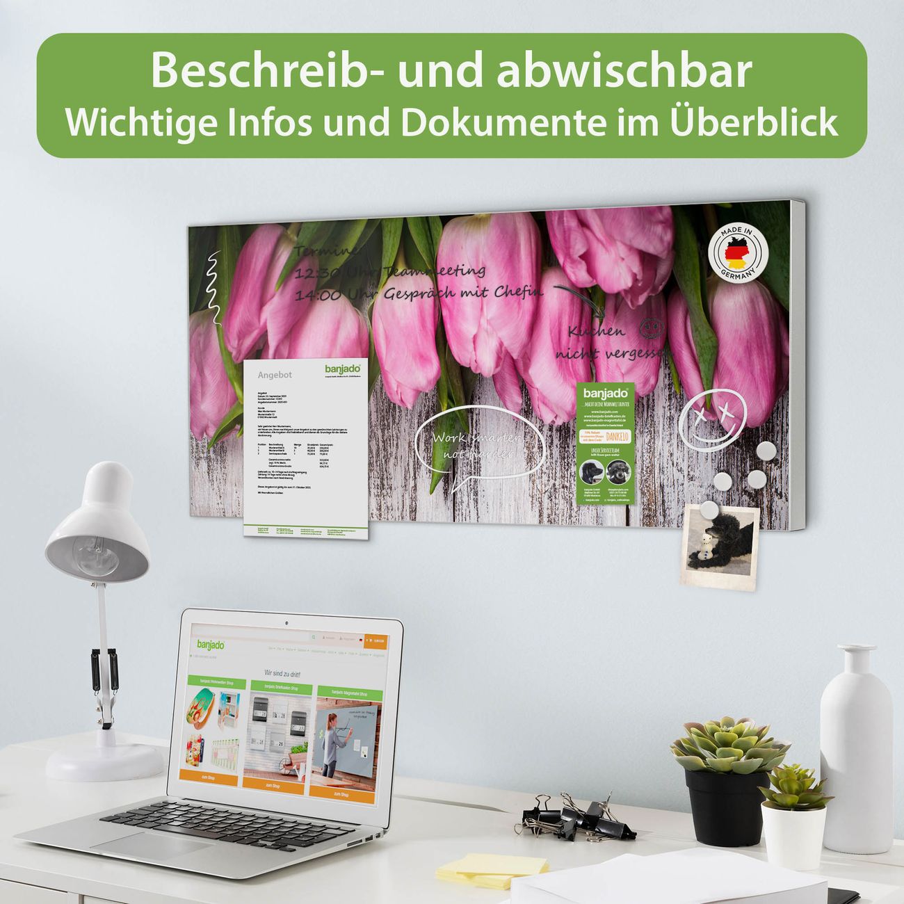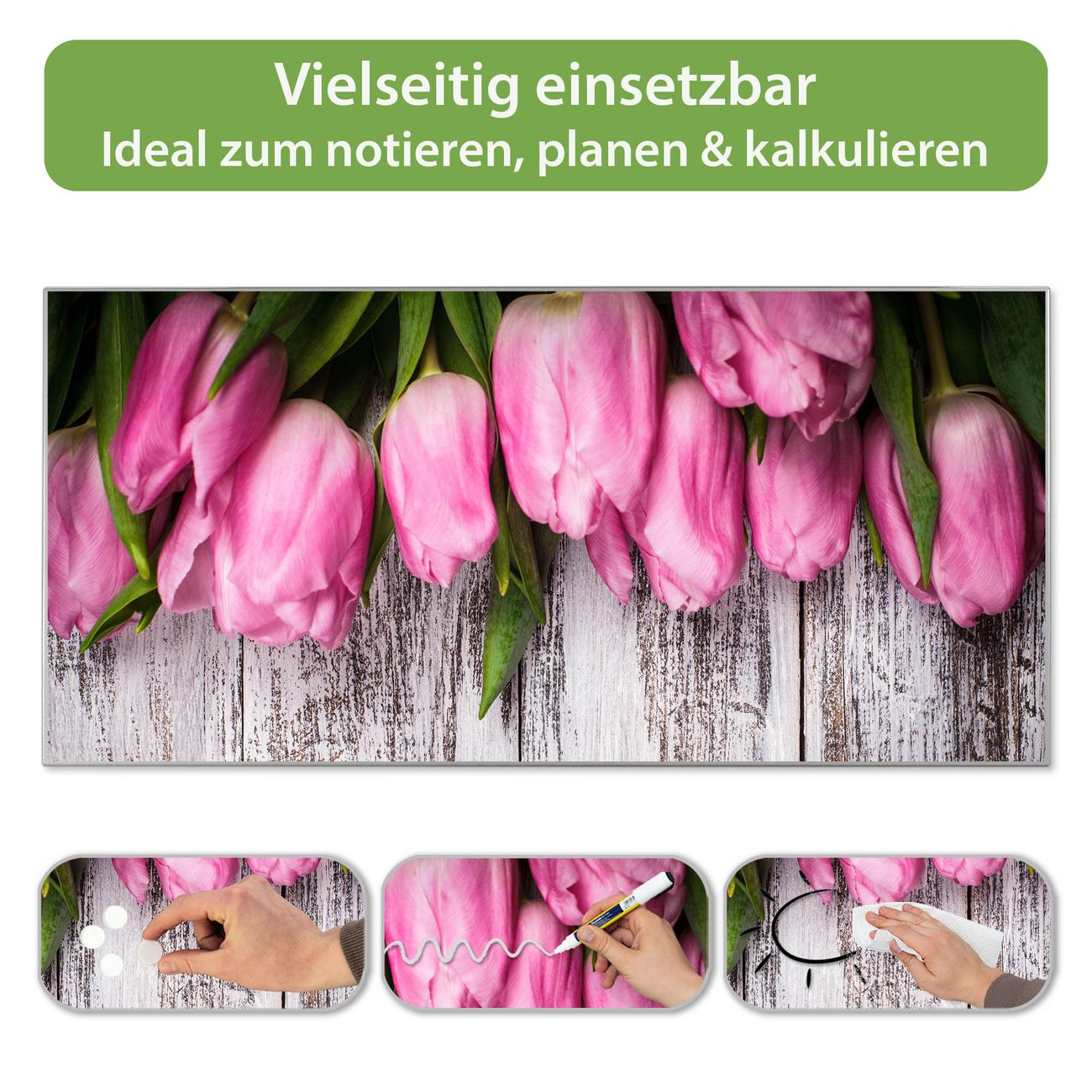 FUNKTION: Die banjado Magnettafel 78x37 cm im Design Motiv Holz und Tulpen vereint Funktionalität und modernes Wohndesign auf stilvolle Weise. Diese hochwertige Magnetwand aus Metall hilft Ihnen dabei, Notizen, Fotos, Termine, Einkaufslisten oder Rezepte übersichtlich zu organisieren. Als praktisches Memoboard sorgt sie für Struktur im Alltag und setzt gleichzeitig einen dekorativen Akzent an Ihrer Wand. DESIGN: Die Metalltafel besteht aus robustem, lackiertem Stahl und ist mit allen handelsüblichen Magneten nutzbar. Besonders praktisch ist die beschreibbare Oberfläche. Sie können die Magnettafel ganz einfach mit Kreidestiften beschriften und die Inhalte bei Bedarf mit einem feuchten Tuch wieder entfernen. So eignet sich das Memoboard ideal für Wochenpläne, Menüpläne, To Do Listen oder kreative Botschaften. DETAILS: Mit ihrem großzügigen Querformat von 78x37 cm bietet die Magnettafel ausreichend Platz für Ihre Organisation. Das Motiv Motiv Holz und Tulpen bringt eine warme, natürliche Optik in Küche, Flur, Büro oder Homeoffice und wirkt auch ohne Magnete oder Beschriftung wie ein modernes Wandbild. NUTZEN: Auf der Rückseite befinden sich vorgefertigte Löcher für eine schnelle und unkomplizierte Wandmontage. Jede banjado Magnettafel wird in Deutschland gefertigt und steht für Qualität, Langlebigkeit und liebevolle Verarbeitung. Dieses beschreibbare Memoboard ist die perfekte Kombination aus Metalltafel, Designobjekt und praktischer Magnetwand für Ihren Alltag. BANJADO: Wir sind ein kleines Team aus dem Herzen von Sachsen. Wir fertigen alle Artikel von Hand für Sie an, Sie erhalten keine preiswerte Importware. Auf Wunsch können Sie auch Ihr eigenes Foto auf die Magnettafel aufbringen, schreiben Sie uns an. Herzlichst, Ihr banjado-Team
