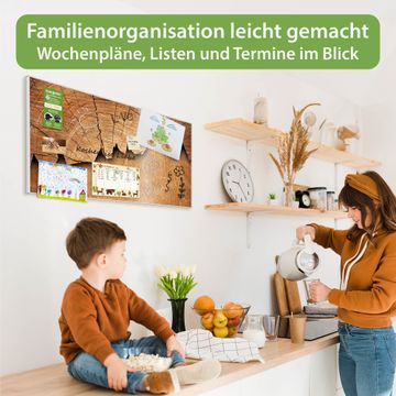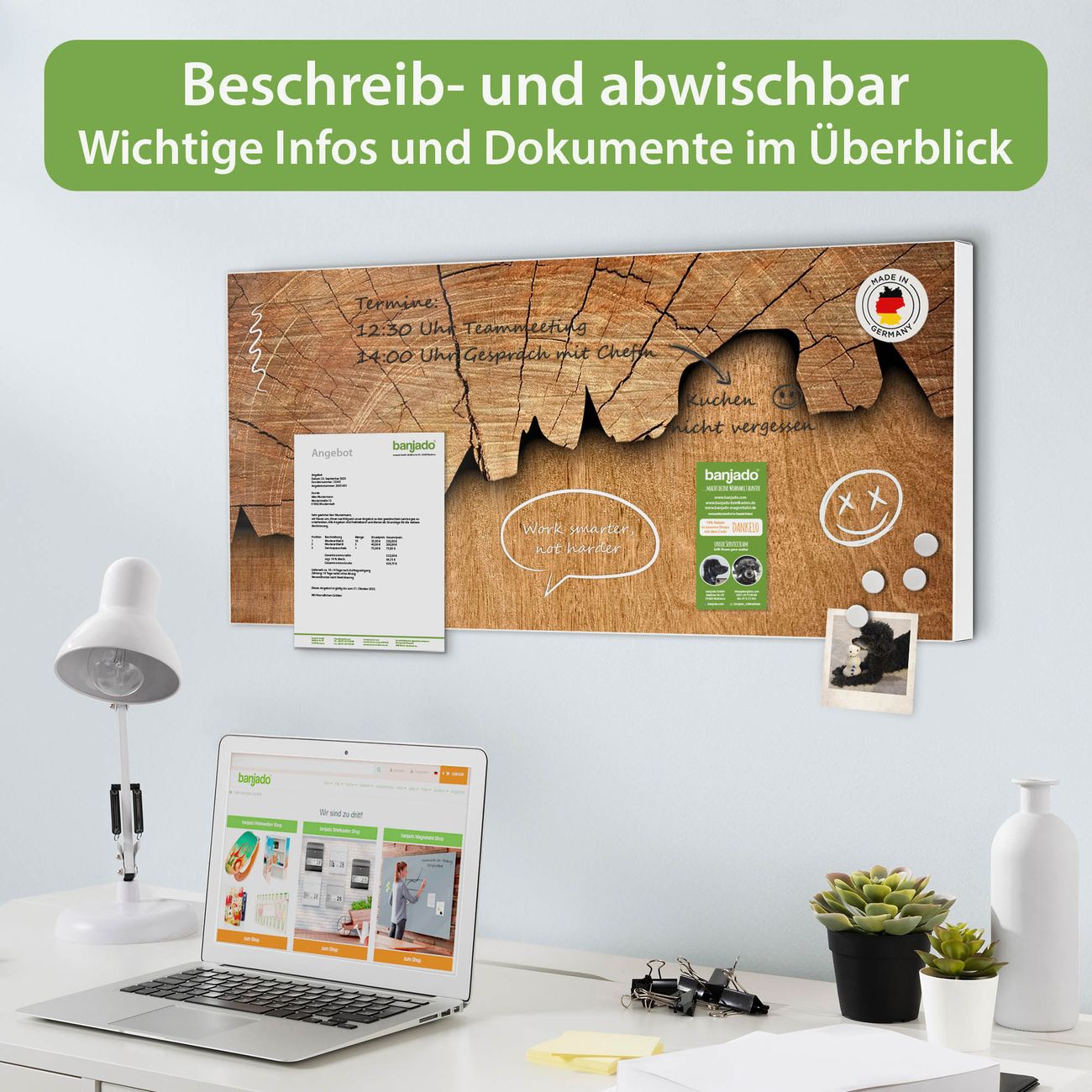 FUNKTION: Die banjado Magnettafel 78x37 cm im Design Motiv Holz vereint Funktionalität und modernes Wohndesign auf stilvolle Weise. Diese hochwertige Magnetwand aus Metall hilft Ihnen dabei, Notizen, Fotos, Termine, Einkaufslisten oder Rezepte übersichtlich zu organisieren. Als praktisches Memoboard sorgt sie für Struktur im Alltag und setzt gleichzeitig einen dekorativen Akzent an Ihrer Wand. DESIGN: Die Metalltafel besteht aus robustem, lackiertem Stahl und ist mit allen handelsüblichen Magneten nutzbar. Besonders praktisch ist die beschreibbare Oberfläche. Sie können die Magnettafel ganz einfach mit Kreidestiften beschriften und die Inhalte bei Bedarf mit einem feuchten Tuch wieder entfernen. So eignet sich das Memoboard ideal für Wochenpläne, Menüpläne, To Do Listen oder kreative Botschaften. DETAILS: Mit ihrem großzügigen Querformat von 78x37 cm bietet die Magnettafel ausreichend Platz für Ihre Organisation. Das Motiv Motiv Holz bringt eine warme, natürliche Optik in Küche, Flur, Büro oder Homeoffice und wirkt auch ohne Magnete oder Beschriftung wie ein modernes Wandbild. NUTZEN: Auf der Rückseite befinden sich vorgefertigte Löcher für eine schnelle und unkomplizierte Wandmontage. Jede banjado Magnettafel wird in Deutschland gefertigt und steht für Qualität, Langlebigkeit und liebevolle Verarbeitung. Dieses beschreibbare Memoboard ist die perfekte Kombination aus Metalltafel, Designobjekt und praktischer Magnetwand für Ihren Alltag. BANJADO: Wir sind ein kleines Team aus dem Herzen von Sachsen. Wir fertigen alle Artikel von Hand für Sie an, Sie erhalten keine preiswerte Importware. Auf Wunsch können Sie auch Ihr eigenes Foto auf die Magnettafel aufbringen, schreiben Sie uns an. Herzlichst, Ihr banjado-Team