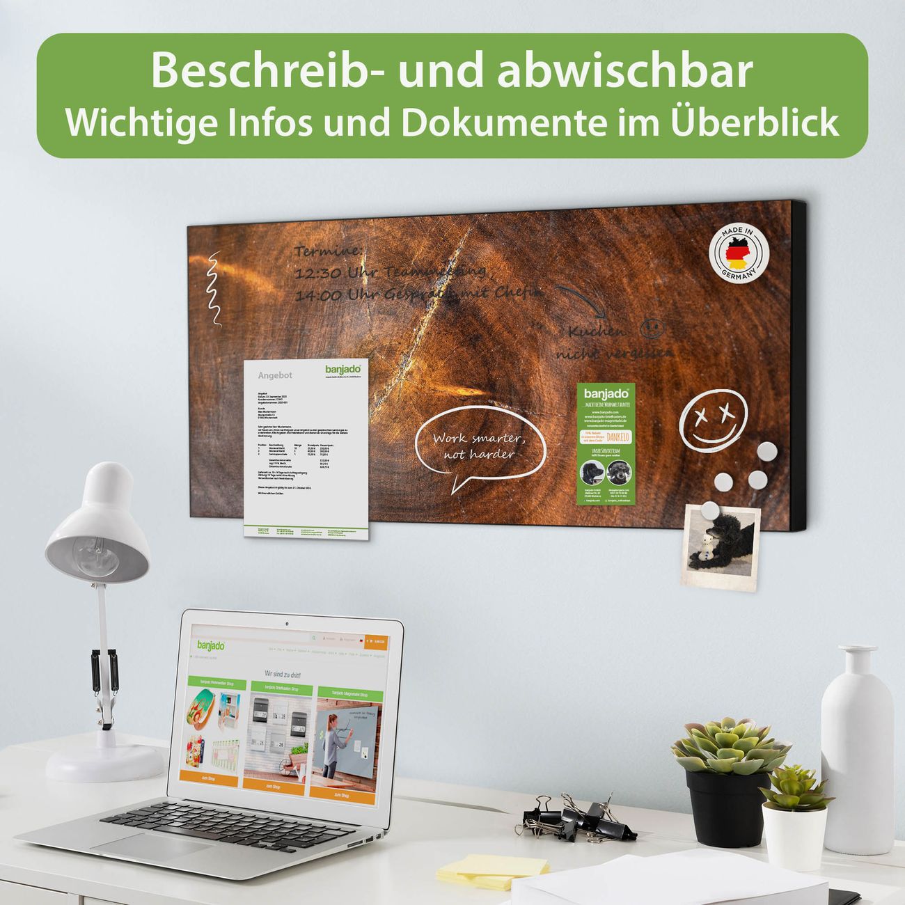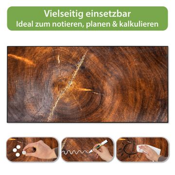 FUNKTION: Die banjado Magnettafel 78x37 cm im Design Motiv Holzring mit Rissen vereint Funktionalität und modernes Wohndesign auf stilvolle Weise. Diese hochwertige Magnetwand aus Metall hilft Ihnen dabei, Notizen, Fotos, Termine, Einkaufslisten oder Rezepte übersichtlich zu organisieren. Als praktisches Memoboard sorgt sie für Struktur im Alltag und setzt gleichzeitig einen dekorativen Akzent an Ihrer Wand. DESIGN: Die Metalltafel besteht aus robustem, lackiertem Stahl und ist mit allen handelsüblichen Magneten nutzbar. Besonders praktisch ist die beschreibbare Oberfläche. Sie können die Magnettafel ganz einfach mit Kreidestiften beschriften und die Inhalte bei Bedarf mit einem feuchten Tuch wieder entfernen. So eignet sich das Memoboard ideal für Wochenpläne, Menüpläne, To Do Listen oder kreative Botschaften. DETAILS: Mit ihrem großzügigen Querformat von 78x37 cm bietet die Magnettafel ausreichend Platz für Ihre Organisation. Das Motiv Motiv Holzring mit Rissen bringt eine warme, natürliche Optik in Küche, Flur, Büro oder Homeoffice und wirkt auch ohne Magnete oder Beschriftung wie ein modernes Wandbild. NUTZEN: Auf der Rückseite befinden sich vorgefertigte Löcher für eine schnelle und unkomplizierte Wandmontage. Jede banjado Magnettafel wird in Deutschland gefertigt und steht für Qualität, Langlebigkeit und liebevolle Verarbeitung. Dieses beschreibbare Memoboard ist die perfekte Kombination aus Metalltafel, Designobjekt und praktischer Magnetwand für Ihren Alltag. BANJADO: Wir sind ein kleines Team aus dem Herzen von Sachsen. Wir fertigen alle Artikel von Hand für Sie an, Sie erhalten keine preiswerte Importware. Auf Wunsch können Sie auch Ihr eigenes Foto auf die Magnettafel aufbringen, schreiben Sie uns an. Herzlichst, Ihr banjado-Team