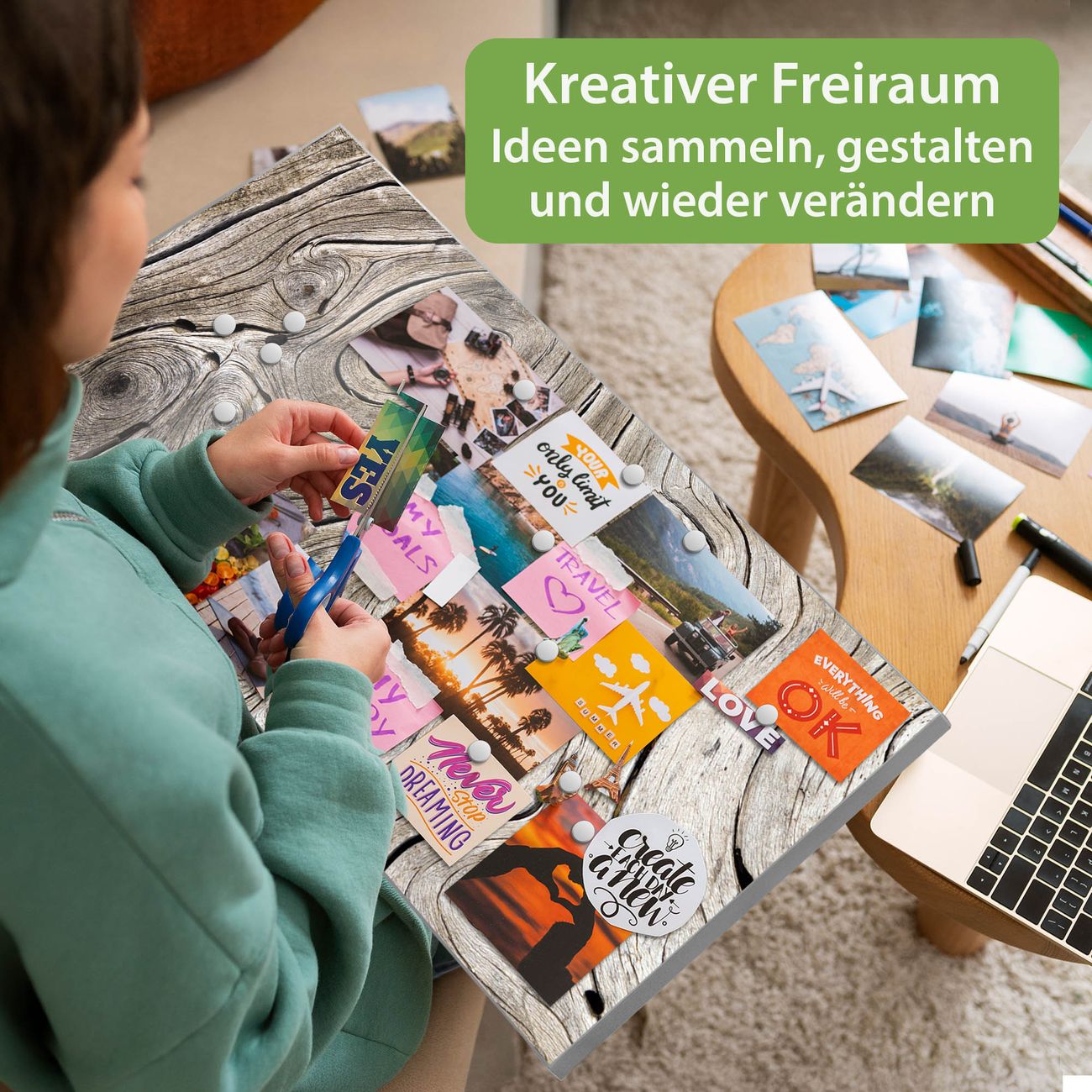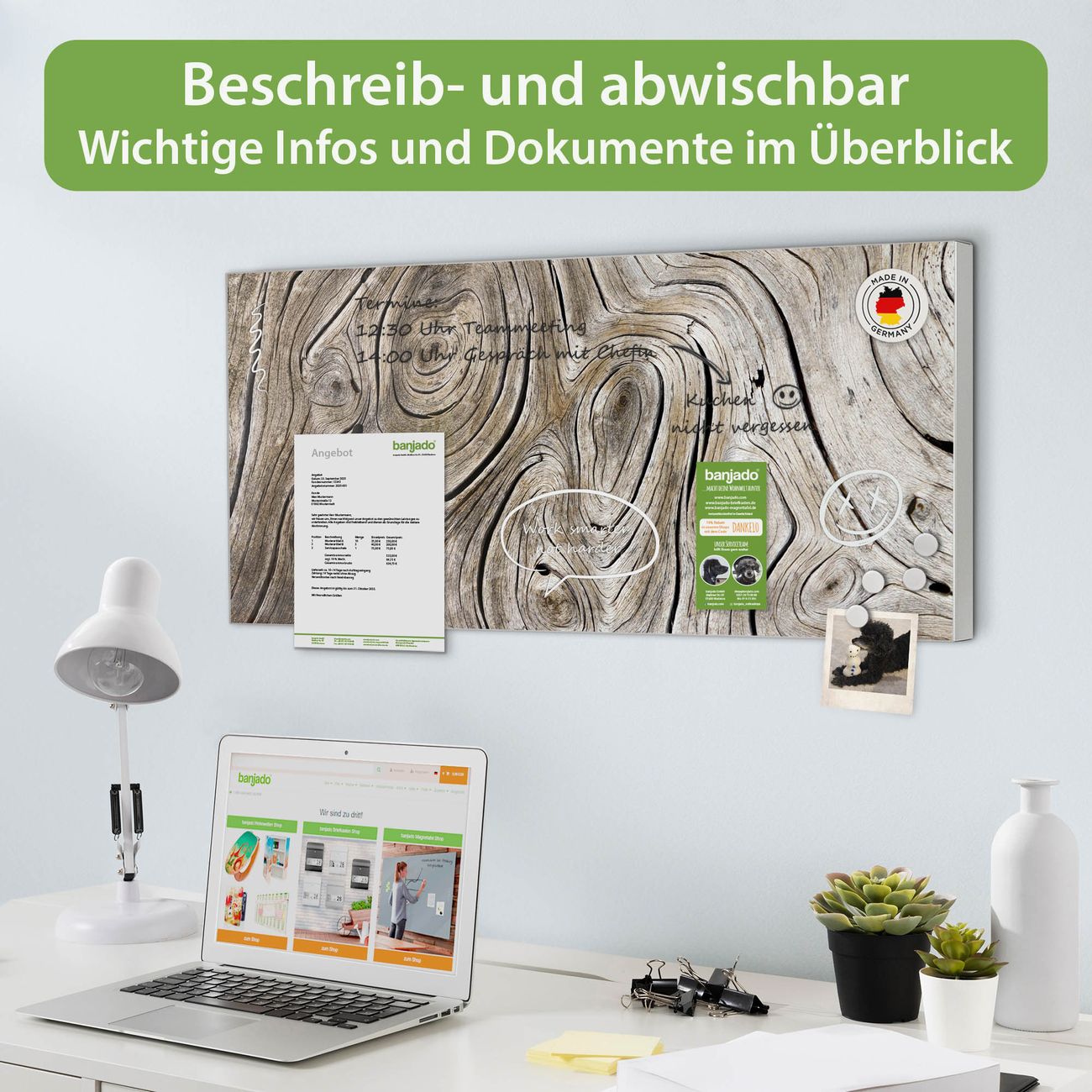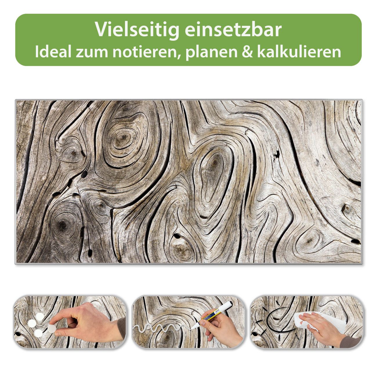 FUNKTION: Die banjado Magnettafel 78x37 cm im Design Motiv Holzwirbel vereint Funktionalität und modernes Wohndesign auf stilvolle Weise. Diese hochwertige Magnetwand aus Metall hilft Ihnen dabei, Notizen, Fotos, Termine, Einkaufslisten oder Rezepte übersichtlich zu organisieren. Als praktisches Memoboard sorgt sie für Struktur im Alltag und setzt gleichzeitig einen dekorativen Akzent an Ihrer Wand. DESIGN: Die Metalltafel besteht aus robustem, lackiertem Stahl und ist mit allen handelsüblichen Magneten nutzbar. Besonders praktisch ist die beschreibbare Oberfläche. Sie können die Magnettafel ganz einfach mit Kreidestiften beschriften und die Inhalte bei Bedarf mit einem feuchten Tuch wieder entfernen. So eignet sich das Memoboard ideal für Wochenpläne, Menüpläne, To Do Listen oder kreative Botschaften. DETAILS: Mit ihrem großzügigen Querformat von 78x37 cm bietet die Magnettafel ausreichend Platz für Ihre Organisation. Das Motiv Motiv Holzwirbel bringt eine warme, natürliche Optik in Küche, Flur, Büro oder Homeoffice und wirkt auch ohne Magnete oder Beschriftung wie ein modernes Wandbild. NUTZEN: Auf der Rückseite befinden sich vorgefertigte Löcher für eine schnelle und unkomplizierte Wandmontage. Jede banjado Magnettafel wird in Deutschland gefertigt und steht für Qualität, Langlebigkeit und liebevolle Verarbeitung. Dieses beschreibbare Memoboard ist die perfekte Kombination aus Metalltafel, Designobjekt und praktischer Magnetwand für Ihren Alltag. BANJADO: Wir sind ein kleines Team aus dem Herzen von Sachsen. Wir fertigen alle Artikel von Hand für Sie an, Sie erhalten keine preiswerte Importware. Auf Wunsch können Sie auch Ihr eigenes Foto auf die Magnettafel aufbringen, schreiben Sie uns an. Herzlichst, Ihr banjado-Team