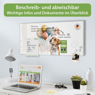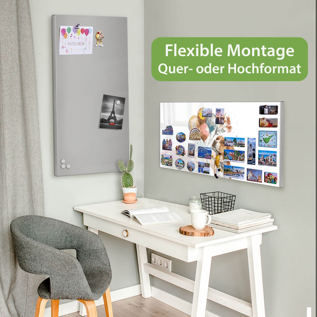 FUNKTION: Die banjado Magnettafel 78x37 cm im Design Motiv Hund mit Ballons Aquarell vereint Funktionalität und modernes Wohndesign auf stilvolle Weise. Diese hochwertige Magnetwand aus Metall hilft Ihnen dabei, Notizen, Fotos, Termine, Einkaufslisten oder Rezepte übersichtlich zu organisieren. Als praktisches Memoboard sorgt sie für Struktur im Alltag und setzt gleichzeitig einen dekorativen Akzent an Ihrer Wand. DESIGN: Die Metalltafel besteht aus robustem, lackiertem Stahl und ist mit allen handelsüblichen Magneten nutzbar. Besonders praktisch ist die beschreibbare Oberfläche. Sie können die Magnettafel ganz einfach mit Kreidestiften beschriften und die Inhalte bei Bedarf mit einem feuchten Tuch wieder entfernen. So eignet sich das Memoboard ideal für Wochenpläne, Menüpläne, To Do Listen oder kreative Botschaften. DETAILS: Mit ihrem großzügigen Querformat von 78x37 cm bietet die Magnettafel ausreichend Platz für Ihre Organisation. Das Motiv Motiv Hund mit Ballons Aquarell bringt eine warme, natürliche Optik in Küche, Flur, Büro oder Homeoffice und wirkt auch ohne Magnete oder Beschriftung wie ein modernes Wandbild. NUTZEN: Auf der Rückseite befinden sich vorgefertigte Löcher für eine schnelle und unkomplizierte Wandmontage. Jede banjado Magnettafel wird in Deutschland gefertigt und steht für Qualität, Langlebigkeit und liebevolle Verarbeitung. Dieses beschreibbare Memoboard ist die perfekte Kombination aus Metalltafel, Designobjekt und praktischer Magnetwand für Ihren Alltag. BANJADO: Wir sind ein kleines Team aus dem Herzen von Sachsen. Wir fertigen alle Artikel von Hand für Sie an, Sie erhalten keine preiswerte Importware. Auf Wunsch können Sie auch Ihr eigenes Foto auf die Magnettafel aufbringen, schreiben Sie uns an. Herzlichst, Ihr banjado-Team