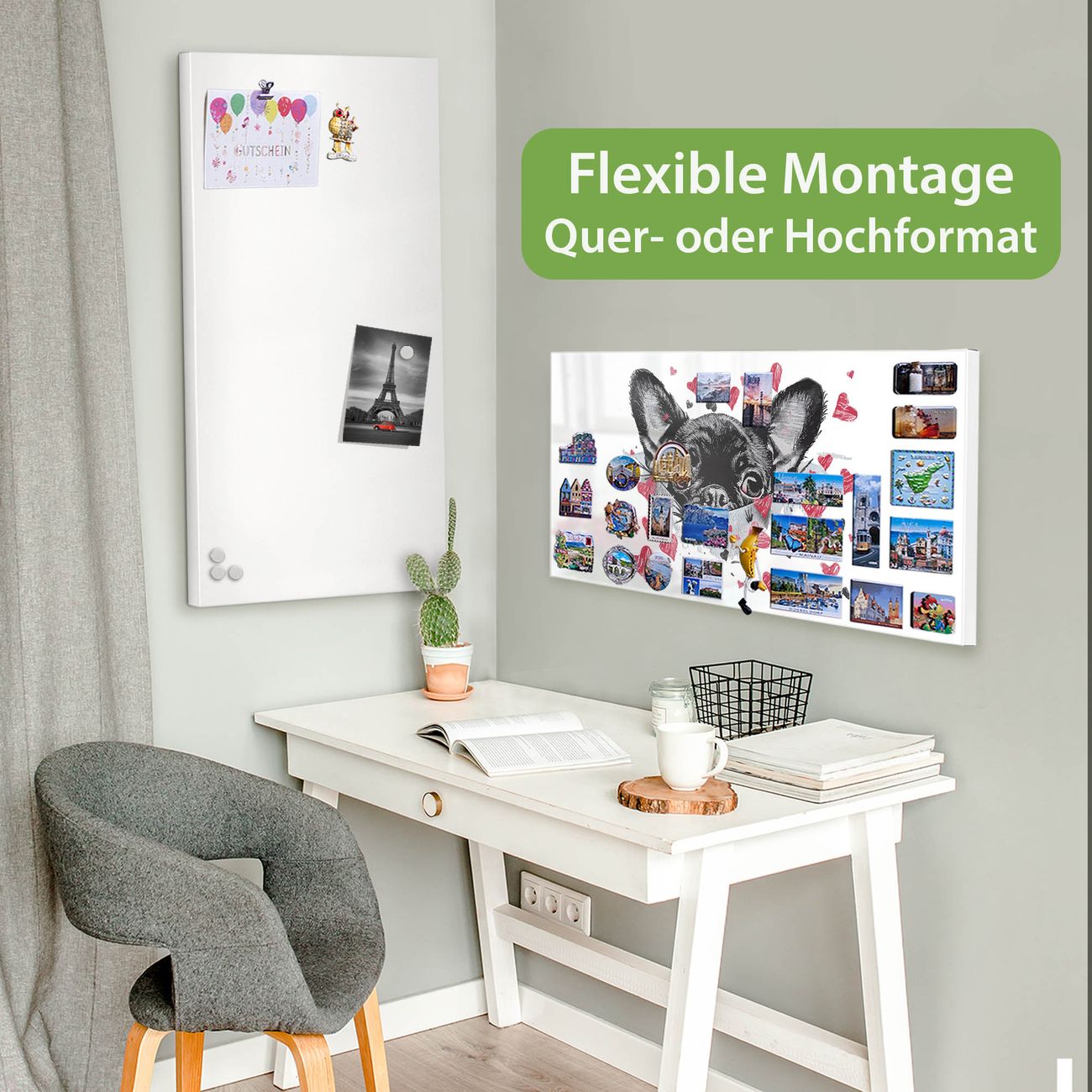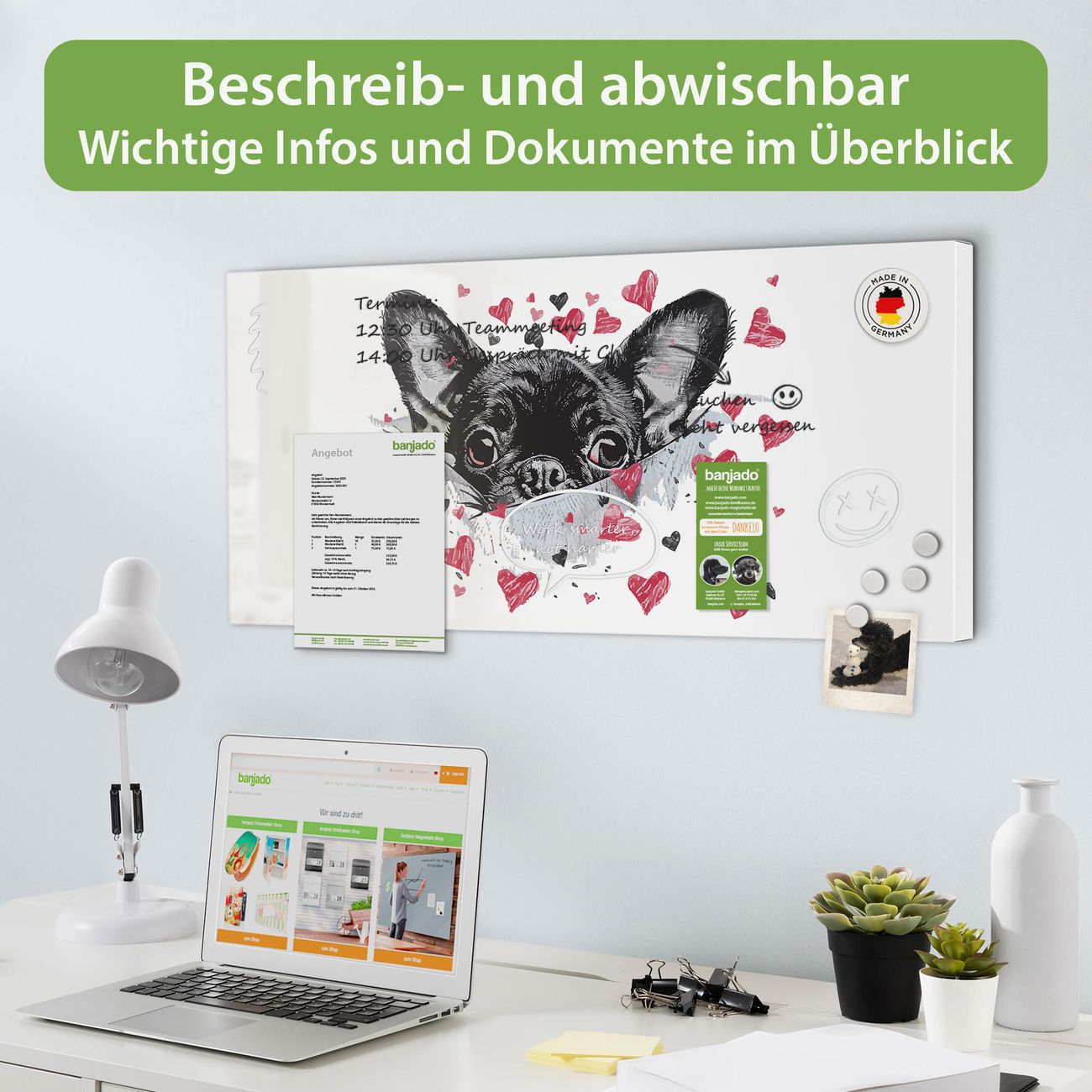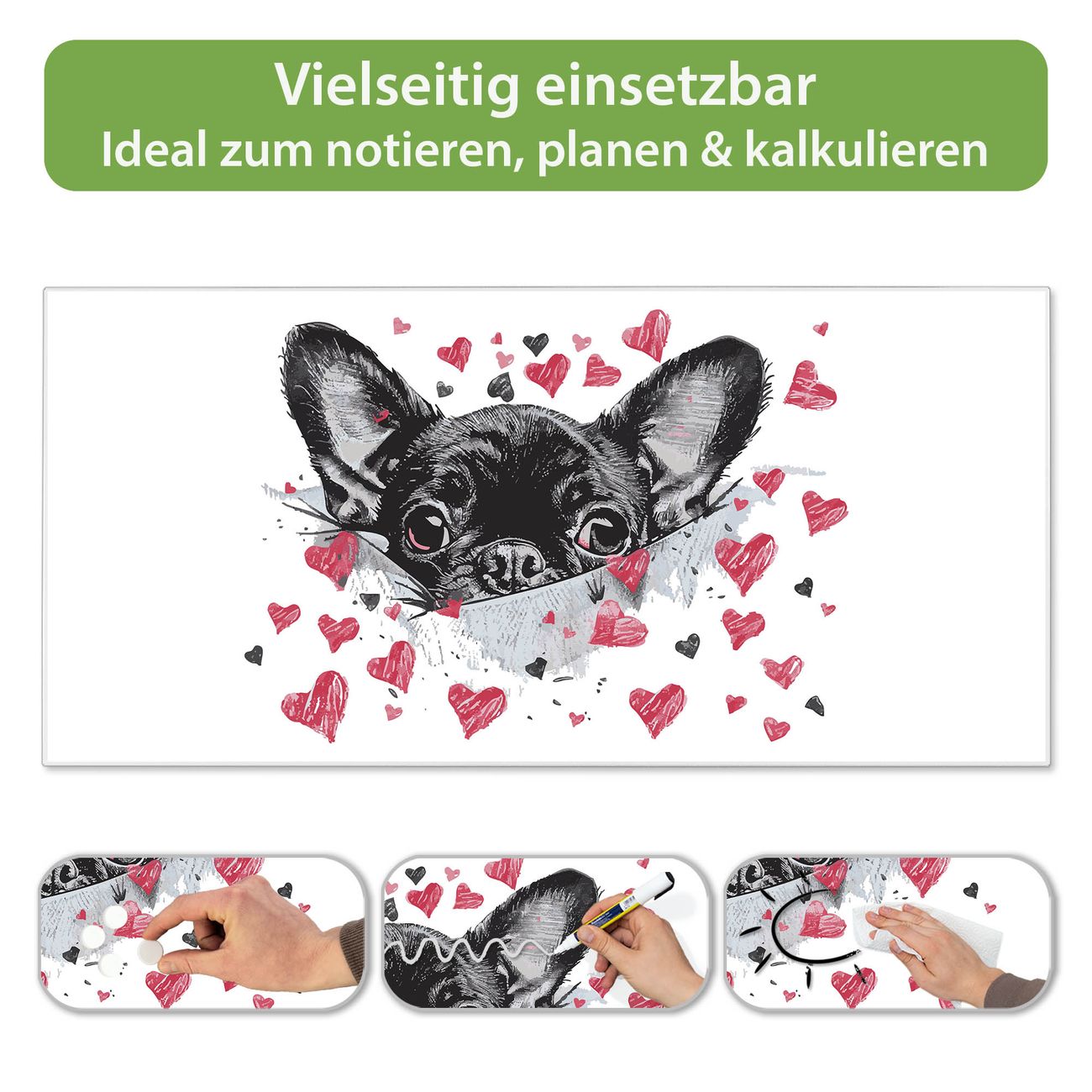 FUNKTION: Die banjado Magnettafel 78x37 cm im Design Motiv Hund mit Herzen vereint Funktionalität und modernes Wohndesign auf stilvolle Weise. Diese hochwertige Magnetwand aus Metall hilft Ihnen dabei, Notizen, Fotos, Termine, Einkaufslisten oder Rezepte übersichtlich zu organisieren. Als praktisches Memoboard sorgt sie für Struktur im Alltag und setzt gleichzeitig einen dekorativen Akzent an Ihrer Wand. DESIGN: Die Metalltafel besteht aus robustem, lackiertem Stahl und ist mit allen handelsüblichen Magneten nutzbar. Besonders praktisch ist die beschreibbare Oberfläche. Sie können die Magnettafel ganz einfach mit Kreidestiften beschriften und die Inhalte bei Bedarf mit einem feuchten Tuch wieder entfernen. So eignet sich das Memoboard ideal für Wochenpläne, Menüpläne, To Do Listen oder kreative Botschaften. DETAILS: Mit ihrem großzügigen Querformat von 78x37 cm bietet die Magnettafel ausreichend Platz für Ihre Organisation. Das Motiv Motiv Hund mit Herzen bringt eine warme, natürliche Optik in Küche, Flur, Büro oder Homeoffice und wirkt auch ohne Magnete oder Beschriftung wie ein modernes Wandbild. NUTZEN: Auf der Rückseite befinden sich vorgefertigte Löcher für eine schnelle und unkomplizierte Wandmontage. Jede banjado Magnettafel wird in Deutschland gefertigt und steht für Qualität, Langlebigkeit und liebevolle Verarbeitung. Dieses beschreibbare Memoboard ist die perfekte Kombination aus Metalltafel, Designobjekt und praktischer Magnetwand für Ihren Alltag. BANJADO: Wir sind ein kleines Team aus dem Herzen von Sachsen. Wir fertigen alle Artikel von Hand für Sie an, Sie erhalten keine preiswerte Importware. Auf Wunsch können Sie auch Ihr eigenes Foto auf die Magnettafel aufbringen, schreiben Sie uns an. Herzlichst, Ihr banjado-Team