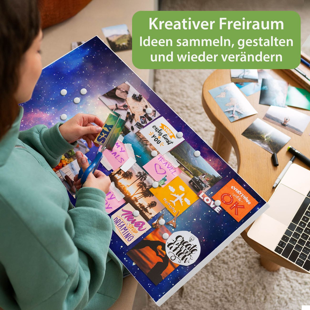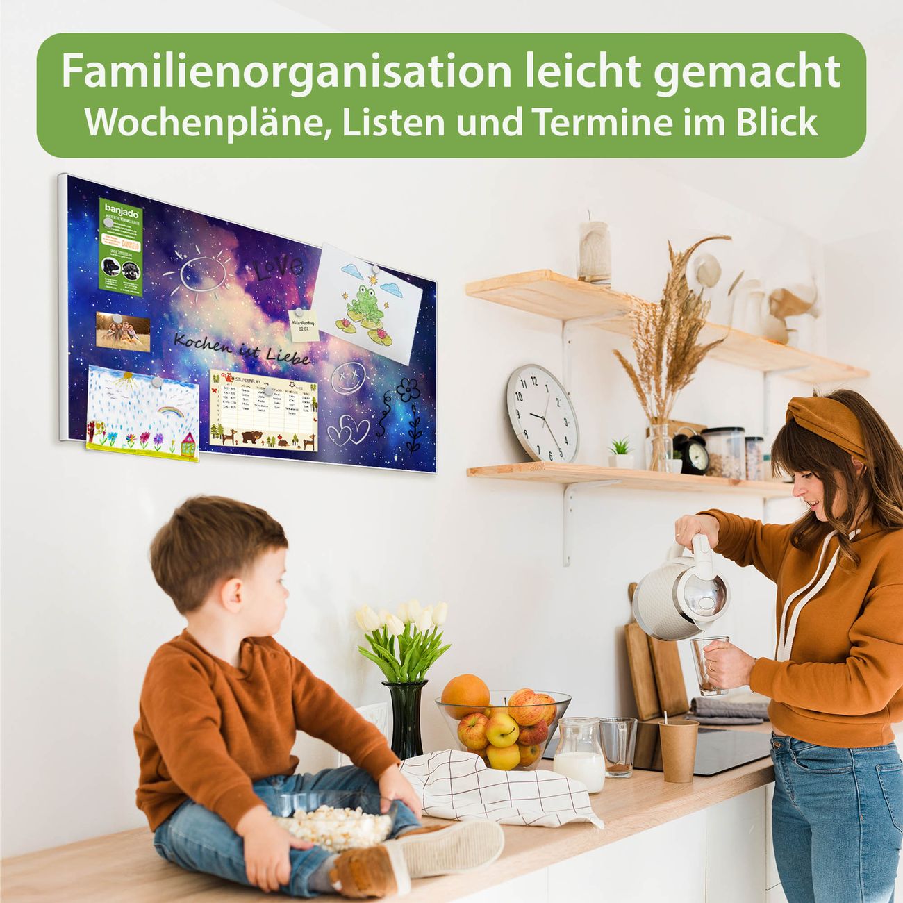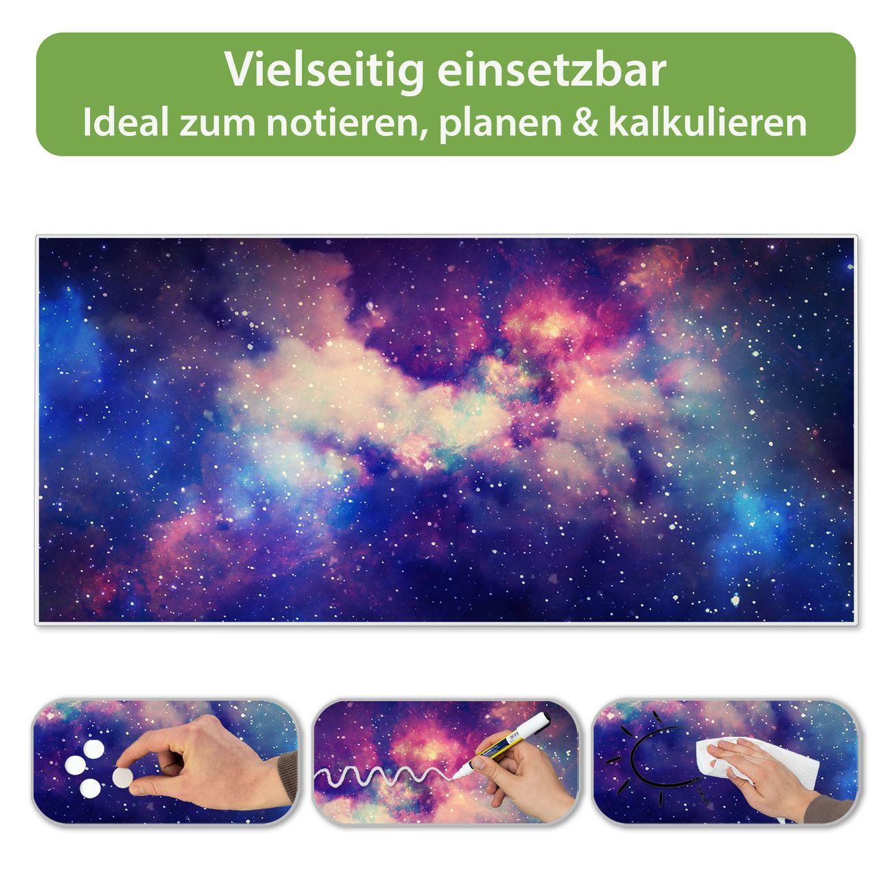 FUNKTION: Die banjado Magnettafel 78x37 cm im Design Motiv Im Weltall 1 vereint Funktionalität und modernes Wohndesign auf stilvolle Weise. Diese hochwertige Magnetwand aus Metall hilft Ihnen dabei, Notizen, Fotos, Termine, Einkaufslisten oder Rezepte übersichtlich zu organisieren. Als praktisches Memoboard sorgt sie für Struktur im Alltag und setzt gleichzeitig einen dekorativen Akzent an Ihrer Wand. DESIGN: Die Metalltafel besteht aus robustem, lackiertem Stahl und ist mit allen handelsüblichen Magneten nutzbar. Besonders praktisch ist die beschreibbare Oberfläche. Sie können die Magnettafel ganz einfach mit Kreidestiften beschriften und die Inhalte bei Bedarf mit einem feuchten Tuch wieder entfernen. So eignet sich das Memoboard ideal für Wochenpläne, Menüpläne, To Do Listen oder kreative Botschaften. DETAILS: Mit ihrem großzügigen Querformat von 78x37 cm bietet die Magnettafel ausreichend Platz für Ihre Organisation. Das Motiv Motiv Im Weltall 1 bringt eine warme, natürliche Optik in Küche, Flur, Büro oder Homeoffice und wirkt auch ohne Magnete oder Beschriftung wie ein modernes Wandbild. NUTZEN: Auf der Rückseite befinden sich vorgefertigte Löcher für eine schnelle und unkomplizierte Wandmontage. Jede banjado Magnettafel wird in Deutschland gefertigt und steht für Qualität, Langlebigkeit und liebevolle Verarbeitung. Dieses beschreibbare Memoboard ist die perfekte Kombination aus Metalltafel, Designobjekt und praktischer Magnetwand für Ihren Alltag. BANJADO: Wir sind ein kleines Team aus dem Herzen von Sachsen. Wir fertigen alle Artikel von Hand für Sie an, Sie erhalten keine preiswerte Importware. Auf Wunsch können Sie auch Ihr eigenes Foto auf die Magnettafel aufbringen, schreiben Sie uns an. Herzlichst, Ihr banjado-Team