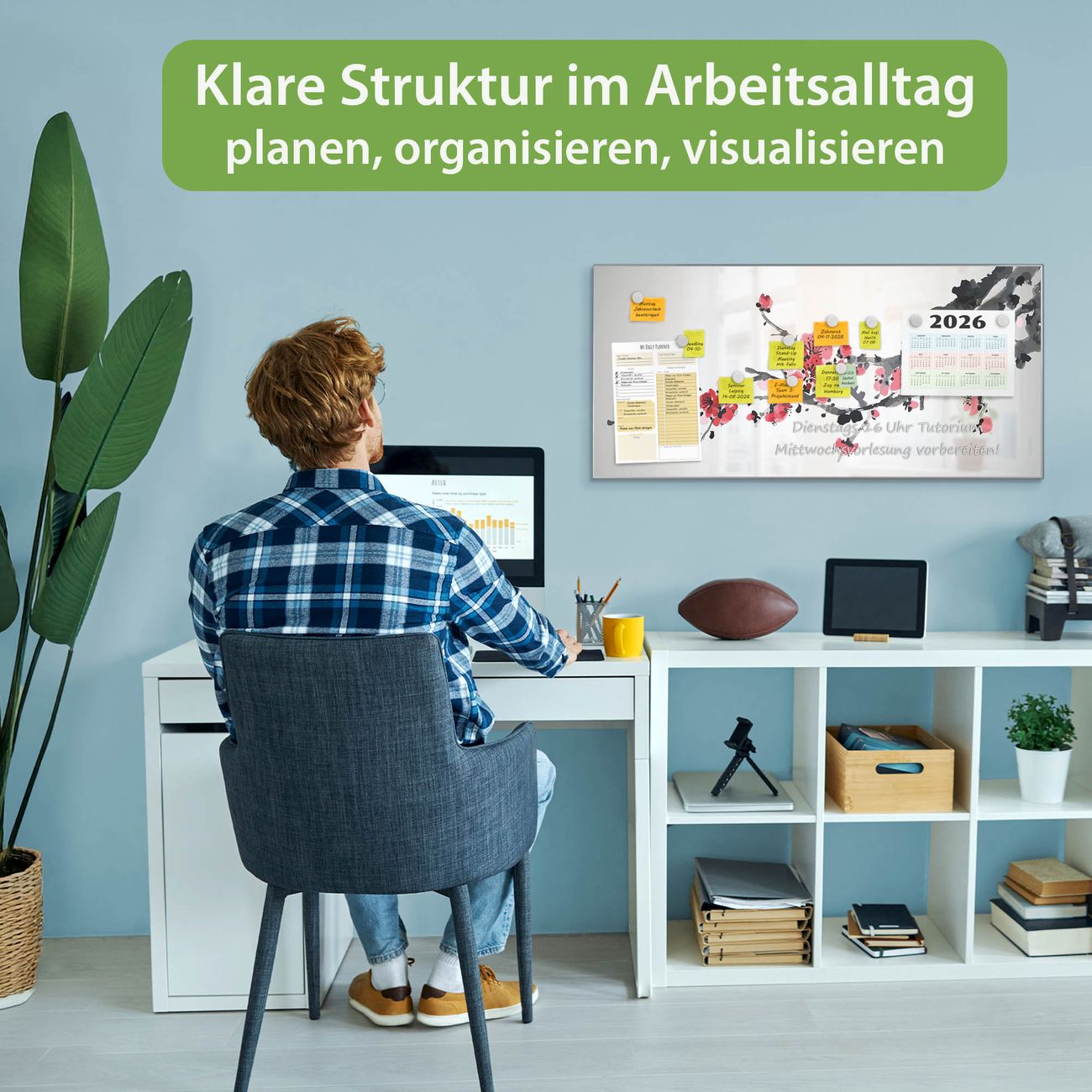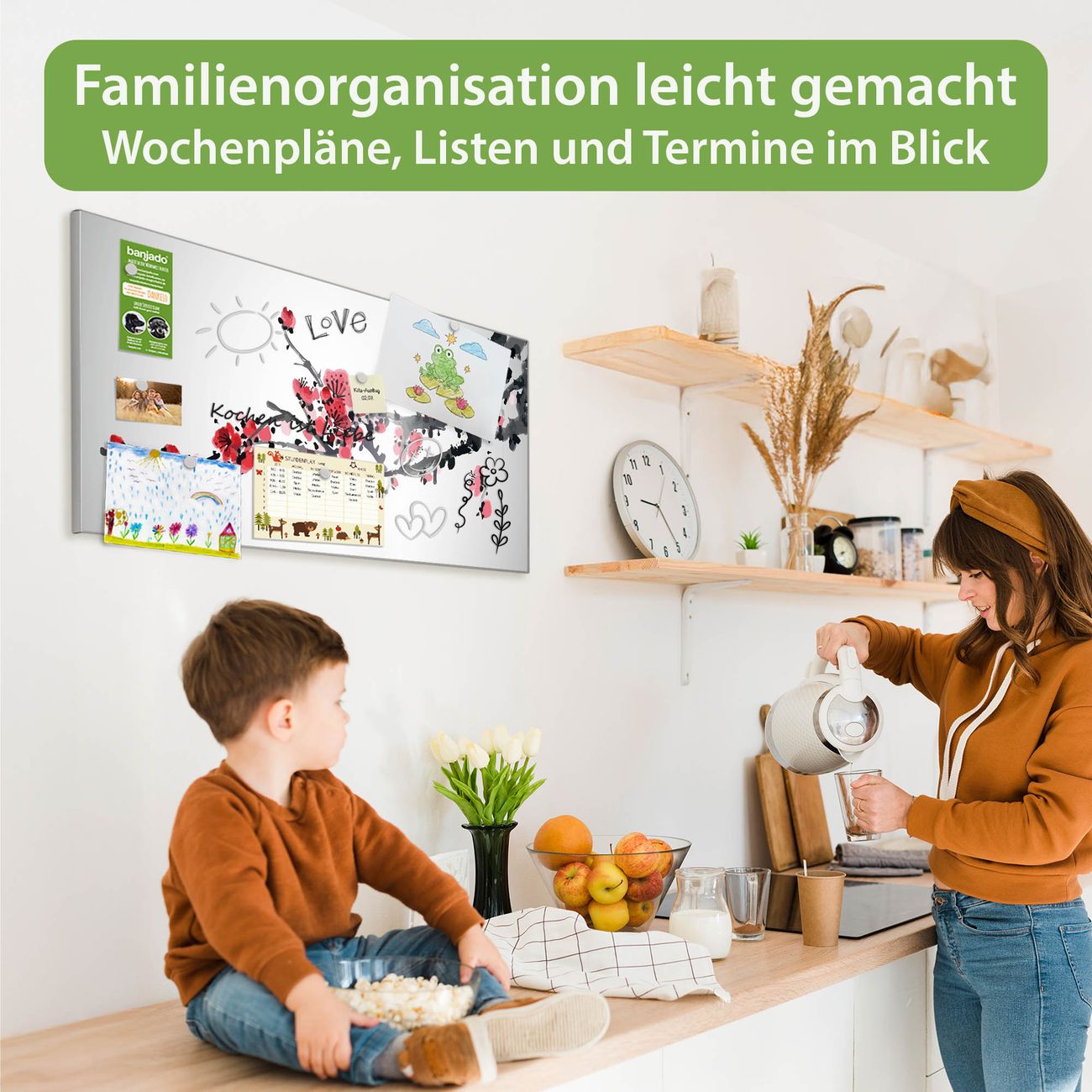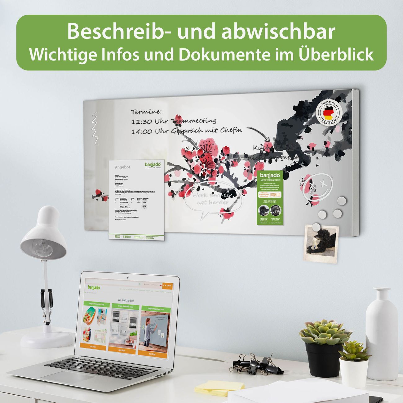 FUNKTION: Die banjado Magnettafel 78x37 cm im Design Motiv Japanische Blüten 2 vereint Funktionalität und modernes Wohndesign auf stilvolle Weise. Diese hochwertige Magnetwand aus Metall hilft Ihnen dabei, Notizen, Fotos, Termine, Einkaufslisten oder Rezepte übersichtlich zu organisieren. Als praktisches Memoboard sorgt sie für Struktur im Alltag und setzt gleichzeitig einen dekorativen Akzent an Ihrer Wand. DESIGN: Die Metalltafel besteht aus robustem, lackiertem Stahl und ist mit allen handelsüblichen Magneten nutzbar. Besonders praktisch ist die beschreibbare Oberfläche. Sie können die Magnettafel ganz einfach mit Kreidestiften beschriften und die Inhalte bei Bedarf mit einem feuchten Tuch wieder entfernen. So eignet sich das Memoboard ideal für Wochenpläne, Menüpläne, To Do Listen oder kreative Botschaften. DETAILS: Mit ihrem großzügigen Querformat von 78x37 cm bietet die Magnettafel ausreichend Platz für Ihre Organisation. Das Motiv Motiv Japanische Blüten 2 bringt eine warme, natürliche Optik in Küche, Flur, Büro oder Homeoffice und wirkt auch ohne Magnete oder Beschriftung wie ein modernes Wandbild. NUTZEN: Auf der Rückseite befinden sich vorgefertigte Löcher für eine schnelle und unkomplizierte Wandmontage. Jede banjado Magnettafel wird in Deutschland gefertigt und steht für Qualität, Langlebigkeit und liebevolle Verarbeitung. Dieses beschreibbare Memoboard ist die perfekte Kombination aus Metalltafel, Designobjekt und praktischer Magnetwand für Ihren Alltag. BANJADO: Wir sind ein kleines Team aus dem Herzen von Sachsen. Wir fertigen alle Artikel von Hand für Sie an, Sie erhalten keine preiswerte Importware. Auf Wunsch können Sie auch Ihr eigenes Foto auf die Magnettafel aufbringen, schreiben Sie uns an. Herzlichst, Ihr banjado-Team
