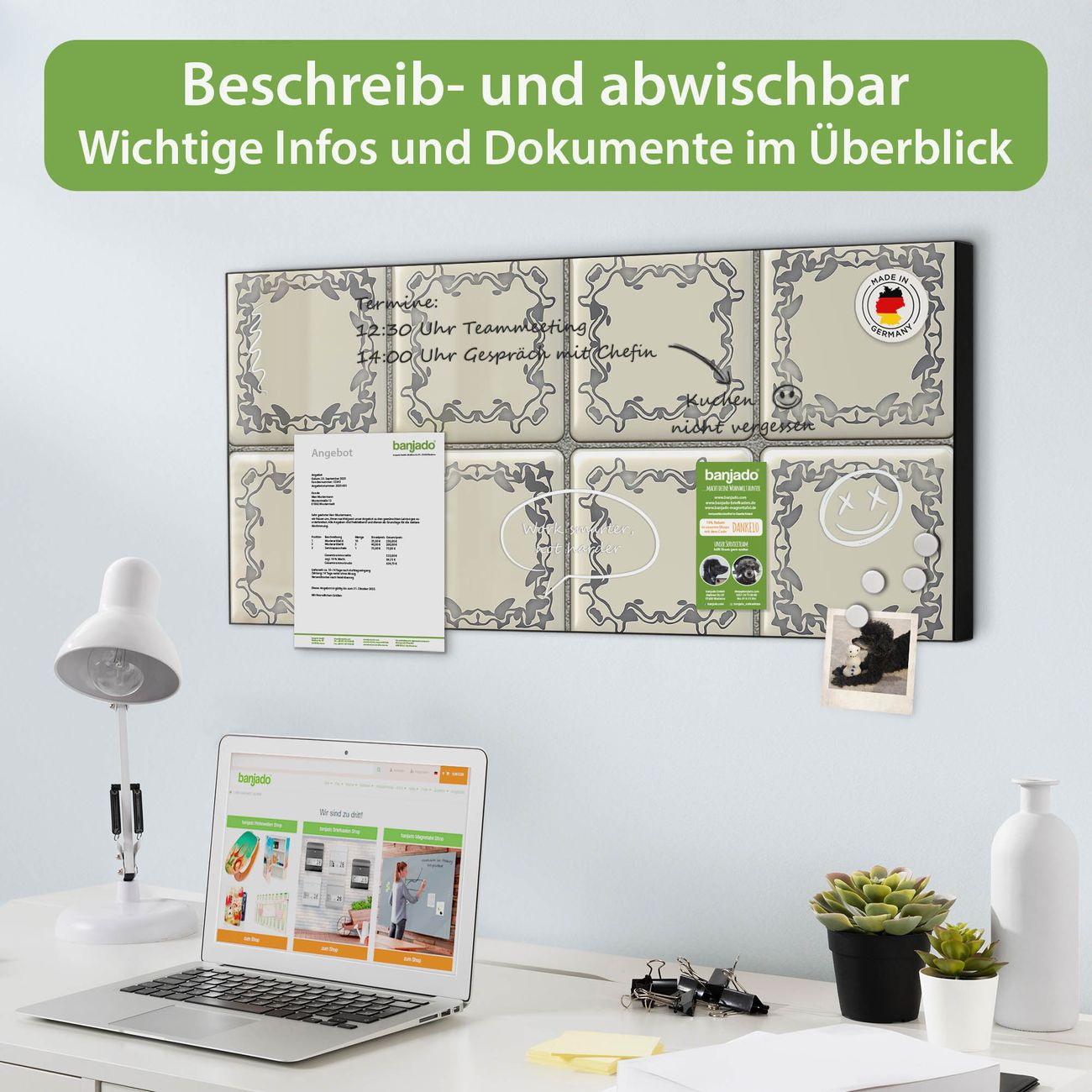 FUNKTION: Die banjado Magnettafel 78x37 cm im Design Motiv Kacheln vereint Funktionalität und modernes Wohndesign auf stilvolle Weise. Diese hochwertige Magnetwand aus Metall hilft Ihnen dabei, Notizen, Fotos, Termine, Einkaufslisten oder Rezepte übersichtlich zu organisieren. Als praktisches Memoboard sorgt sie für Struktur im Alltag und setzt gleichzeitig einen dekorativen Akzent an Ihrer Wand. DESIGN: Die Metalltafel besteht aus robustem, lackiertem Stahl und ist mit allen handelsüblichen Magneten nutzbar. Besonders praktisch ist die beschreibbare Oberfläche. Sie können die Magnettafel ganz einfach mit Kreidestiften beschriften und die Inhalte bei Bedarf mit einem feuchten Tuch wieder entfernen. So eignet sich das Memoboard ideal für Wochenpläne, Menüpläne, To Do Listen oder kreative Botschaften. DETAILS: Mit ihrem großzügigen Querformat von 78x37 cm bietet die Magnettafel ausreichend Platz für Ihre Organisation. Das Motiv Motiv Kacheln bringt eine warme, natürliche Optik in Küche, Flur, Büro oder Homeoffice und wirkt auch ohne Magnete oder Beschriftung wie ein modernes Wandbild. NUTZEN: Auf der Rückseite befinden sich vorgefertigte Löcher für eine schnelle und unkomplizierte Wandmontage. Jede banjado Magnettafel wird in Deutschland gefertigt und steht für Qualität, Langlebigkeit und liebevolle Verarbeitung. Dieses beschreibbare Memoboard ist die perfekte Kombination aus Metalltafel, Designobjekt und praktischer Magnetwand für Ihren Alltag. BANJADO: Wir sind ein kleines Team aus dem Herzen von Sachsen. Wir fertigen alle Artikel von Hand für Sie an, Sie erhalten keine preiswerte Importware. Auf Wunsch können Sie auch Ihr eigenes Foto auf die Magnettafel aufbringen, schreiben Sie uns an. Herzlichst, Ihr banjado-Team