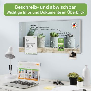 FUNKTION: Die banjado Magnettafel 78x37 cm im Design Motiv Kakteen in Beton vereint Funktionalität und modernes Wohndesign auf stilvolle Weise. Diese hochwertige Magnetwand aus Metall hilft Ihnen dabei, Notizen, Fotos, Termine, Einkaufslisten oder Rezepte übersichtlich zu organisieren. Als praktisches Memoboard sorgt sie für Struktur im Alltag und setzt gleichzeitig einen dekorativen Akzent an Ihrer Wand. DESIGN: Die Metalltafel besteht aus robustem, lackiertem Stahl und ist mit allen handelsüblichen Magneten nutzbar. Besonders praktisch ist die beschreibbare Oberfläche. Sie können die Magnettafel ganz einfach mit Kreidestiften beschriften und die Inhalte bei Bedarf mit einem feuchten Tuch wieder entfernen. So eignet sich das Memoboard ideal für Wochenpläne, Menüpläne, To Do Listen oder kreative Botschaften. DETAILS: Mit ihrem großzügigen Querformat von 78x37 cm bietet die Magnettafel ausreichend Platz für Ihre Organisation. Das Motiv Motiv Kakteen in Beton bringt eine warme, natürliche Optik in Küche, Flur, Büro oder Homeoffice und wirkt auch ohne Magnete oder Beschriftung wie ein modernes Wandbild. NUTZEN: Auf der Rückseite befinden sich vorgefertigte Löcher für eine schnelle und unkomplizierte Wandmontage. Jede banjado Magnettafel wird in Deutschland gefertigt und steht für Qualität, Langlebigkeit und liebevolle Verarbeitung. Dieses beschreibbare Memoboard ist die perfekte Kombination aus Metalltafel, Designobjekt und praktischer Magnetwand für Ihren Alltag. BANJADO: Wir sind ein kleines Team aus dem Herzen von Sachsen. Wir fertigen alle Artikel von Hand für Sie an, Sie erhalten keine preiswerte Importware. Auf Wunsch können Sie auch Ihr eigenes Foto auf die Magnettafel aufbringen, schreiben Sie uns an. Herzlichst, Ihr banjado-Team