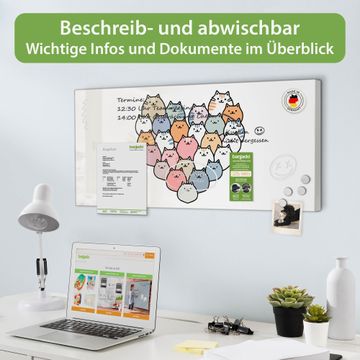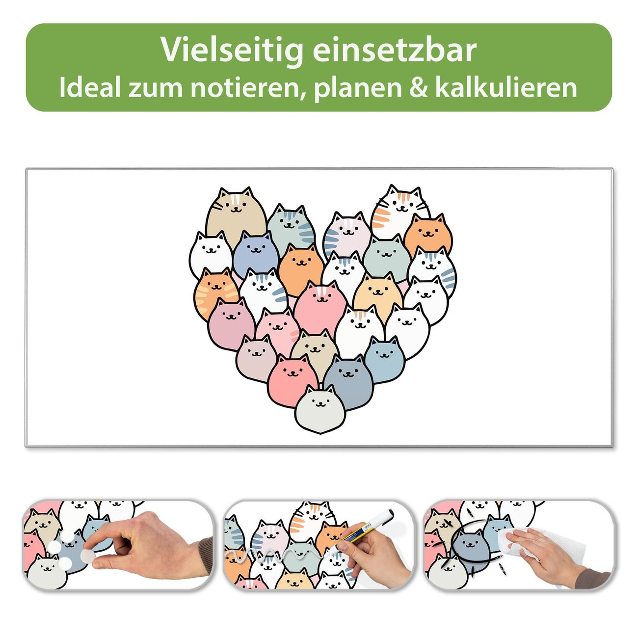FUNKTION: Die banjado Magnettafel 78x37 cm im Design Motiv Katzenherz vereint Funktionalität und modernes Wohndesign auf stilvolle Weise. Diese hochwertige Magnetwand aus Metall hilft Ihnen dabei, Notizen, Fotos, Termine, Einkaufslisten oder Rezepte übersichtlich zu organisieren. Als praktisches Memoboard sorgt sie für Struktur im Alltag und setzt gleichzeitig einen dekorativen Akzent an Ihrer Wand. DESIGN: Die Metalltafel besteht aus robustem, lackiertem Stahl und ist mit allen handelsüblichen Magneten nutzbar. Besonders praktisch ist die beschreibbare Oberfläche. Sie können die Magnettafel ganz einfach mit Kreidestiften beschriften und die Inhalte bei Bedarf mit einem feuchten Tuch wieder entfernen. So eignet sich das Memoboard ideal für Wochenpläne, Menüpläne, To Do Listen oder kreative Botschaften. DETAILS: Mit ihrem großzügigen Querformat von 78x37 cm bietet die Magnettafel ausreichend Platz für Ihre Organisation. Das Motiv Motiv Katzenherz bringt eine warme, natürliche Optik in Küche, Flur, Büro oder Homeoffice und wirkt auch ohne Magnete oder Beschriftung wie ein modernes Wandbild. NUTZEN: Auf der Rückseite befinden sich vorgefertigte Löcher für eine schnelle und unkomplizierte Wandmontage. Jede banjado Magnettafel wird in Deutschland gefertigt und steht für Qualität, Langlebigkeit und liebevolle Verarbeitung. Dieses beschreibbare Memoboard ist die perfekte Kombination aus Metalltafel, Designobjekt und praktischer Magnetwand für Ihren Alltag. BANJADO: Wir sind ein kleines Team aus dem Herzen von Sachsen. Wir fertigen alle Artikel von Hand für Sie an, Sie erhalten keine preiswerte Importware. Auf Wunsch können Sie auch Ihr eigenes Foto auf die Magnettafel aufbringen, schreiben Sie uns an. Herzlichst, Ihr banjado-Team