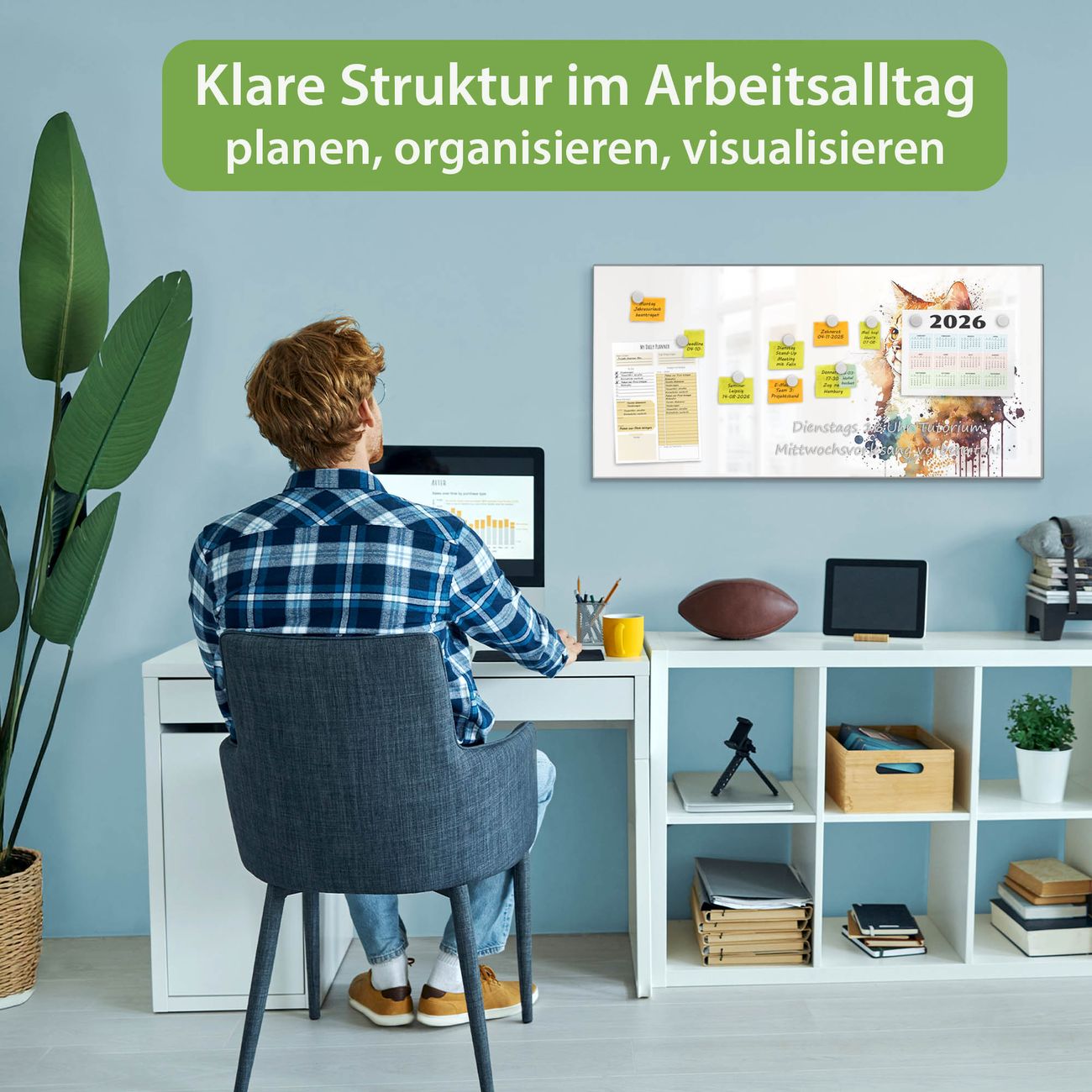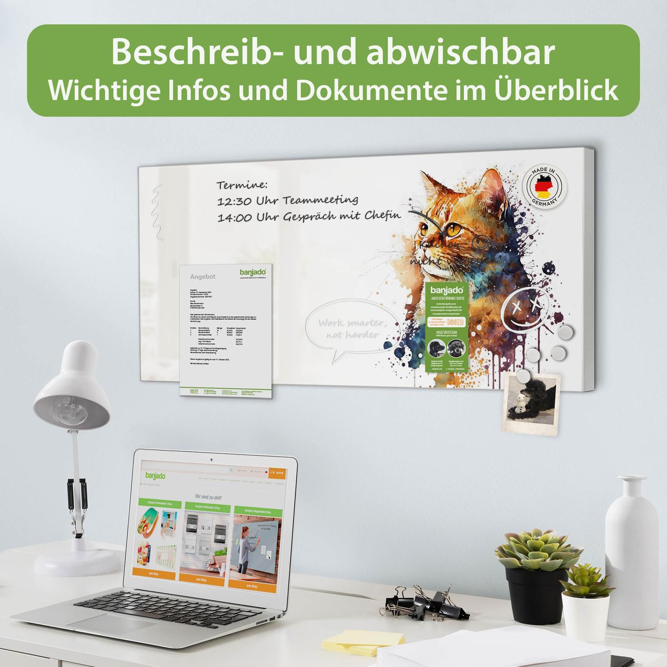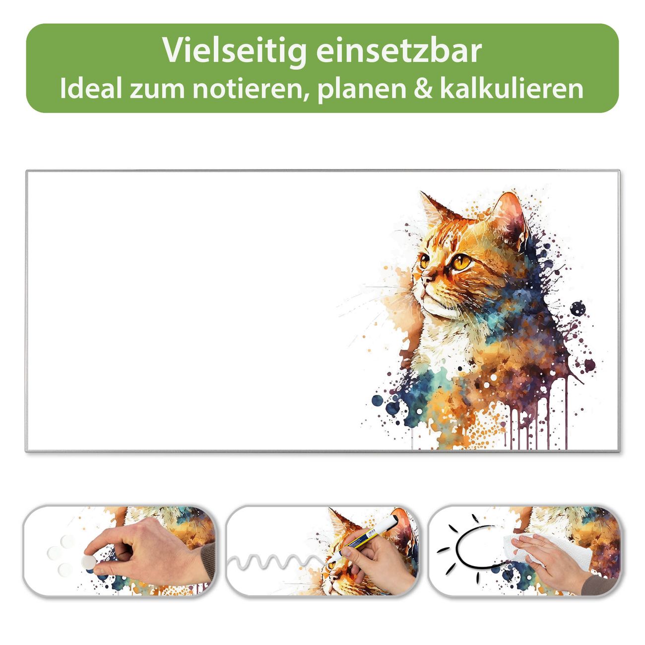FUNKTION: Die banjado Magnettafel 78x37 cm im Design Motiv Katzenportrait in Aquarell 1 vereint Funktionalität und modernes Wohndesign auf stilvolle Weise. Diese hochwertige Magnetwand aus Metall hilft Ihnen dabei, Notizen, Fotos, Termine, Einkaufslisten oder Rezepte übersichtlich zu organisieren. Als praktisches Memoboard sorgt sie für Struktur im Alltag und setzt gleichzeitig einen dekorativen Akzent an Ihrer Wand. DESIGN: Die Metalltafel besteht aus robustem, lackiertem Stahl und ist mit allen handelsüblichen Magneten nutzbar. Besonders praktisch ist die beschreibbare Oberfläche. Sie können die Magnettafel ganz einfach mit Kreidestiften beschriften und die Inhalte bei Bedarf mit einem feuchten Tuch wieder entfernen. So eignet sich das Memoboard ideal für Wochenpläne, Menüpläne, To Do Listen oder kreative Botschaften. DETAILS: Mit ihrem großzügigen Querformat von 78x37 cm bietet die Magnettafel ausreichend Platz für Ihre Organisation. Das Motiv Motiv Katzenportrait in Aquarell 1 bringt eine warme, natürliche Optik in Küche, Flur, Büro oder Homeoffice und wirkt auch ohne Magnete oder Beschriftung wie ein modernes Wandbild. NUTZEN: Auf der Rückseite befinden sich vorgefertigte Löcher für eine schnelle und unkomplizierte Wandmontage. Jede banjado Magnettafel wird in Deutschland gefertigt und steht für Qualität, Langlebigkeit und liebevolle Verarbeitung. Dieses beschreibbare Memoboard ist die perfekte Kombination aus Metalltafel, Designobjekt und praktischer Magnetwand für Ihren Alltag. BANJADO: Wir sind ein kleines Team aus dem Herzen von Sachsen. Wir fertigen alle Artikel von Hand für Sie an, Sie erhalten keine preiswerte Importware. Auf Wunsch können Sie auch Ihr eigenes Foto auf die Magnettafel aufbringen, schreiben Sie uns an. Herzlichst, Ihr banjado-Team