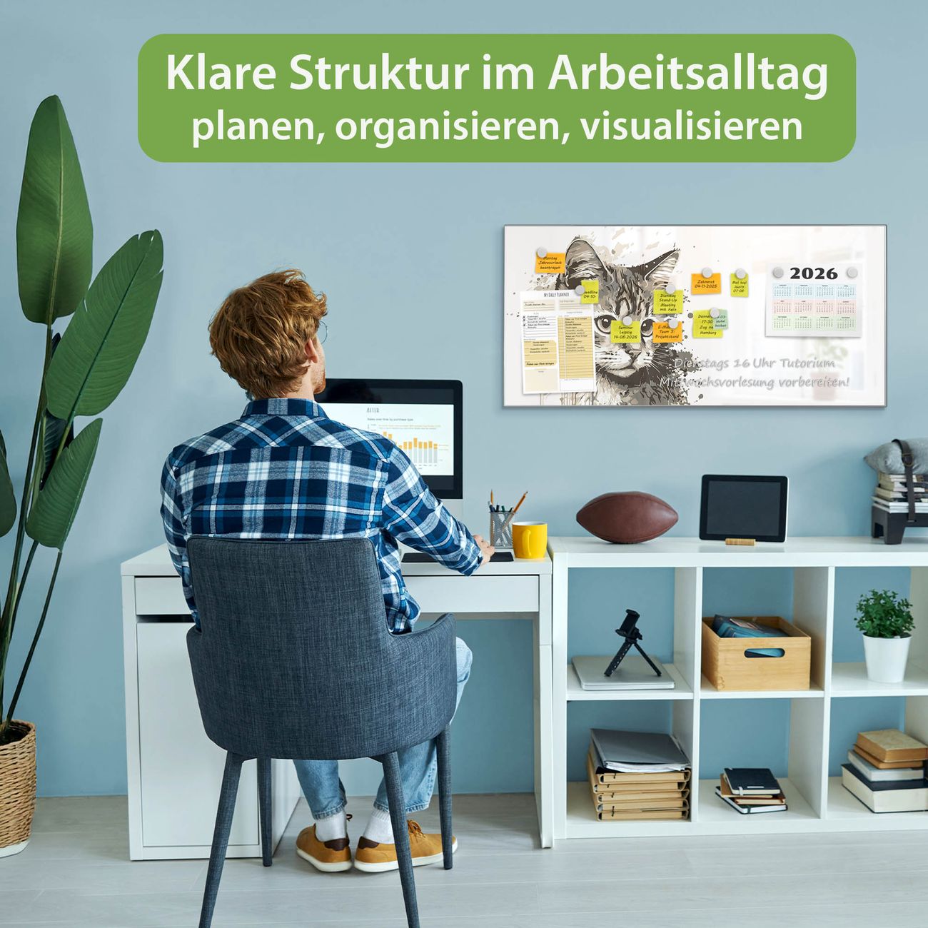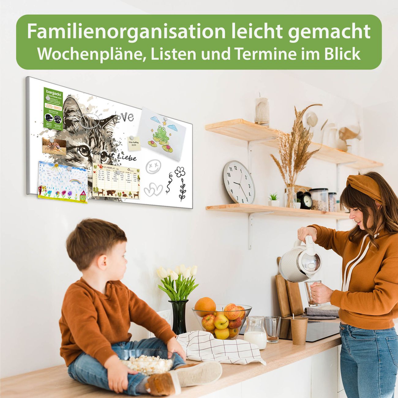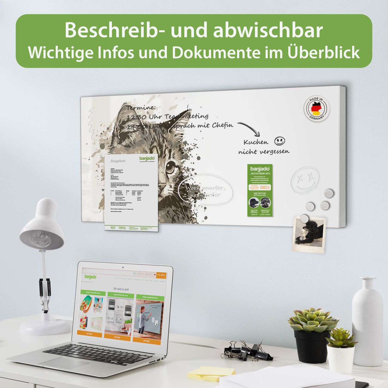 FUNKTION: Die banjado Magnettafel 78x37 cm im Design Motiv Katzenportrait in Aquarell 3 vereint Funktionalität und modernes Wohndesign auf stilvolle Weise. Diese hochwertige Magnetwand aus Metall hilft Ihnen dabei, Notizen, Fotos, Termine, Einkaufslisten oder Rezepte übersichtlich zu organisieren. Als praktisches Memoboard sorgt sie für Struktur im Alltag und setzt gleichzeitig einen dekorativen Akzent an Ihrer Wand. DESIGN: Die Metalltafel besteht aus robustem, lackiertem Stahl und ist mit allen handelsüblichen Magneten nutzbar. Besonders praktisch ist die beschreibbare Oberfläche. Sie können die Magnettafel ganz einfach mit Kreidestiften beschriften und die Inhalte bei Bedarf mit einem feuchten Tuch wieder entfernen. So eignet sich das Memoboard ideal für Wochenpläne, Menüpläne, To Do Listen oder kreative Botschaften. DETAILS: Mit ihrem großzügigen Querformat von 78x37 cm bietet die Magnettafel ausreichend Platz für Ihre Organisation. Das Motiv Motiv Katzenportrait in Aquarell 3 bringt eine warme, natürliche Optik in Küche, Flur, Büro oder Homeoffice und wirkt auch ohne Magnete oder Beschriftung wie ein modernes Wandbild. NUTZEN: Auf der Rückseite befinden sich vorgefertigte Löcher für eine schnelle und unkomplizierte Wandmontage. Jede banjado Magnettafel wird in Deutschland gefertigt und steht für Qualität, Langlebigkeit und liebevolle Verarbeitung. Dieses beschreibbare Memoboard ist die perfekte Kombination aus Metalltafel, Designobjekt und praktischer Magnetwand für Ihren Alltag. BANJADO: Wir sind ein kleines Team aus dem Herzen von Sachsen. Wir fertigen alle Artikel von Hand für Sie an, Sie erhalten keine preiswerte Importware. Auf Wunsch können Sie auch Ihr eigenes Foto auf die Magnettafel aufbringen, schreiben Sie uns an. Herzlichst, Ihr banjado-Team