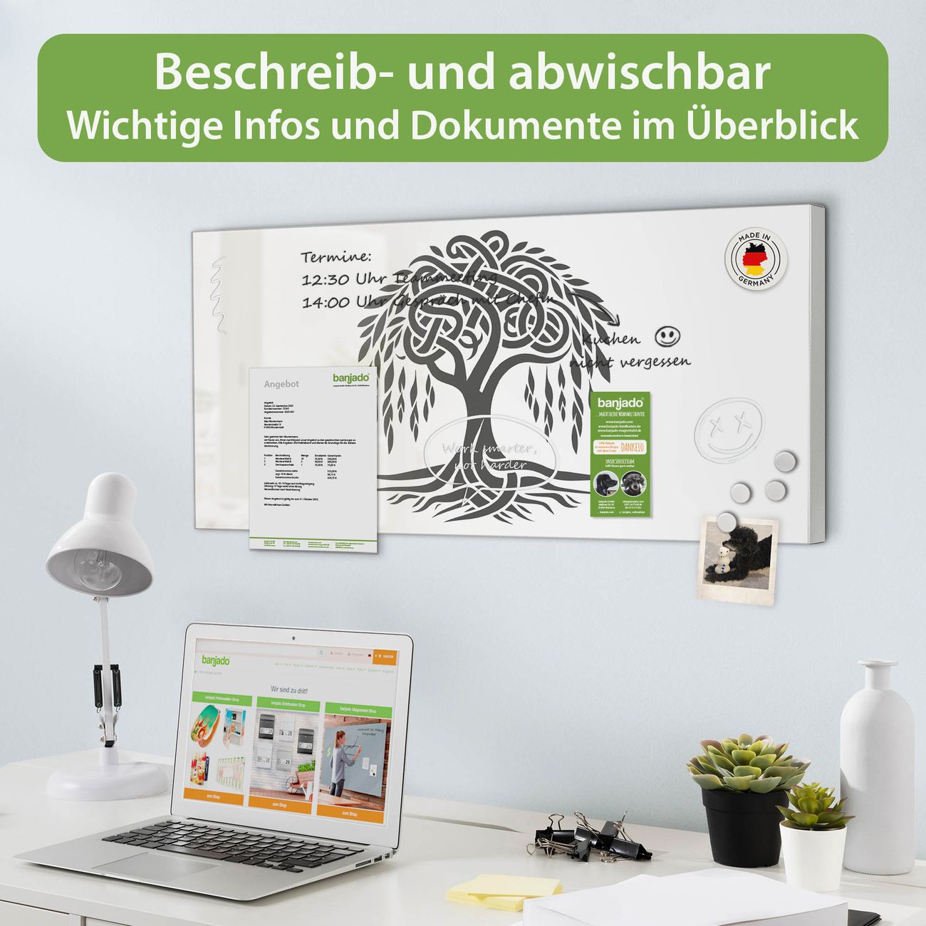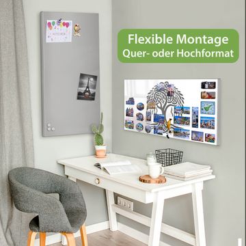 FUNKTION: Die banjado Magnettafel 78x37 cm im Design Motiv Keltischer Baum des Lebens vereint Funktionalität und modernes Wohndesign auf stilvolle Weise. Diese hochwertige Magnetwand aus Metall hilft Ihnen dabei, Notizen, Fotos, Termine, Einkaufslisten oder Rezepte übersichtlich zu organisieren. Als praktisches Memoboard sorgt sie für Struktur im Alltag und setzt gleichzeitig einen dekorativen Akzent an Ihrer Wand. DESIGN: Die Metalltafel besteht aus robustem, lackiertem Stahl und ist mit allen handelsüblichen Magneten nutzbar. Besonders praktisch ist die beschreibbare Oberfläche. Sie können die Magnettafel ganz einfach mit Kreidestiften beschriften und die Inhalte bei Bedarf mit einem feuchten Tuch wieder entfernen. So eignet sich das Memoboard ideal für Wochenpläne, Menüpläne, To Do Listen oder kreative Botschaften. DETAILS: Mit ihrem großzügigen Querformat von 78x37 cm bietet die Magnettafel ausreichend Platz für Ihre Organisation. Das Motiv Motiv Keltischer Baum des Lebens bringt eine warme, natürliche Optik in Küche, Flur, Büro oder Homeoffice und wirkt auch ohne Magnete oder Beschriftung wie ein modernes Wandbild. NUTZEN: Auf der Rückseite befinden sich vorgefertigte Löcher für eine schnelle und unkomplizierte Wandmontage. Jede banjado Magnettafel wird in Deutschland gefertigt und steht für Qualität, Langlebigkeit und liebevolle Verarbeitung. Dieses beschreibbare Memoboard ist die perfekte Kombination aus Metalltafel, Designobjekt und praktischer Magnetwand für Ihren Alltag. BANJADO: Wir sind ein kleines Team aus dem Herzen von Sachsen. Wir fertigen alle Artikel von Hand für Sie an, Sie erhalten keine preiswerte Importware. Auf Wunsch können Sie auch Ihr eigenes Foto auf die Magnettafel aufbringen, schreiben Sie uns an. Herzlichst, Ihr banjado-Team