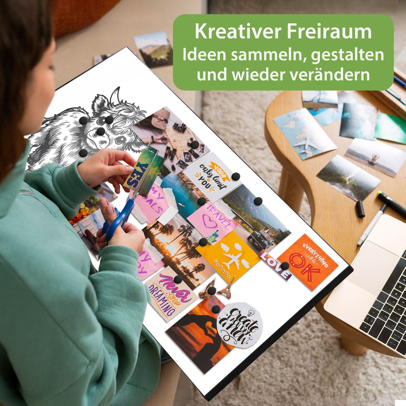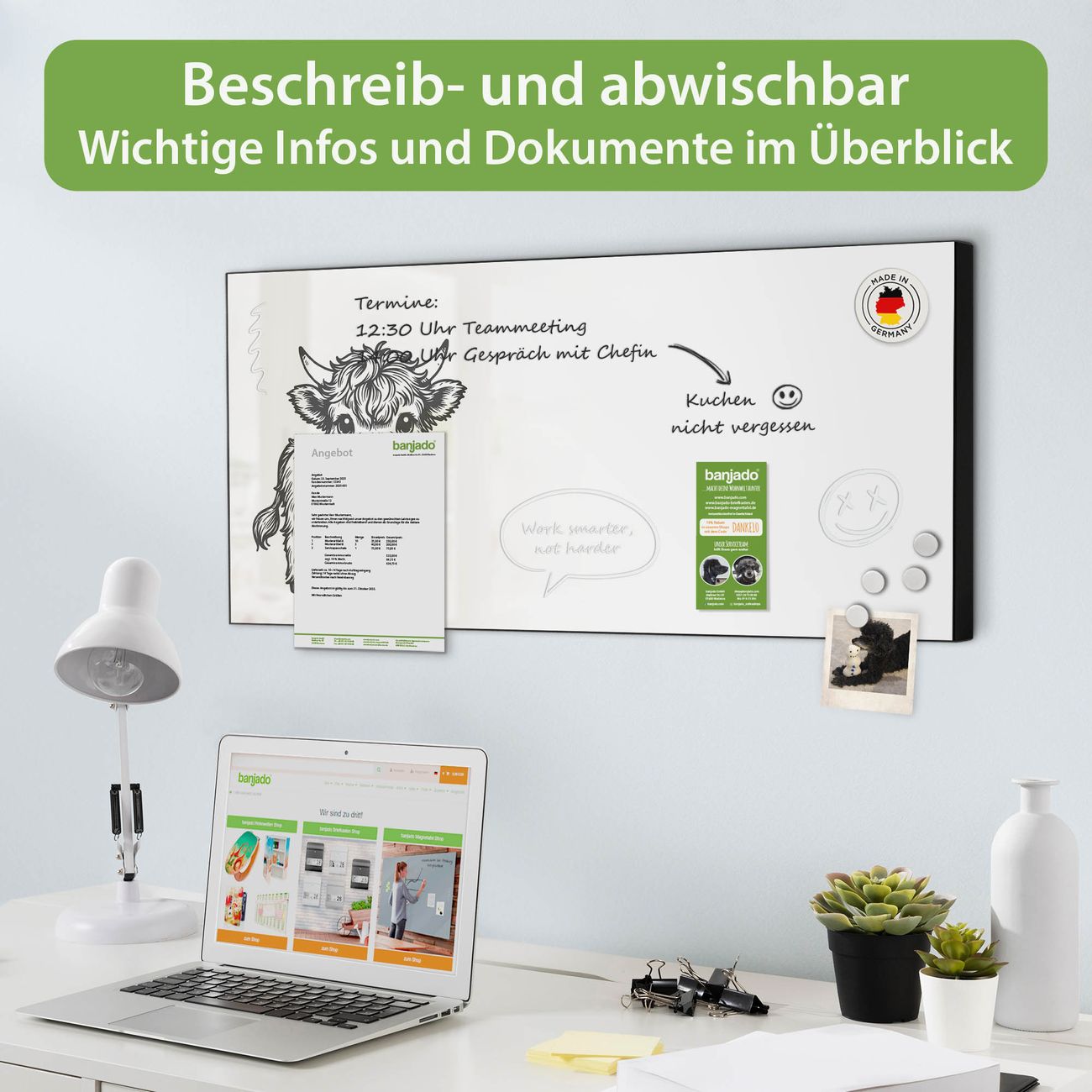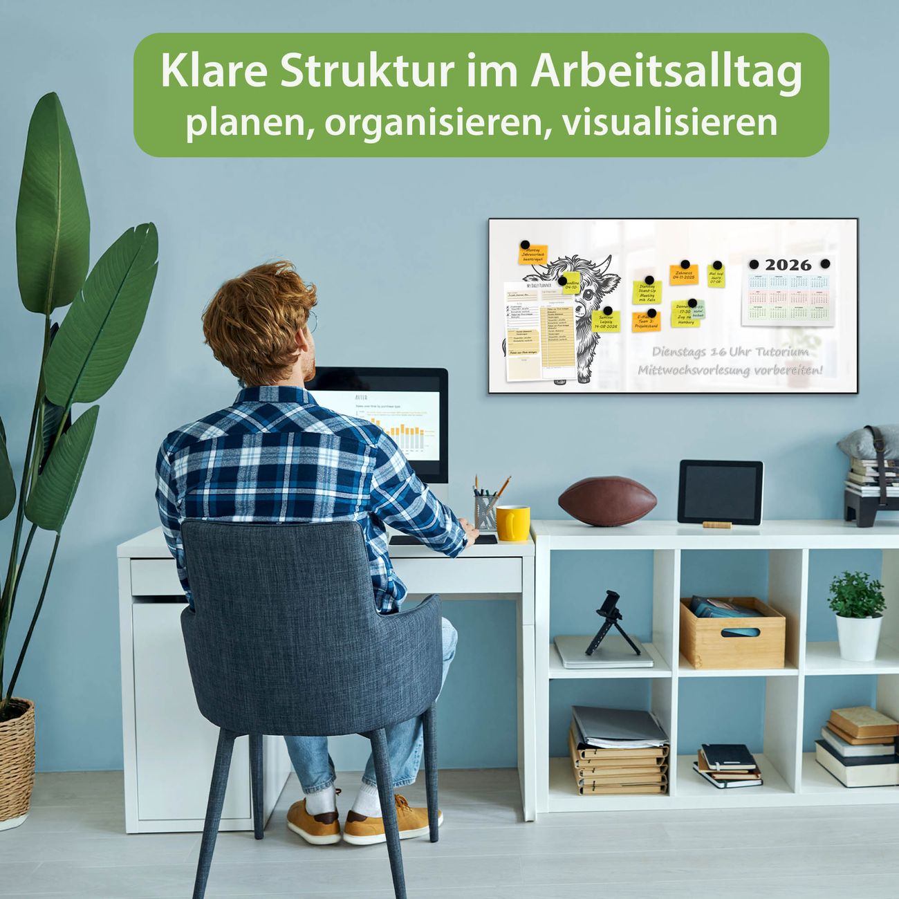 FUNKTION: Die banjado Magnettafel 78x37 cm im Design Motiv Kleines Hochlandrind Zeichnung vereint Funktionalität und modernes Wohndesign auf stilvolle Weise. Diese hochwertige Magnetwand aus Metall hilft Ihnen dabei, Notizen, Fotos, Termine, Einkaufslisten oder Rezepte übersichtlich zu organisieren. Als praktisches Memoboard sorgt sie für Struktur im Alltag und setzt gleichzeitig einen dekorativen Akzent an Ihrer Wand. DESIGN: Die Metalltafel besteht aus robustem, lackiertem Stahl und ist mit allen handelsüblichen Magneten nutzbar. Besonders praktisch ist die beschreibbare Oberfläche. Sie können die Magnettafel ganz einfach mit Kreidestiften beschriften und die Inhalte bei Bedarf mit einem feuchten Tuch wieder entfernen. So eignet sich das Memoboard ideal für Wochenpläne, Menüpläne, To Do Listen oder kreative Botschaften. DETAILS: Mit ihrem großzügigen Querformat von 78x37 cm bietet die Magnettafel ausreichend Platz für Ihre Organisation. Das Motiv Motiv Kleines Hochlandrind Zeichnung bringt eine warme, natürliche Optik in Küche, Flur, Büro oder Homeoffice und wirkt auch ohne Magnete oder Beschriftung wie ein modernes Wandbild. NUTZEN: Auf der Rückseite befinden sich vorgefertigte Löcher für eine schnelle und unkomplizierte Wandmontage. Jede banjado Magnettafel wird in Deutschland gefertigt und steht für Qualität, Langlebigkeit und liebevolle Verarbeitung. Dieses beschreibbare Memoboard ist die perfekte Kombination aus Metalltafel, Designobjekt und praktischer Magnetwand für Ihren Alltag. BANJADO: Wir sind ein kleines Team aus dem Herzen von Sachsen. Wir fertigen alle Artikel von Hand für Sie an, Sie erhalten keine preiswerte Importware. Auf Wunsch können Sie auch Ihr eigenes Foto auf die Magnettafel aufbringen, schreiben Sie uns an. Herzlichst, Ihr banjado-Team