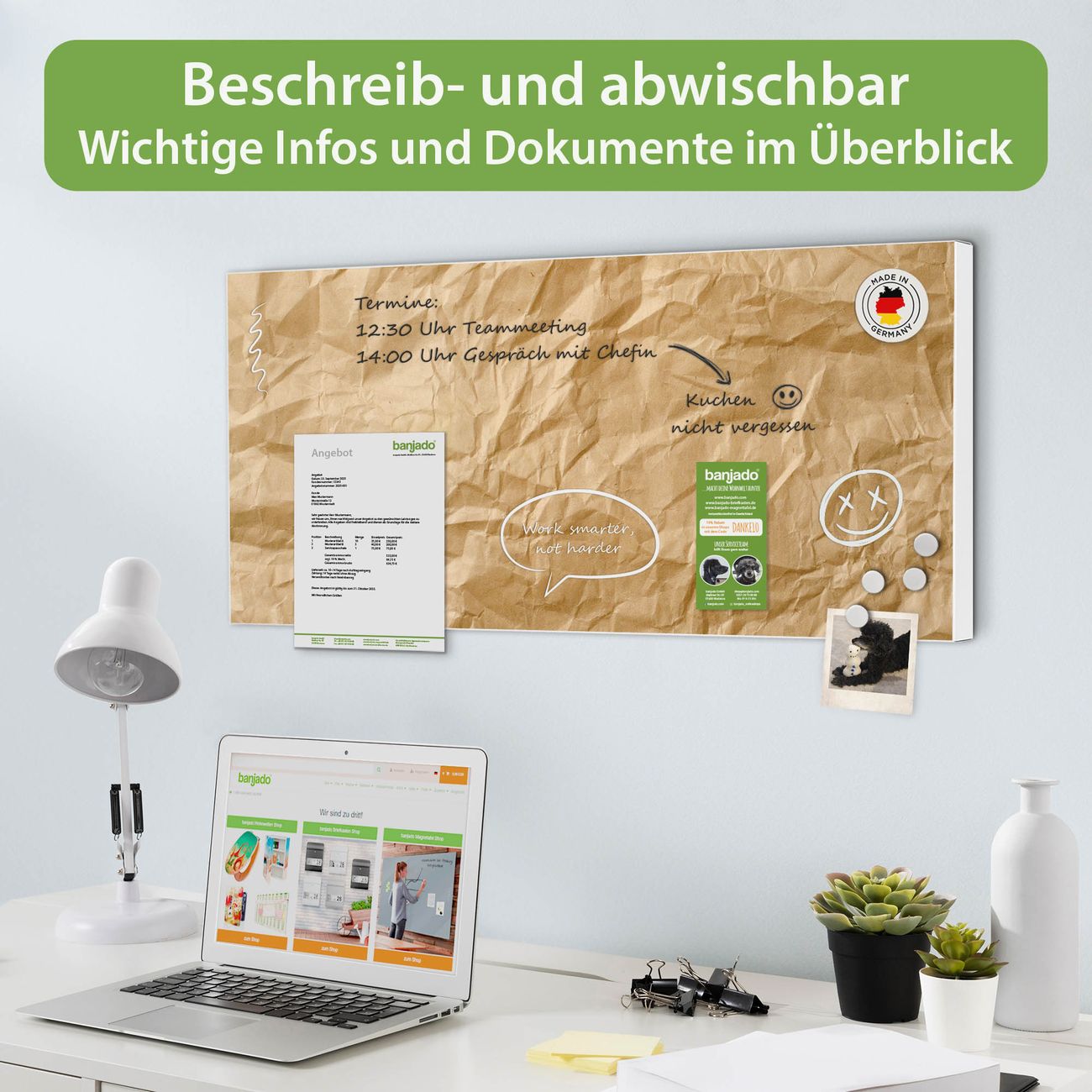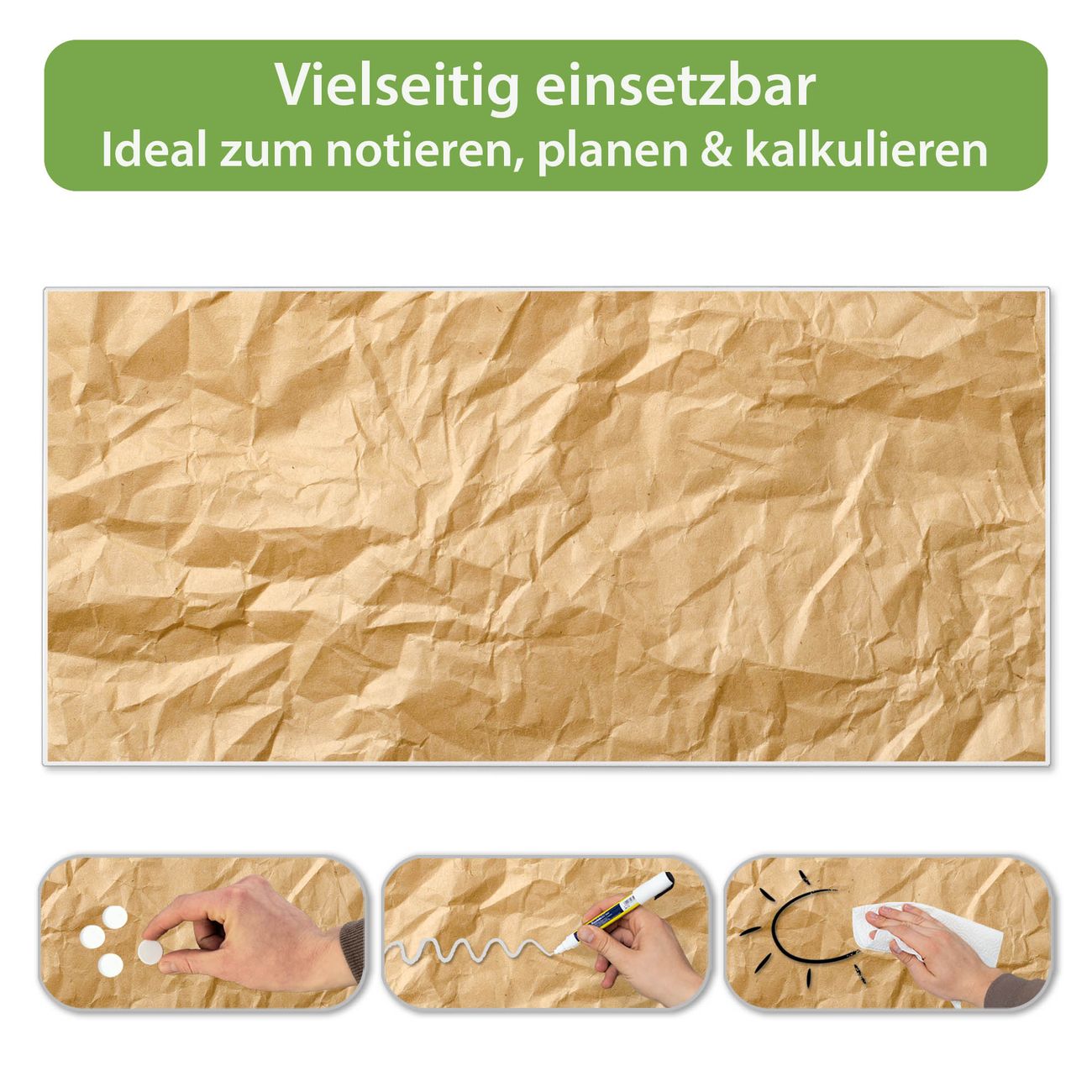 FUNKTION: Die banjado Magnettafel 78x37 cm im Design Motiv Knüllpapier vereint Funktionalität und modernes Wohndesign auf stilvolle Weise. Diese hochwertige Magnetwand aus Metall hilft Ihnen dabei, Notizen, Fotos, Termine, Einkaufslisten oder Rezepte übersichtlich zu organisieren. Als praktisches Memoboard sorgt sie für Struktur im Alltag und setzt gleichzeitig einen dekorativen Akzent an Ihrer Wand. DESIGN: Die Metalltafel besteht aus robustem, lackiertem Stahl und ist mit allen handelsüblichen Magneten nutzbar. Besonders praktisch ist die beschreibbare Oberfläche. Sie können die Magnettafel ganz einfach mit Kreidestiften beschriften und die Inhalte bei Bedarf mit einem feuchten Tuch wieder entfernen. So eignet sich das Memoboard ideal für Wochenpläne, Menüpläne, To Do Listen oder kreative Botschaften. DETAILS: Mit ihrem großzügigen Querformat von 78x37 cm bietet die Magnettafel ausreichend Platz für Ihre Organisation. Das Motiv Motiv Knüllpapier bringt eine warme, natürliche Optik in Küche, Flur, Büro oder Homeoffice und wirkt auch ohne Magnete oder Beschriftung wie ein modernes Wandbild. NUTZEN: Auf der Rückseite befinden sich vorgefertigte Löcher für eine schnelle und unkomplizierte Wandmontage. Jede banjado Magnettafel wird in Deutschland gefertigt und steht für Qualität, Langlebigkeit und liebevolle Verarbeitung. Dieses beschreibbare Memoboard ist die perfekte Kombination aus Metalltafel, Designobjekt und praktischer Magnetwand für Ihren Alltag. BANJADO: Wir sind ein kleines Team aus dem Herzen von Sachsen. Wir fertigen alle Artikel von Hand für Sie an, Sie erhalten keine preiswerte Importware. Auf Wunsch können Sie auch Ihr eigenes Foto auf die Magnettafel aufbringen, schreiben Sie uns an. Herzlichst, Ihr banjado-Team