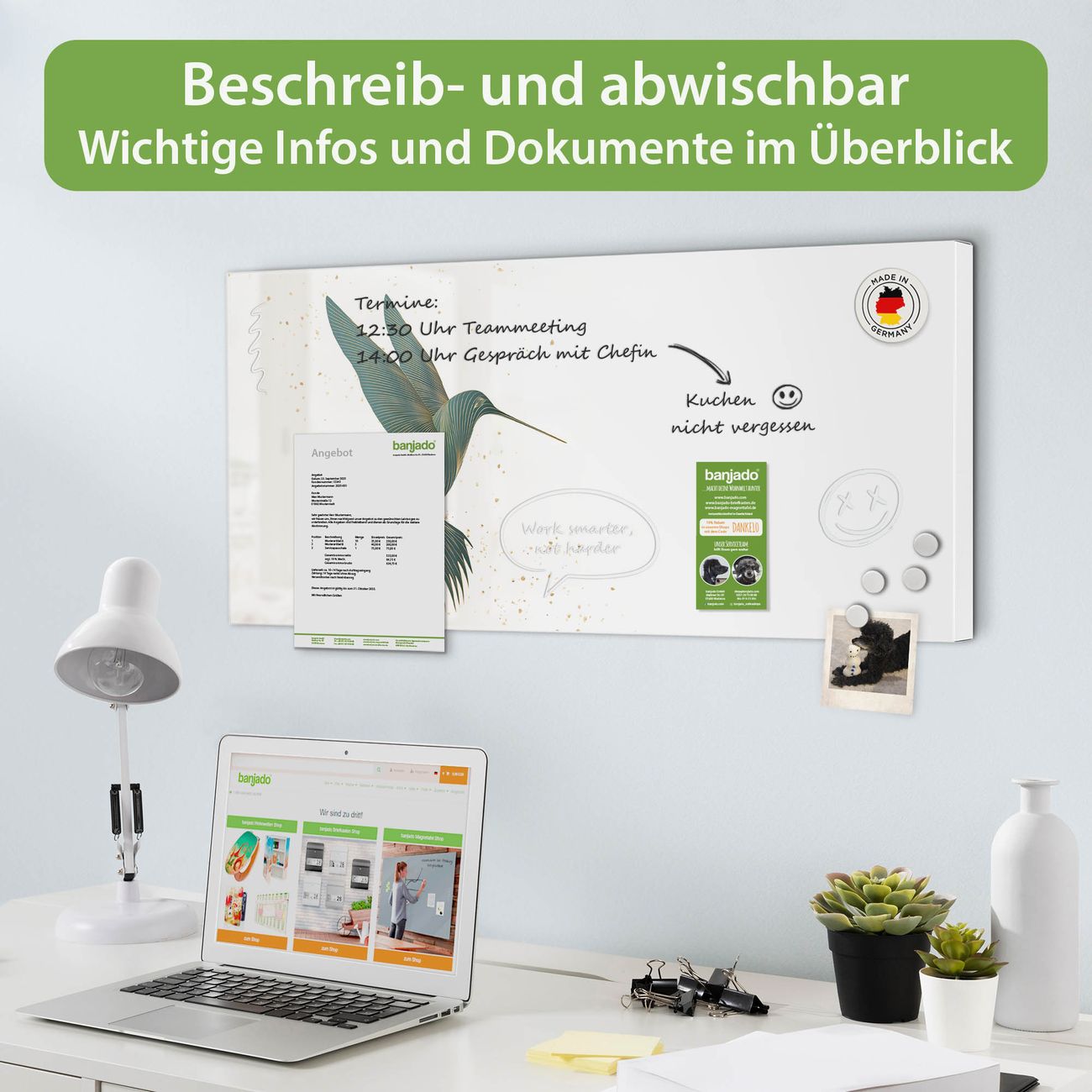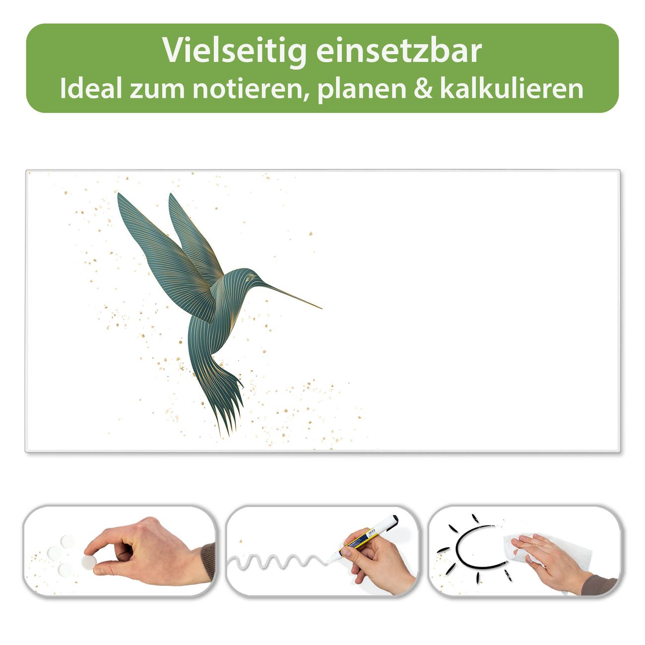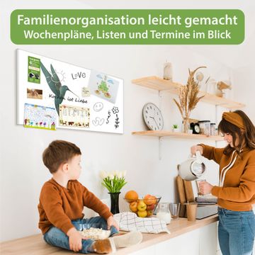 FUNKTION: Die banjado Magnettafel 78x37 cm im Design Motiv Kolibri 5 vereint Funktionalität und modernes Wohndesign auf stilvolle Weise. Diese hochwertige Magnetwand aus Metall hilft Ihnen dabei, Notizen, Fotos, Termine, Einkaufslisten oder Rezepte übersichtlich zu organisieren. Als praktisches Memoboard sorgt sie für Struktur im Alltag und setzt gleichzeitig einen dekorativen Akzent an Ihrer Wand. DESIGN: Die Metalltafel besteht aus robustem, lackiertem Stahl und ist mit allen handelsüblichen Magneten nutzbar. Besonders praktisch ist die beschreibbare Oberfläche. Sie können die Magnettafel ganz einfach mit Kreidestiften beschriften und die Inhalte bei Bedarf mit einem feuchten Tuch wieder entfernen. So eignet sich das Memoboard ideal für Wochenpläne, Menüpläne, To Do Listen oder kreative Botschaften. DETAILS: Mit ihrem großzügigen Querformat von 78x37 cm bietet die Magnettafel ausreichend Platz für Ihre Organisation. Das Motiv Motiv Kolibri 5 bringt eine warme, natürliche Optik in Küche, Flur, Büro oder Homeoffice und wirkt auch ohne Magnete oder Beschriftung wie ein modernes Wandbild. NUTZEN: Auf der Rückseite befinden sich vorgefertigte Löcher für eine schnelle und unkomplizierte Wandmontage. Jede banjado Magnettafel wird in Deutschland gefertigt und steht für Qualität, Langlebigkeit und liebevolle Verarbeitung. Dieses beschreibbare Memoboard ist die perfekte Kombination aus Metalltafel, Designobjekt und praktischer Magnetwand für Ihren Alltag. BANJADO: Wir sind ein kleines Team aus dem Herzen von Sachsen. Wir fertigen alle Artikel von Hand für Sie an, Sie erhalten keine preiswerte Importware. Auf Wunsch können Sie auch Ihr eigenes Foto auf die Magnettafel aufbringen, schreiben Sie uns an. Herzlichst, Ihr banjado-Team