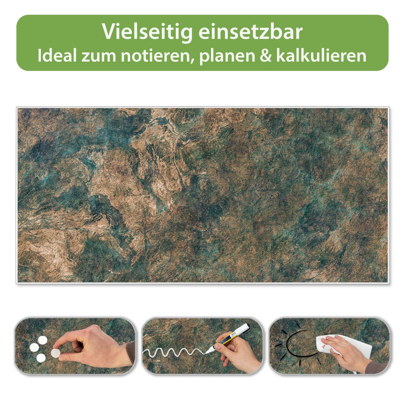 FUNKTION: Die banjado Magnettafel 78x37 cm im Design Motiv Kupfer Patina vereint Funktionalität und modernes Wohndesign auf stilvolle Weise. Diese hochwertige Magnetwand aus Metall hilft Ihnen dabei, Notizen, Fotos, Termine, Einkaufslisten oder Rezepte übersichtlich zu organisieren. Als praktisches Memoboard sorgt sie für Struktur im Alltag und setzt gleichzeitig einen dekorativen Akzent an Ihrer Wand. DESIGN: Die Metalltafel besteht aus robustem, lackiertem Stahl und ist mit allen handelsüblichen Magneten nutzbar. Besonders praktisch ist die beschreibbare Oberfläche. Sie können die Magnettafel ganz einfach mit Kreidestiften beschriften und die Inhalte bei Bedarf mit einem feuchten Tuch wieder entfernen. So eignet sich das Memoboard ideal für Wochenpläne, Menüpläne, To Do Listen oder kreative Botschaften. DETAILS: Mit ihrem großzügigen Querformat von 78x37 cm bietet die Magnettafel ausreichend Platz für Ihre Organisation. Das Motiv Motiv Kupfer Patina bringt eine warme, natürliche Optik in Küche, Flur, Büro oder Homeoffice und wirkt auch ohne Magnete oder Beschriftung wie ein modernes Wandbild. NUTZEN: Auf der Rückseite befinden sich vorgefertigte Löcher für eine schnelle und unkomplizierte Wandmontage. Jede banjado Magnettafel wird in Deutschland gefertigt und steht für Qualität, Langlebigkeit und liebevolle Verarbeitung. Dieses beschreibbare Memoboard ist die perfekte Kombination aus Metalltafel, Designobjekt und praktischer Magnetwand für Ihren Alltag. BANJADO: Wir sind ein kleines Team aus dem Herzen von Sachsen. Wir fertigen alle Artikel von Hand für Sie an, Sie erhalten keine preiswerte Importware. Auf Wunsch können Sie auch Ihr eigenes Foto auf die Magnettafel aufbringen, schreiben Sie uns an. Herzlichst, Ihr banjado-Team