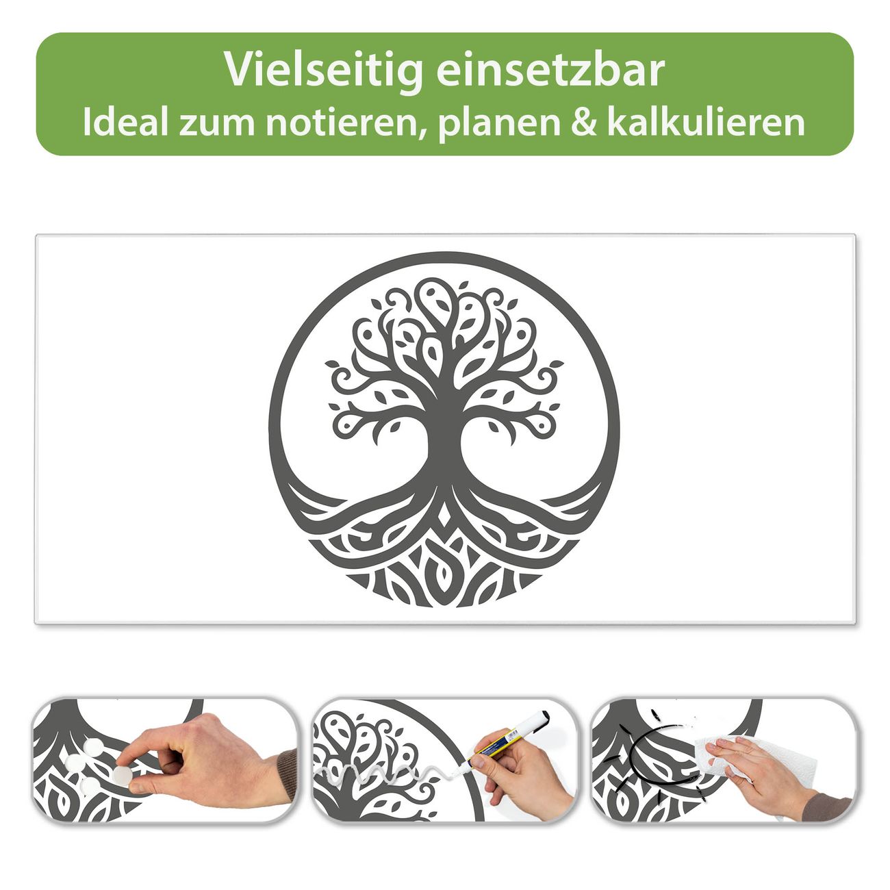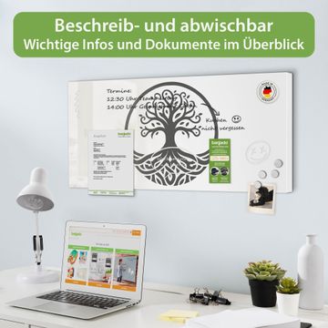 FUNKTION: Die banjado Magnettafel 78x37 cm im Design Motiv Lebensbaum Silhouette 2 vereint Funktionalität und modernes Wohndesign auf stilvolle Weise. Diese hochwertige Magnetwand aus Metall hilft Ihnen dabei, Notizen, Fotos, Termine, Einkaufslisten oder Rezepte übersichtlich zu organisieren. Als praktisches Memoboard sorgt sie für Struktur im Alltag und setzt gleichzeitig einen dekorativen Akzent an Ihrer Wand. DESIGN: Die Metalltafel besteht aus robustem, lackiertem Stahl und ist mit allen handelsüblichen Magneten nutzbar. Besonders praktisch ist die beschreibbare Oberfläche. Sie können die Magnettafel ganz einfach mit Kreidestiften beschriften und die Inhalte bei Bedarf mit einem feuchten Tuch wieder entfernen. So eignet sich das Memoboard ideal für Wochenpläne, Menüpläne, To Do Listen oder kreative Botschaften. DETAILS: Mit ihrem großzügigen Querformat von 78x37 cm bietet die Magnettafel ausreichend Platz für Ihre Organisation. Das Motiv Motiv Lebensbaum Silhouette 2 bringt eine warme, natürliche Optik in Küche, Flur, Büro oder Homeoffice und wirkt auch ohne Magnete oder Beschriftung wie ein modernes Wandbild. NUTZEN: Auf der Rückseite befinden sich vorgefertigte Löcher für eine schnelle und unkomplizierte Wandmontage. Jede banjado Magnettafel wird in Deutschland gefertigt und steht für Qualität, Langlebigkeit und liebevolle Verarbeitung. Dieses beschreibbare Memoboard ist die perfekte Kombination aus Metalltafel, Designobjekt und praktischer Magnetwand für Ihren Alltag. BANJADO: Wir sind ein kleines Team aus dem Herzen von Sachsen. Wir fertigen alle Artikel von Hand für Sie an, Sie erhalten keine preiswerte Importware. Auf Wunsch können Sie auch Ihr eigenes Foto auf die Magnettafel aufbringen, schreiben Sie uns an. Herzlichst, Ihr banjado-Team