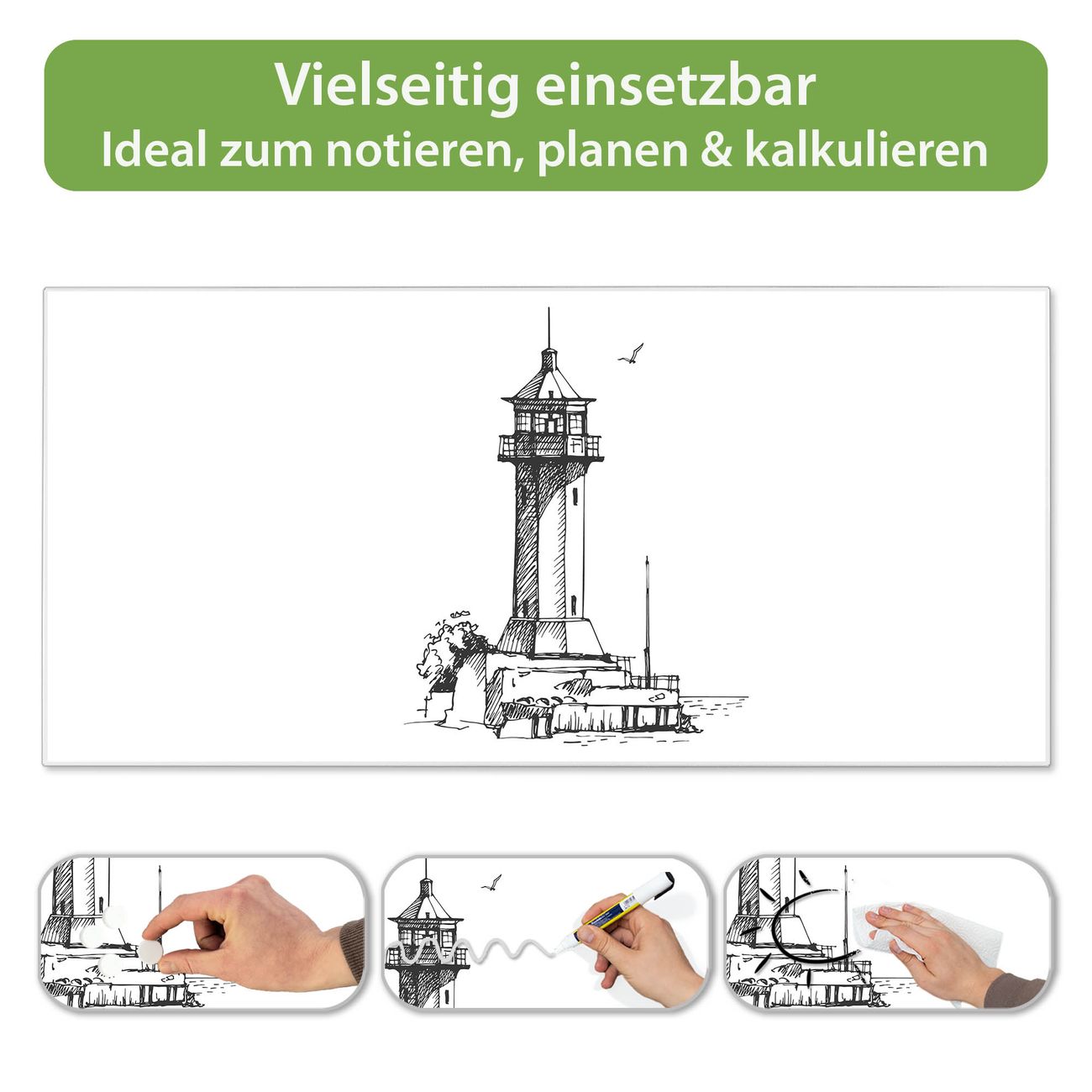 FUNKTION: Die banjado Magnettafel 78x37 cm im Design Motiv Leuchtturm 10 vereint Funktionalität und modernes Wohndesign auf stilvolle Weise. Diese hochwertige Magnetwand aus Metall hilft Ihnen dabei, Notizen, Fotos, Termine, Einkaufslisten oder Rezepte übersichtlich zu organisieren. Als praktisches Memoboard sorgt sie für Struktur im Alltag und setzt gleichzeitig einen dekorativen Akzent an Ihrer Wand. DESIGN: Die Metalltafel besteht aus robustem, lackiertem Stahl und ist mit allen handelsüblichen Magneten nutzbar. Besonders praktisch ist die beschreibbare Oberfläche. Sie können die Magnettafel ganz einfach mit Kreidestiften beschriften und die Inhalte bei Bedarf mit einem feuchten Tuch wieder entfernen. So eignet sich das Memoboard ideal für Wochenpläne, Menüpläne, To Do Listen oder kreative Botschaften. DETAILS: Mit ihrem großzügigen Querformat von 78x37 cm bietet die Magnettafel ausreichend Platz für Ihre Organisation. Das Motiv Motiv Leuchtturm 10 bringt eine warme, natürliche Optik in Küche, Flur, Büro oder Homeoffice und wirkt auch ohne Magnete oder Beschriftung wie ein modernes Wandbild. NUTZEN: Auf der Rückseite befinden sich vorgefertigte Löcher für eine schnelle und unkomplizierte Wandmontage. Jede banjado Magnettafel wird in Deutschland gefertigt und steht für Qualität, Langlebigkeit und liebevolle Verarbeitung. Dieses beschreibbare Memoboard ist die perfekte Kombination aus Metalltafel, Designobjekt und praktischer Magnetwand für Ihren Alltag. BANJADO: Wir sind ein kleines Team aus dem Herzen von Sachsen. Wir fertigen alle Artikel von Hand für Sie an, Sie erhalten keine preiswerte Importware. Auf Wunsch können Sie auch Ihr eigenes Foto auf die Magnettafel aufbringen, schreiben Sie uns an. Herzlichst, Ihr banjado-Team