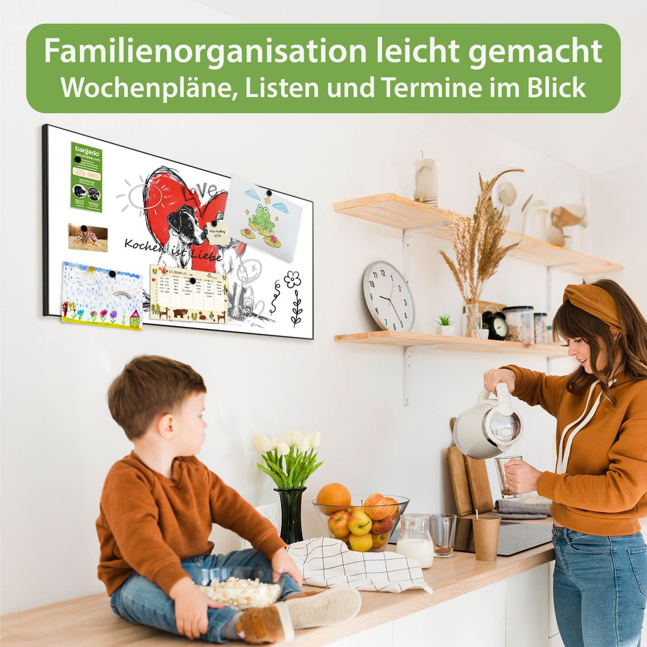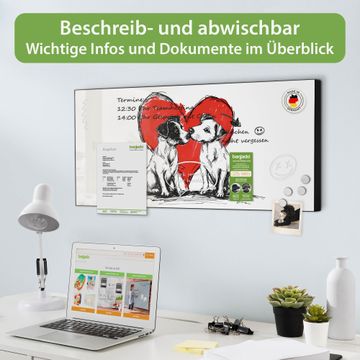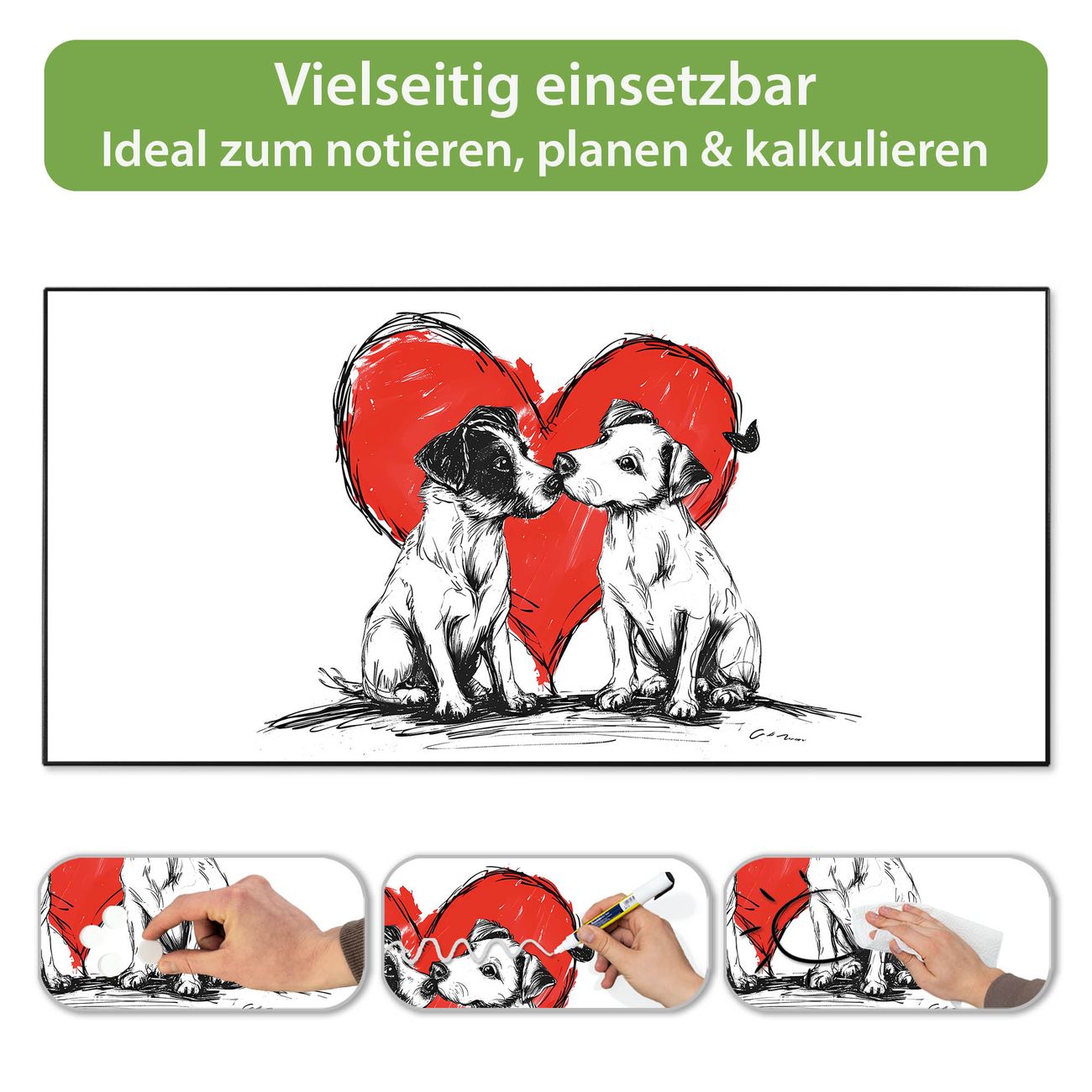 FUNKTION: Die banjado Magnettafel 78x37 cm im Design Motiv Liebende Hunde vereint Funktionalität und modernes Wohndesign auf stilvolle Weise. Diese hochwertige Magnetwand aus Metall hilft Ihnen dabei, Notizen, Fotos, Termine, Einkaufslisten oder Rezepte übersichtlich zu organisieren. Als praktisches Memoboard sorgt sie für Struktur im Alltag und setzt gleichzeitig einen dekorativen Akzent an Ihrer Wand. DESIGN: Die Metalltafel besteht aus robustem, lackiertem Stahl und ist mit allen handelsüblichen Magneten nutzbar. Besonders praktisch ist die beschreibbare Oberfläche. Sie können die Magnettafel ganz einfach mit Kreidestiften beschriften und die Inhalte bei Bedarf mit einem feuchten Tuch wieder entfernen. So eignet sich das Memoboard ideal für Wochenpläne, Menüpläne, To Do Listen oder kreative Botschaften. DETAILS: Mit ihrem großzügigen Querformat von 78x37 cm bietet die Magnettafel ausreichend Platz für Ihre Organisation. Das Motiv Motiv Liebende Hunde bringt eine warme, natürliche Optik in Küche, Flur, Büro oder Homeoffice und wirkt auch ohne Magnete oder Beschriftung wie ein modernes Wandbild. NUTZEN: Auf der Rückseite befinden sich vorgefertigte Löcher für eine schnelle und unkomplizierte Wandmontage. Jede banjado Magnettafel wird in Deutschland gefertigt und steht für Qualität, Langlebigkeit und liebevolle Verarbeitung. Dieses beschreibbare Memoboard ist die perfekte Kombination aus Metalltafel, Designobjekt und praktischer Magnetwand für Ihren Alltag. BANJADO: Wir sind ein kleines Team aus dem Herzen von Sachsen. Wir fertigen alle Artikel von Hand für Sie an, Sie erhalten keine preiswerte Importware. Auf Wunsch können Sie auch Ihr eigenes Foto auf die Magnettafel aufbringen, schreiben Sie uns an. Herzlichst, Ihr banjado-Team