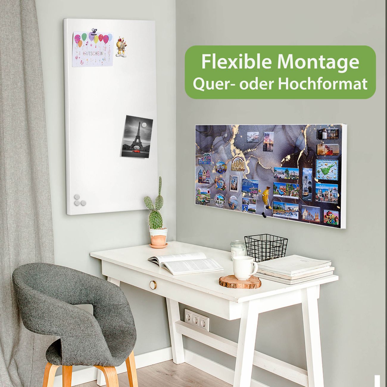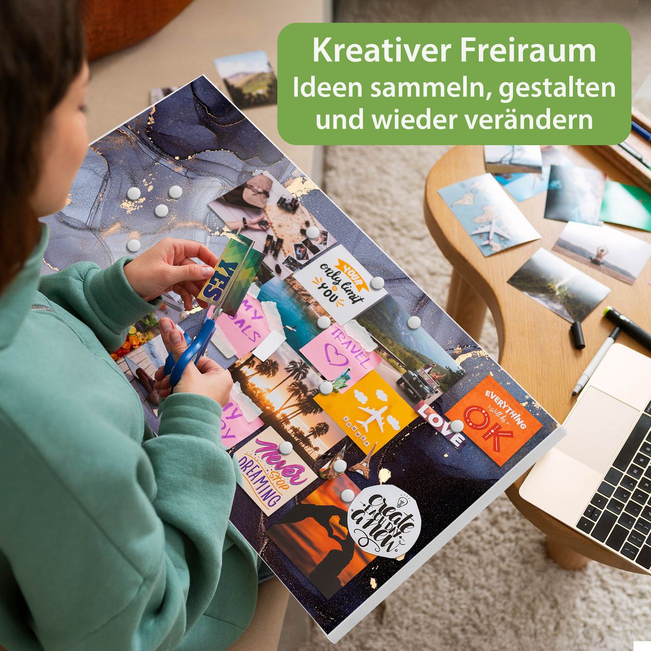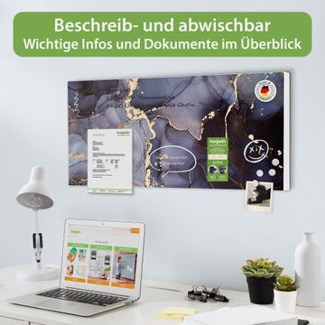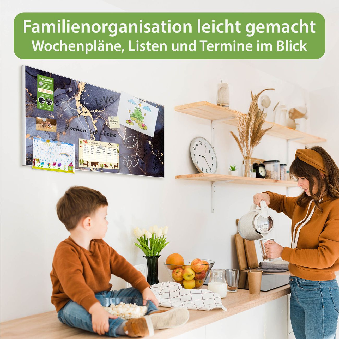 FUNKTION: Die banjado Magnettafel 78x37 cm im Design Motiv Lila Marmor mit Gold 1 vereint Funktionalität und modernes Wohndesign auf stilvolle Weise. Diese hochwertige Magnetwand aus Metall hilft Ihnen dabei, Notizen, Fotos, Termine, Einkaufslisten oder Rezepte übersichtlich zu organisieren. Als praktisches Memoboard sorgt sie für Struktur im Alltag und setzt gleichzeitig einen dekorativen Akzent an Ihrer Wand. DESIGN: Die Metalltafel besteht aus robustem, lackiertem Stahl und ist mit allen handelsüblichen Magneten nutzbar. Besonders praktisch ist die beschreibbare Oberfläche. Sie können die Magnettafel ganz einfach mit Kreidestiften beschriften und die Inhalte bei Bedarf mit einem feuchten Tuch wieder entfernen. So eignet sich das Memoboard ideal für Wochenpläne, Menüpläne, To Do Listen oder kreative Botschaften. DETAILS: Mit ihrem großzügigen Querformat von 78x37 cm bietet die Magnettafel ausreichend Platz für Ihre Organisation. Das Motiv Motiv Lila Marmor mit Gold 1 bringt eine warme, natürliche Optik in Küche, Flur, Büro oder Homeoffice und wirkt auch ohne Magnete oder Beschriftung wie ein modernes Wandbild. NUTZEN: Auf der Rückseite befinden sich vorgefertigte Löcher für eine schnelle und unkomplizierte Wandmontage. Jede banjado Magnettafel wird in Deutschland gefertigt und steht für Qualität, Langlebigkeit und liebevolle Verarbeitung. Dieses beschreibbare Memoboard ist die perfekte Kombination aus Metalltafel, Designobjekt und praktischer Magnetwand für Ihren Alltag. BANJADO: Wir sind ein kleines Team aus dem Herzen von Sachsen. Wir fertigen alle Artikel von Hand für Sie an, Sie erhalten keine preiswerte Importware. Auf Wunsch können Sie auch Ihr eigenes Foto auf die Magnettafel aufbringen, schreiben Sie uns an. Herzlichst, Ihr banjado-Team