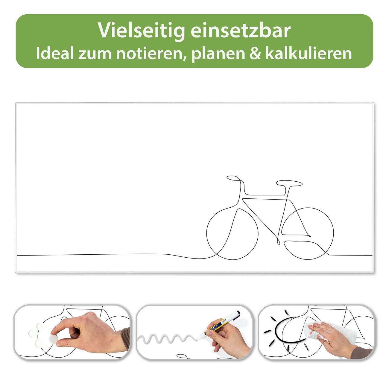 FUNKTION: Die banjado Magnettafel 78x37 cm im Design Motiv Lineart Fahrrad vereint Funktionalität und modernes Wohndesign auf stilvolle Weise. Diese hochwertige Magnetwand aus Metall hilft Ihnen dabei, Notizen, Fotos, Termine, Einkaufslisten oder Rezepte übersichtlich zu organisieren. Als praktisches Memoboard sorgt sie für Struktur im Alltag und setzt gleichzeitig einen dekorativen Akzent an Ihrer Wand. DESIGN: Die Metalltafel besteht aus robustem, lackiertem Stahl und ist mit allen handelsüblichen Magneten nutzbar. Besonders praktisch ist die beschreibbare Oberfläche. Sie können die Magnettafel ganz einfach mit Kreidestiften beschriften und die Inhalte bei Bedarf mit einem feuchten Tuch wieder entfernen. So eignet sich das Memoboard ideal für Wochenpläne, Menüpläne, To Do Listen oder kreative Botschaften. DETAILS: Mit ihrem großzügigen Querformat von 78x37 cm bietet die Magnettafel ausreichend Platz für Ihre Organisation. Das Motiv Motiv Lineart Fahrrad bringt eine warme, natürliche Optik in Küche, Flur, Büro oder Homeoffice und wirkt auch ohne Magnete oder Beschriftung wie ein modernes Wandbild. NUTZEN: Auf der Rückseite befinden sich vorgefertigte Löcher für eine schnelle und unkomplizierte Wandmontage. Jede banjado Magnettafel wird in Deutschland gefertigt und steht für Qualität, Langlebigkeit und liebevolle Verarbeitung. Dieses beschreibbare Memoboard ist die perfekte Kombination aus Metalltafel, Designobjekt und praktischer Magnetwand für Ihren Alltag. BANJADO: Wir sind ein kleines Team aus dem Herzen von Sachsen. Wir fertigen alle Artikel von Hand für Sie an, Sie erhalten keine preiswerte Importware. Auf Wunsch können Sie auch Ihr eigenes Foto auf die Magnettafel aufbringen, schreiben Sie uns an. Herzlichst, Ihr banjado-Team