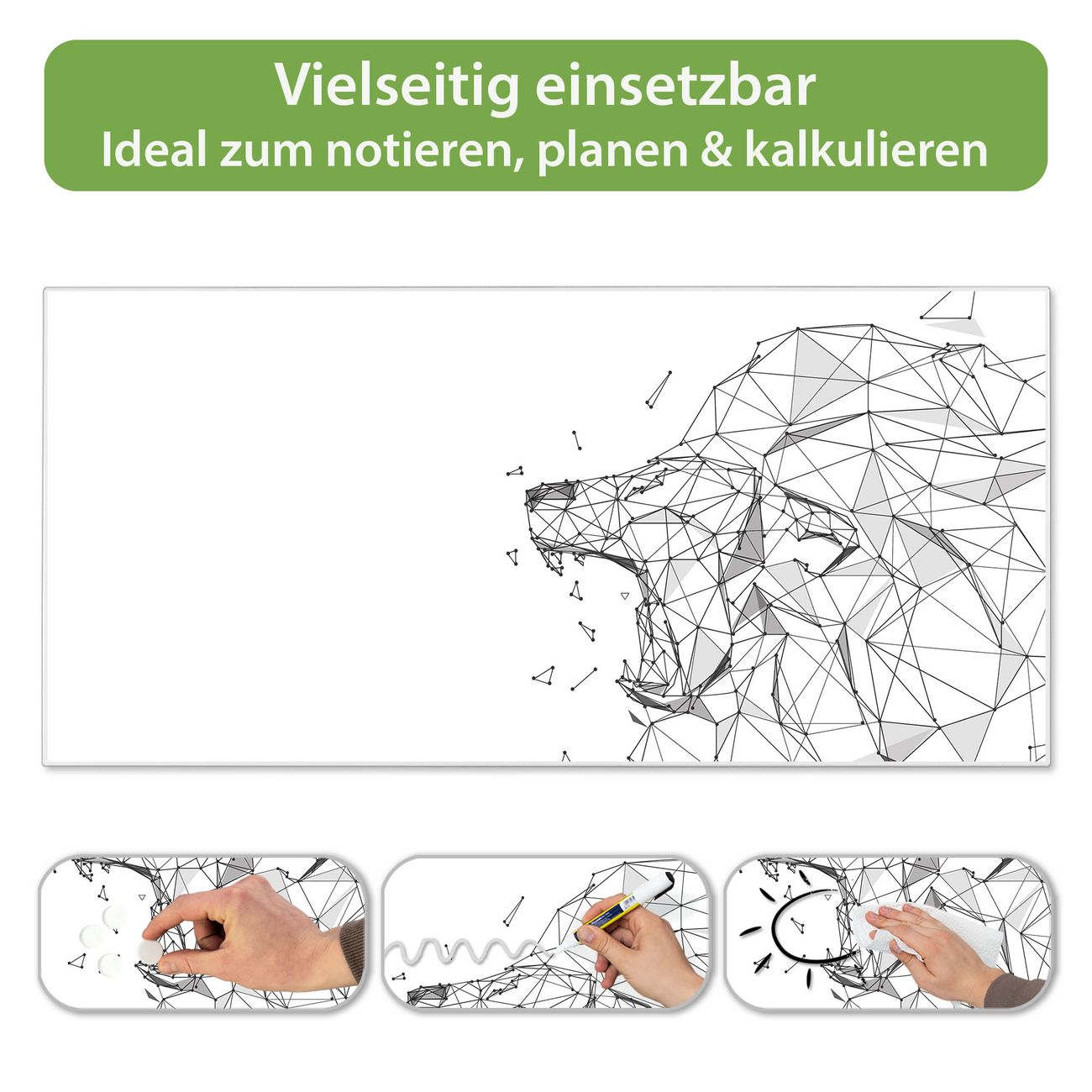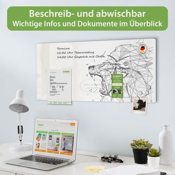 FUNKTION: Die banjado Magnettafel 78x37 cm im Design Motiv Löwe abstrakt 2 vereint Funktionalität und modernes Wohndesign auf stilvolle Weise. Diese hochwertige Magnetwand aus Metall hilft Ihnen dabei, Notizen, Fotos, Termine, Einkaufslisten oder Rezepte übersichtlich zu organisieren. Als praktisches Memoboard sorgt sie für Struktur im Alltag und setzt gleichzeitig einen dekorativen Akzent an Ihrer Wand. DESIGN: Die Metalltafel besteht aus robustem, lackiertem Stahl und ist mit allen handelsüblichen Magneten nutzbar. Besonders praktisch ist die beschreibbare Oberfläche. Sie können die Magnettafel ganz einfach mit Kreidestiften beschriften und die Inhalte bei Bedarf mit einem feuchten Tuch wieder entfernen. So eignet sich das Memoboard ideal für Wochenpläne, Menüpläne, To Do Listen oder kreative Botschaften. DETAILS: Mit ihrem großzügigen Querformat von 78x37 cm bietet die Magnettafel ausreichend Platz für Ihre Organisation. Das Motiv Motiv Löwe abstrakt 2 bringt eine warme, natürliche Optik in Küche, Flur, Büro oder Homeoffice und wirkt auch ohne Magnete oder Beschriftung wie ein modernes Wandbild. NUTZEN: Auf der Rückseite befinden sich vorgefertigte Löcher für eine schnelle und unkomplizierte Wandmontage. Jede banjado Magnettafel wird in Deutschland gefertigt und steht für Qualität, Langlebigkeit und liebevolle Verarbeitung. Dieses beschreibbare Memoboard ist die perfekte Kombination aus Metalltafel, Designobjekt und praktischer Magnetwand für Ihren Alltag. BANJADO: Wir sind ein kleines Team aus dem Herzen von Sachsen. Wir fertigen alle Artikel von Hand für Sie an, Sie erhalten keine preiswerte Importware. Auf Wunsch können Sie auch Ihr eigenes Foto auf die Magnettafel aufbringen, schreiben Sie uns an. Herzlichst, Ihr banjado-Team
