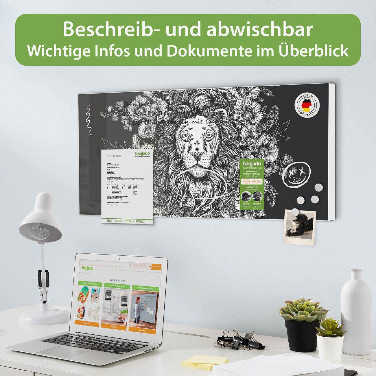 FUNKTION: Die banjado Magnettafel 78x37 cm im Design Motiv Löwenblütenpracht vereint Funktionalität und modernes Wohndesign auf stilvolle Weise. Diese hochwertige Magnetwand aus Metall hilft Ihnen dabei, Notizen, Fotos, Termine, Einkaufslisten oder Rezepte übersichtlich zu organisieren. Als praktisches Memoboard sorgt sie für Struktur im Alltag und setzt gleichzeitig einen dekorativen Akzent an Ihrer Wand. DESIGN: Die Metalltafel besteht aus robustem, lackiertem Stahl und ist mit allen handelsüblichen Magneten nutzbar. Besonders praktisch ist die beschreibbare Oberfläche. Sie können die Magnettafel ganz einfach mit Kreidestiften beschriften und die Inhalte bei Bedarf mit einem feuchten Tuch wieder entfernen. So eignet sich das Memoboard ideal für Wochenpläne, Menüpläne, To Do Listen oder kreative Botschaften. DETAILS: Mit ihrem großzügigen Querformat von 78x37 cm bietet die Magnettafel ausreichend Platz für Ihre Organisation. Das Motiv Motiv Löwenblütenpracht bringt eine warme, natürliche Optik in Küche, Flur, Büro oder Homeoffice und wirkt auch ohne Magnete oder Beschriftung wie ein modernes Wandbild. NUTZEN: Auf der Rückseite befinden sich vorgefertigte Löcher für eine schnelle und unkomplizierte Wandmontage. Jede banjado Magnettafel wird in Deutschland gefertigt und steht für Qualität, Langlebigkeit und liebevolle Verarbeitung. Dieses beschreibbare Memoboard ist die perfekte Kombination aus Metalltafel, Designobjekt und praktischer Magnetwand für Ihren Alltag. BANJADO: Wir sind ein kleines Team aus dem Herzen von Sachsen. Wir fertigen alle Artikel von Hand für Sie an, Sie erhalten keine preiswerte Importware. Auf Wunsch können Sie auch Ihr eigenes Foto auf die Magnettafel aufbringen, schreiben Sie uns an. Herzlichst, Ihr banjado-Team