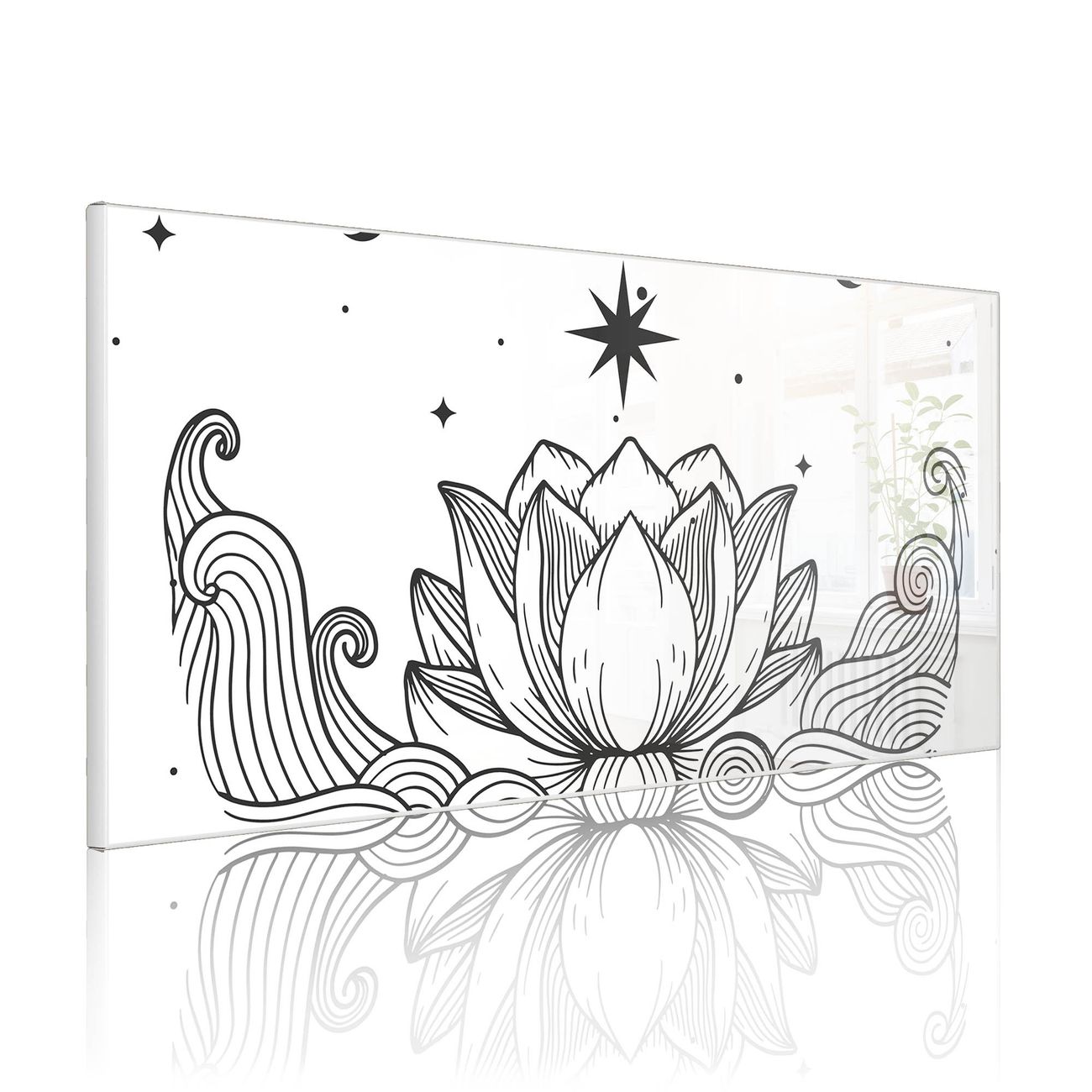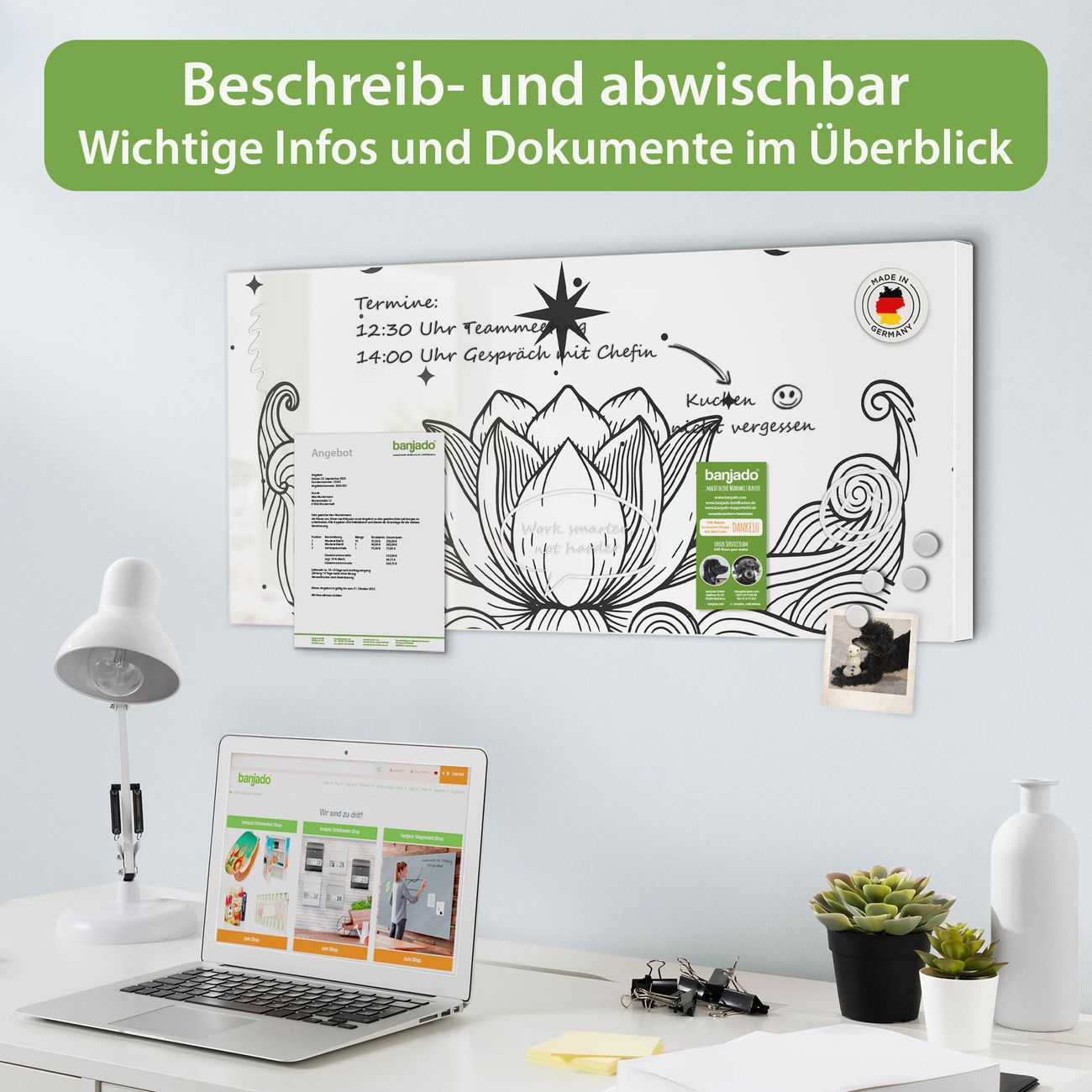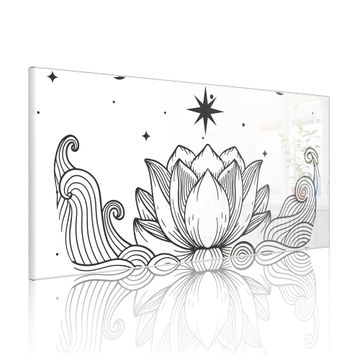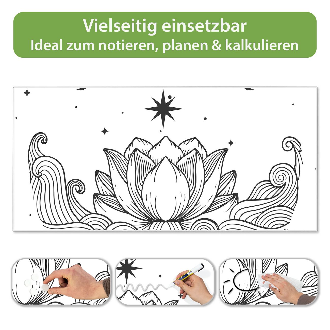 FUNKTION: Die banjado Magnettafel 78x37 cm im Design Motiv Lotus und Mondphasen 2 vereint Funktionalität und modernes Wohndesign auf stilvolle Weise. Diese hochwertige Magnetwand aus Metall hilft Ihnen dabei, Notizen, Fotos, Termine, Einkaufslisten oder Rezepte übersichtlich zu organisieren. Als praktisches Memoboard sorgt sie für Struktur im Alltag und setzt gleichzeitig einen dekorativen Akzent an Ihrer Wand. DESIGN: Die Metalltafel besteht aus robustem, lackiertem Stahl und ist mit allen handelsüblichen Magneten nutzbar. Besonders praktisch ist die beschreibbare Oberfläche. Sie können die Magnettafel ganz einfach mit Kreidestiften beschriften und die Inhalte bei Bedarf mit einem feuchten Tuch wieder entfernen. So eignet sich das Memoboard ideal für Wochenpläne, Menüpläne, To Do Listen oder kreative Botschaften. DETAILS: Mit ihrem großzügigen Querformat von 78x37 cm bietet die Magnettafel ausreichend Platz für Ihre Organisation. Das Motiv Motiv Lotus und Mondphasen 2 bringt eine warme, natürliche Optik in Küche, Flur, Büro oder Homeoffice und wirkt auch ohne Magnete oder Beschriftung wie ein modernes Wandbild. NUTZEN: Auf der Rückseite befinden sich vorgefertigte Löcher für eine schnelle und unkomplizierte Wandmontage. Jede banjado Magnettafel wird in Deutschland gefertigt und steht für Qualität, Langlebigkeit und liebevolle Verarbeitung. Dieses beschreibbare Memoboard ist die perfekte Kombination aus Metalltafel, Designobjekt und praktischer Magnetwand für Ihren Alltag. BANJADO: Wir sind ein kleines Team aus dem Herzen von Sachsen. Wir fertigen alle Artikel von Hand für Sie an, Sie erhalten keine preiswerte Importware. Auf Wunsch können Sie auch Ihr eigenes Foto auf die Magnettafel aufbringen, schreiben Sie uns an. Herzlichst, Ihr banjado-Team