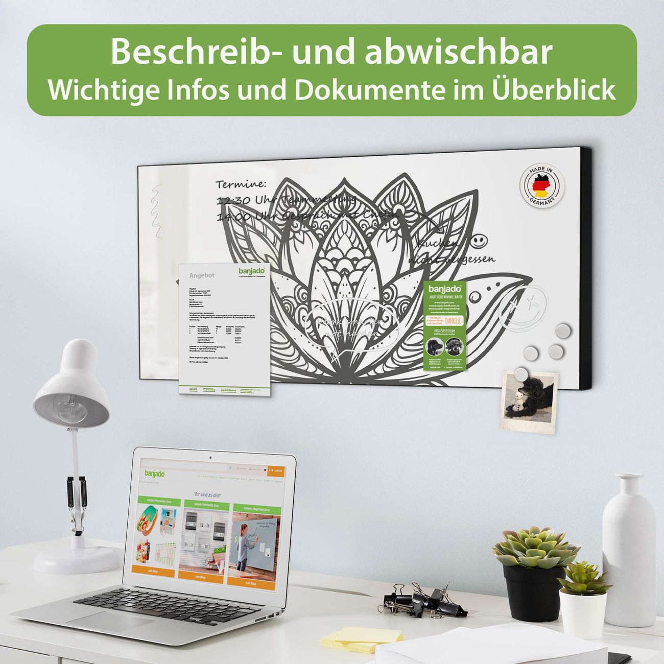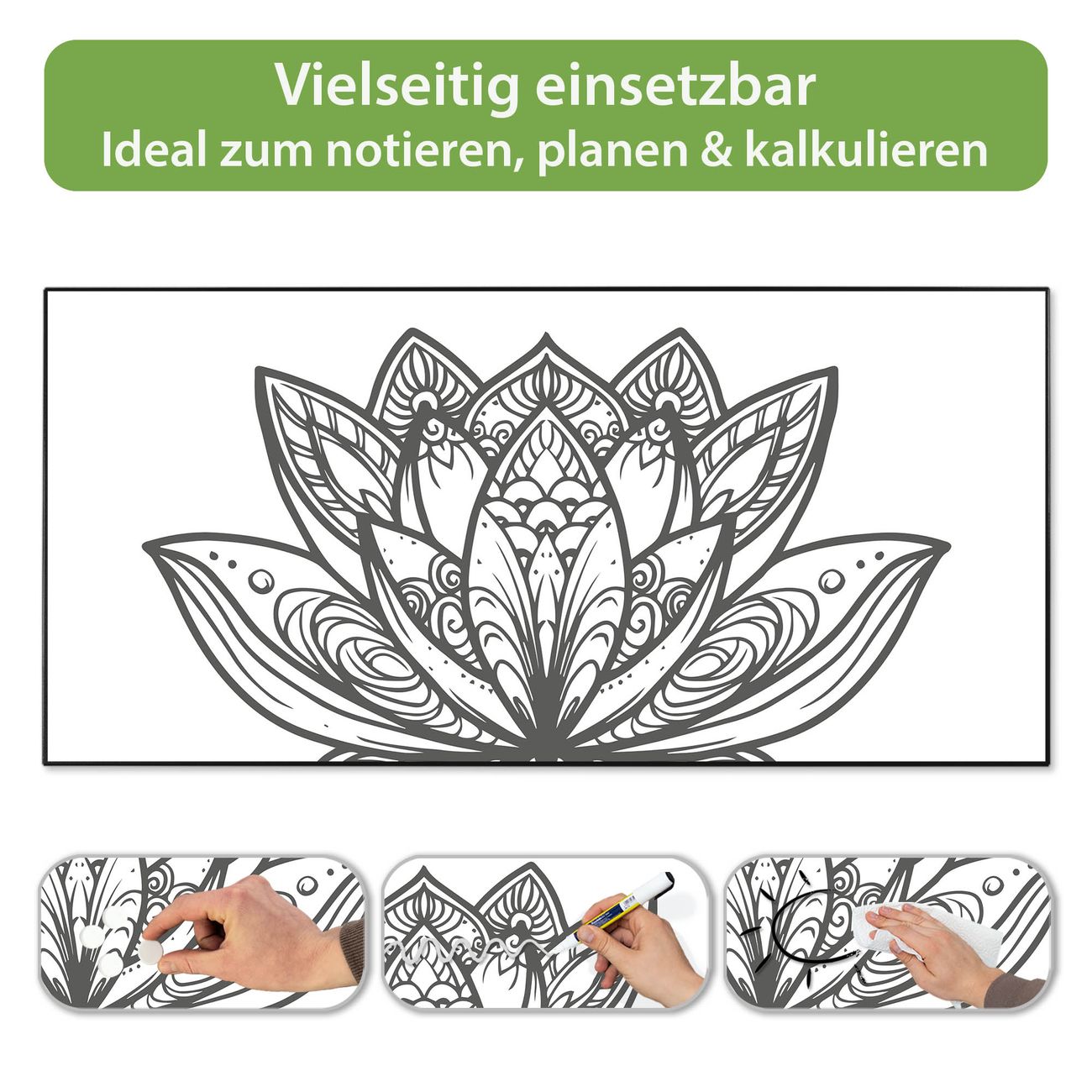 FUNKTION: Die banjado Magnettafel 78x37 cm im Design Motiv Lotusblüte 8 vereint Funktionalität und modernes Wohndesign auf stilvolle Weise. Diese hochwertige Magnetwand aus Metall hilft Ihnen dabei, Notizen, Fotos, Termine, Einkaufslisten oder Rezepte übersichtlich zu organisieren. Als praktisches Memoboard sorgt sie für Struktur im Alltag und setzt gleichzeitig einen dekorativen Akzent an Ihrer Wand. DESIGN: Die Metalltafel besteht aus robustem, lackiertem Stahl und ist mit allen handelsüblichen Magneten nutzbar. Besonders praktisch ist die beschreibbare Oberfläche. Sie können die Magnettafel ganz einfach mit Kreidestiften beschriften und die Inhalte bei Bedarf mit einem feuchten Tuch wieder entfernen. So eignet sich das Memoboard ideal für Wochenpläne, Menüpläne, To Do Listen oder kreative Botschaften. DETAILS: Mit ihrem großzügigen Querformat von 78x37 cm bietet die Magnettafel ausreichend Platz für Ihre Organisation. Das Motiv Motiv Lotusblüte 8 bringt eine warme, natürliche Optik in Küche, Flur, Büro oder Homeoffice und wirkt auch ohne Magnete oder Beschriftung wie ein modernes Wandbild. NUTZEN: Auf der Rückseite befinden sich vorgefertigte Löcher für eine schnelle und unkomplizierte Wandmontage. Jede banjado Magnettafel wird in Deutschland gefertigt und steht für Qualität, Langlebigkeit und liebevolle Verarbeitung. Dieses beschreibbare Memoboard ist die perfekte Kombination aus Metalltafel, Designobjekt und praktischer Magnetwand für Ihren Alltag. BANJADO: Wir sind ein kleines Team aus dem Herzen von Sachsen. Wir fertigen alle Artikel von Hand für Sie an, Sie erhalten keine preiswerte Importware. Auf Wunsch können Sie auch Ihr eigenes Foto auf die Magnettafel aufbringen, schreiben Sie uns an. Herzlichst, Ihr banjado-Team