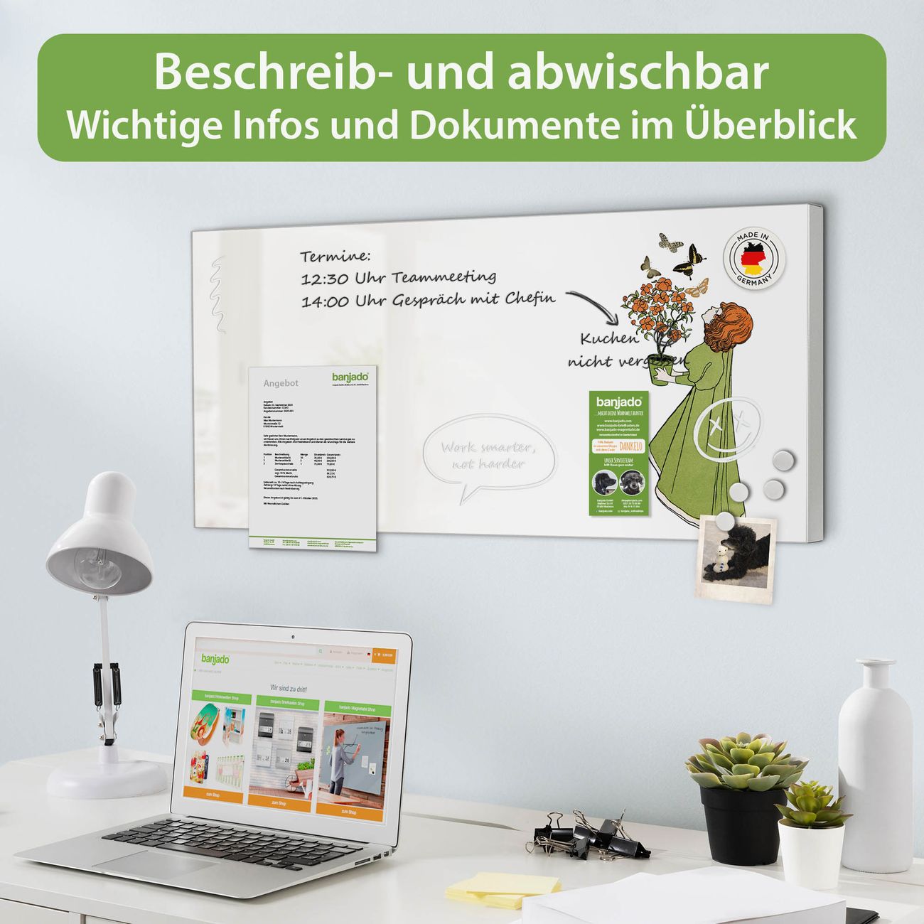 FUNKTION: Die banjado Magnettafel 78x37 cm im Design Motiv Mädchen mit Blumentopf Vintage vereint Funktionalität und modernes Wohndesign auf stilvolle Weise. Diese hochwertige Magnetwand aus Metall hilft Ihnen dabei, Notizen, Fotos, Termine, Einkaufslisten oder Rezepte übersichtlich zu organisieren. Als praktisches Memoboard sorgt sie für Struktur im Alltag und setzt gleichzeitig einen dekorativen Akzent an Ihrer Wand. DESIGN: Die Metalltafel besteht aus robustem, lackiertem Stahl und ist mit allen handelsüblichen Magneten nutzbar. Besonders praktisch ist die beschreibbare Oberfläche. Sie können die Magnettafel ganz einfach mit Kreidestiften beschriften und die Inhalte bei Bedarf mit einem feuchten Tuch wieder entfernen. So eignet sich das Memoboard ideal für Wochenpläne, Menüpläne, To Do Listen oder kreative Botschaften. DETAILS: Mit ihrem großzügigen Querformat von 78x37 cm bietet die Magnettafel ausreichend Platz für Ihre Organisation. Das Motiv Motiv Mädchen mit Blumentopf Vintage bringt eine warme, natürliche Optik in Küche, Flur, Büro oder Homeoffice und wirkt auch ohne Magnete oder Beschriftung wie ein modernes Wandbild. NUTZEN: Auf der Rückseite befinden sich vorgefertigte Löcher für eine schnelle und unkomplizierte Wandmontage. Jede banjado Magnettafel wird in Deutschland gefertigt und steht für Qualität, Langlebigkeit und liebevolle Verarbeitung. Dieses beschreibbare Memoboard ist die perfekte Kombination aus Metalltafel, Designobjekt und praktischer Magnetwand für Ihren Alltag. BANJADO: Wir sind ein kleines Team aus dem Herzen von Sachsen. Wir fertigen alle Artikel von Hand für Sie an, Sie erhalten keine preiswerte Importware. Auf Wunsch können Sie auch Ihr eigenes Foto auf die Magnettafel aufbringen, schreiben Sie uns an. Herzlichst, Ihr banjado-Team