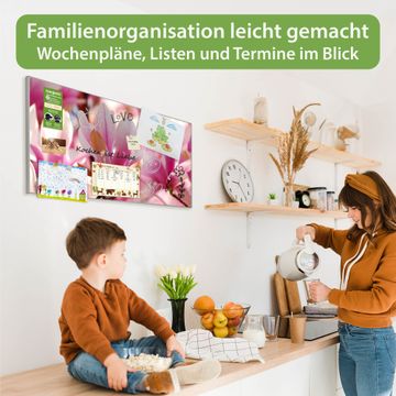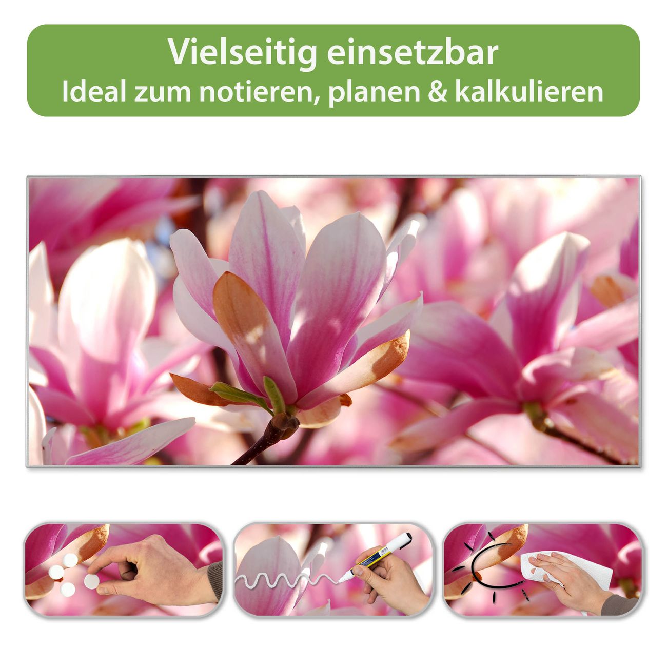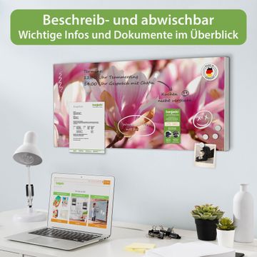 FUNKTION: Die banjado Magnettafel 78x37 cm im Design Motiv Magnolia vereint Funktionalität und modernes Wohndesign auf stilvolle Weise. Diese hochwertige Magnetwand aus Metall hilft Ihnen dabei, Notizen, Fotos, Termine, Einkaufslisten oder Rezepte übersichtlich zu organisieren. Als praktisches Memoboard sorgt sie für Struktur im Alltag und setzt gleichzeitig einen dekorativen Akzent an Ihrer Wand. DESIGN: Die Metalltafel besteht aus robustem, lackiertem Stahl und ist mit allen handelsüblichen Magneten nutzbar. Besonders praktisch ist die beschreibbare Oberfläche. Sie können die Magnettafel ganz einfach mit Kreidestiften beschriften und die Inhalte bei Bedarf mit einem feuchten Tuch wieder entfernen. So eignet sich das Memoboard ideal für Wochenpläne, Menüpläne, To Do Listen oder kreative Botschaften. DETAILS: Mit ihrem großzügigen Querformat von 78x37 cm bietet die Magnettafel ausreichend Platz für Ihre Organisation. Das Motiv Motiv Magnolia bringt eine warme, natürliche Optik in Küche, Flur, Büro oder Homeoffice und wirkt auch ohne Magnete oder Beschriftung wie ein modernes Wandbild. NUTZEN: Auf der Rückseite befinden sich vorgefertigte Löcher für eine schnelle und unkomplizierte Wandmontage. Jede banjado Magnettafel wird in Deutschland gefertigt und steht für Qualität, Langlebigkeit und liebevolle Verarbeitung. Dieses beschreibbare Memoboard ist die perfekte Kombination aus Metalltafel, Designobjekt und praktischer Magnetwand für Ihren Alltag. BANJADO: Wir sind ein kleines Team aus dem Herzen von Sachsen. Wir fertigen alle Artikel von Hand für Sie an, Sie erhalten keine preiswerte Importware. Auf Wunsch können Sie auch Ihr eigenes Foto auf die Magnettafel aufbringen, schreiben Sie uns an. Herzlichst, Ihr banjado-Team