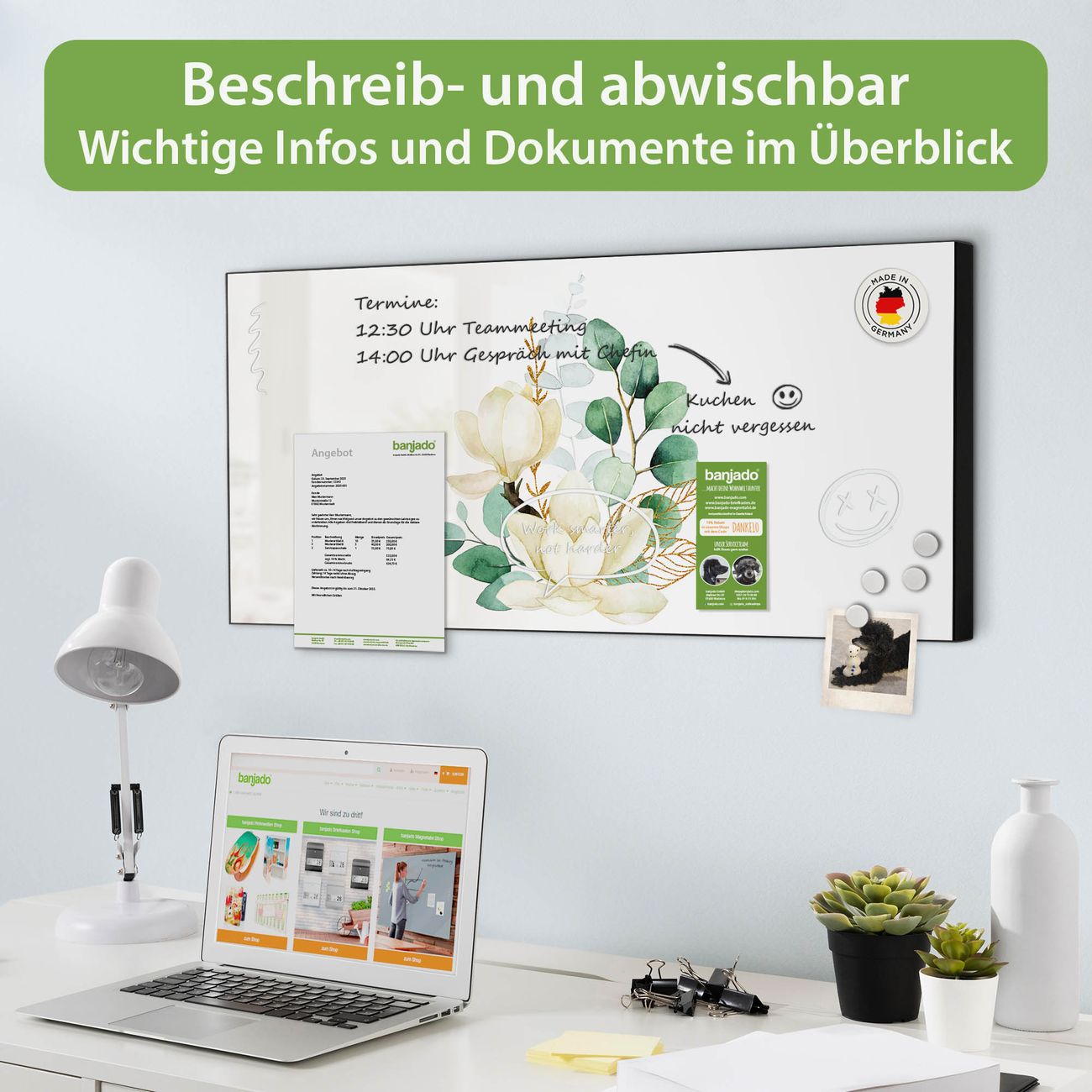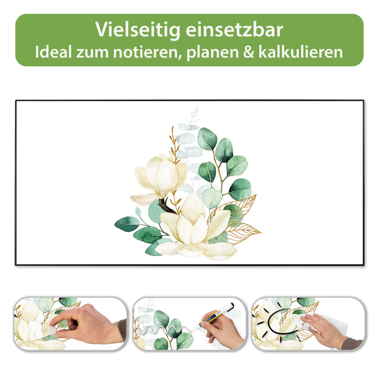 FUNKTION: Die banjado Magnettafel 78x37 cm im Design Motiv Magnolienkomposition vereint Funktionalität und modernes Wohndesign auf stilvolle Weise. Diese hochwertige Magnetwand aus Metall hilft Ihnen dabei, Notizen, Fotos, Termine, Einkaufslisten oder Rezepte übersichtlich zu organisieren. Als praktisches Memoboard sorgt sie für Struktur im Alltag und setzt gleichzeitig einen dekorativen Akzent an Ihrer Wand. DESIGN: Die Metalltafel besteht aus robustem, lackiertem Stahl und ist mit allen handelsüblichen Magneten nutzbar. Besonders praktisch ist die beschreibbare Oberfläche. Sie können die Magnettafel ganz einfach mit Kreidestiften beschriften und die Inhalte bei Bedarf mit einem feuchten Tuch wieder entfernen. So eignet sich das Memoboard ideal für Wochenpläne, Menüpläne, To Do Listen oder kreative Botschaften. DETAILS: Mit ihrem großzügigen Querformat von 78x37 cm bietet die Magnettafel ausreichend Platz für Ihre Organisation. Das Motiv Motiv Magnolienkomposition bringt eine warme, natürliche Optik in Küche, Flur, Büro oder Homeoffice und wirkt auch ohne Magnete oder Beschriftung wie ein modernes Wandbild. NUTZEN: Auf der Rückseite befinden sich vorgefertigte Löcher für eine schnelle und unkomplizierte Wandmontage. Jede banjado Magnettafel wird in Deutschland gefertigt und steht für Qualität, Langlebigkeit und liebevolle Verarbeitung. Dieses beschreibbare Memoboard ist die perfekte Kombination aus Metalltafel, Designobjekt und praktischer Magnetwand für Ihren Alltag. BANJADO: Wir sind ein kleines Team aus dem Herzen von Sachsen. Wir fertigen alle Artikel von Hand für Sie an, Sie erhalten keine preiswerte Importware. Auf Wunsch können Sie auch Ihr eigenes Foto auf die Magnettafel aufbringen, schreiben Sie uns an. Herzlichst, Ihr banjado-Team