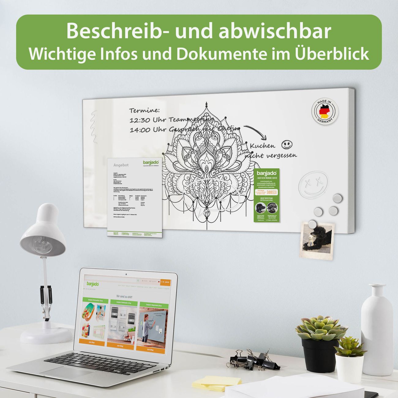 FUNKTION: Die banjado Magnettafel 78x37 cm im Design Motiv Mandala Muster vereint Funktionalität und modernes Wohndesign auf stilvolle Weise. Diese hochwertige Magnetwand aus Metall hilft Ihnen dabei, Notizen, Fotos, Termine, Einkaufslisten oder Rezepte übersichtlich zu organisieren. Als praktisches Memoboard sorgt sie für Struktur im Alltag und setzt gleichzeitig einen dekorativen Akzent an Ihrer Wand. DESIGN: Die Metalltafel besteht aus robustem, lackiertem Stahl und ist mit allen handelsüblichen Magneten nutzbar. Besonders praktisch ist die beschreibbare Oberfläche. Sie können die Magnettafel ganz einfach mit Kreidestiften beschriften und die Inhalte bei Bedarf mit einem feuchten Tuch wieder entfernen. So eignet sich das Memoboard ideal für Wochenpläne, Menüpläne, To Do Listen oder kreative Botschaften. DETAILS: Mit ihrem großzügigen Querformat von 78x37 cm bietet die Magnettafel ausreichend Platz für Ihre Organisation. Das Motiv Motiv Mandala Muster bringt eine warme, natürliche Optik in Küche, Flur, Büro oder Homeoffice und wirkt auch ohne Magnete oder Beschriftung wie ein modernes Wandbild. NUTZEN: Auf der Rückseite befinden sich vorgefertigte Löcher für eine schnelle und unkomplizierte Wandmontage. Jede banjado Magnettafel wird in Deutschland gefertigt und steht für Qualität, Langlebigkeit und liebevolle Verarbeitung. Dieses beschreibbare Memoboard ist die perfekte Kombination aus Metalltafel, Designobjekt und praktischer Magnetwand für Ihren Alltag. BANJADO: Wir sind ein kleines Team aus dem Herzen von Sachsen. Wir fertigen alle Artikel von Hand für Sie an, Sie erhalten keine preiswerte Importware. Auf Wunsch können Sie auch Ihr eigenes Foto auf die Magnettafel aufbringen, schreiben Sie uns an. Herzlichst, Ihr banjado-Team