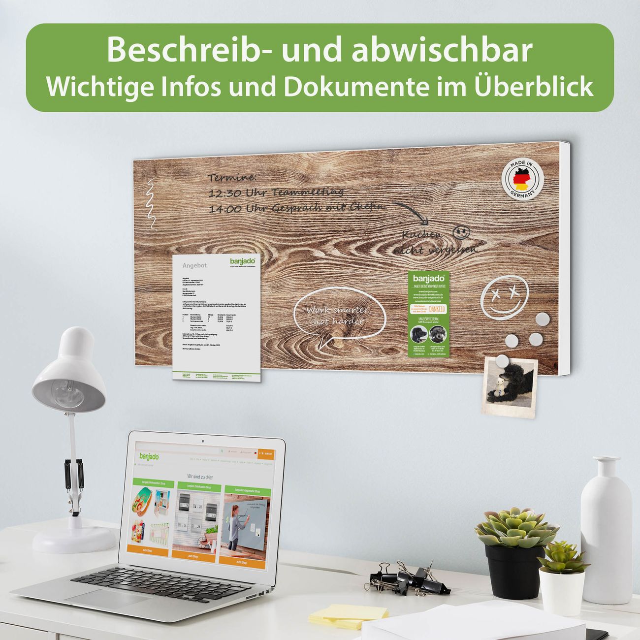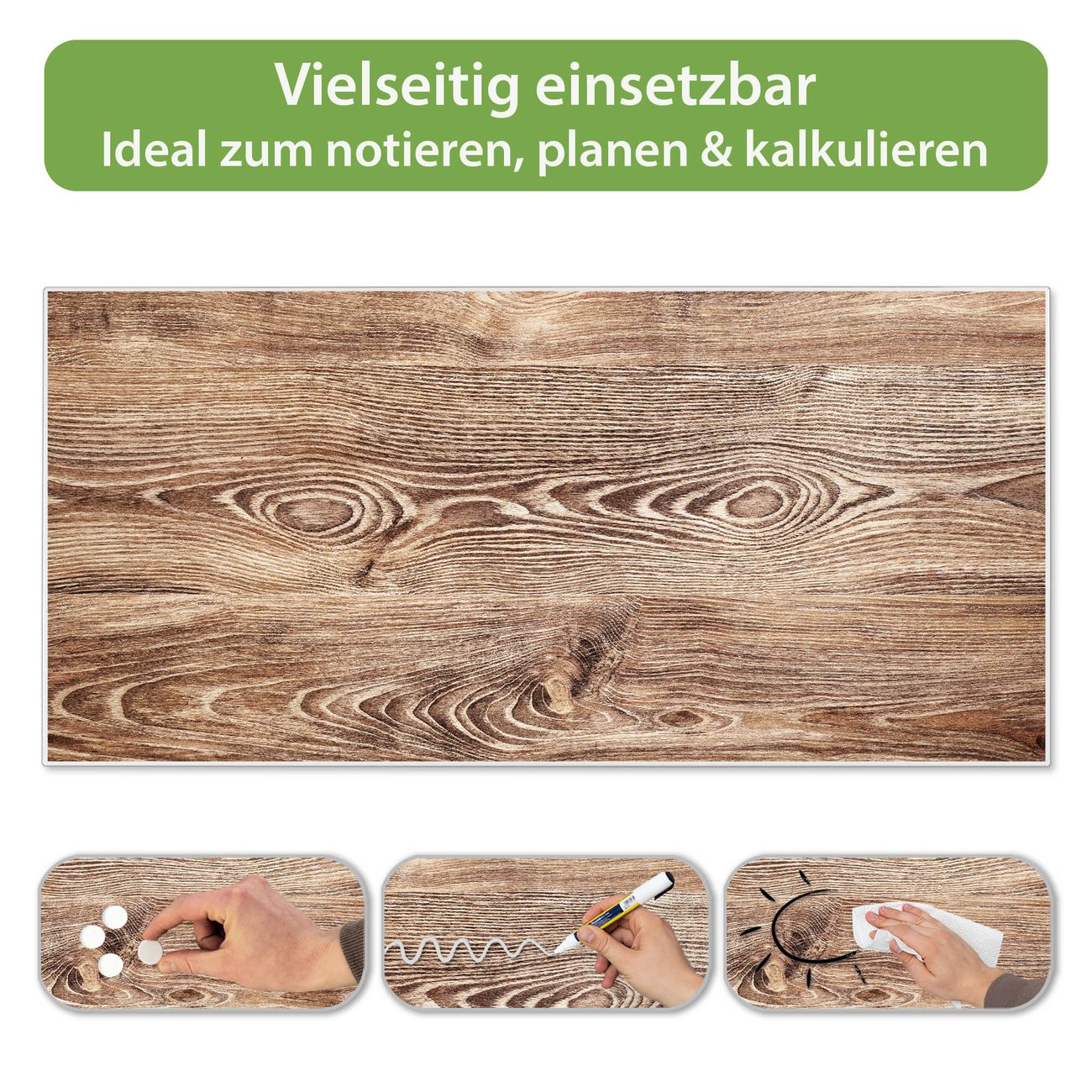 FUNKTION: Die banjado Magnettafel 78x37 cm im Design Motiv Maserung vereint Funktionalität und modernes Wohndesign auf stilvolle Weise. Diese hochwertige Magnetwand aus Metall hilft Ihnen dabei, Notizen, Fotos, Termine, Einkaufslisten oder Rezepte übersichtlich zu organisieren. Als praktisches Memoboard sorgt sie für Struktur im Alltag und setzt gleichzeitig einen dekorativen Akzent an Ihrer Wand. DESIGN: Die Metalltafel besteht aus robustem, lackiertem Stahl und ist mit allen handelsüblichen Magneten nutzbar. Besonders praktisch ist die beschreibbare Oberfläche. Sie können die Magnettafel ganz einfach mit Kreidestiften beschriften und die Inhalte bei Bedarf mit einem feuchten Tuch wieder entfernen. So eignet sich das Memoboard ideal für Wochenpläne, Menüpläne, To Do Listen oder kreative Botschaften. DETAILS: Mit ihrem großzügigen Querformat von 78x37 cm bietet die Magnettafel ausreichend Platz für Ihre Organisation. Das Motiv Motiv Maserung bringt eine warme, natürliche Optik in Küche, Flur, Büro oder Homeoffice und wirkt auch ohne Magnete oder Beschriftung wie ein modernes Wandbild. NUTZEN: Auf der Rückseite befinden sich vorgefertigte Löcher für eine schnelle und unkomplizierte Wandmontage. Jede banjado Magnettafel wird in Deutschland gefertigt und steht für Qualität, Langlebigkeit und liebevolle Verarbeitung. Dieses beschreibbare Memoboard ist die perfekte Kombination aus Metalltafel, Designobjekt und praktischer Magnetwand für Ihren Alltag. BANJADO: Wir sind ein kleines Team aus dem Herzen von Sachsen. Wir fertigen alle Artikel von Hand für Sie an, Sie erhalten keine preiswerte Importware. Auf Wunsch können Sie auch Ihr eigenes Foto auf die Magnettafel aufbringen, schreiben Sie uns an. Herzlichst, Ihr banjado-Team
