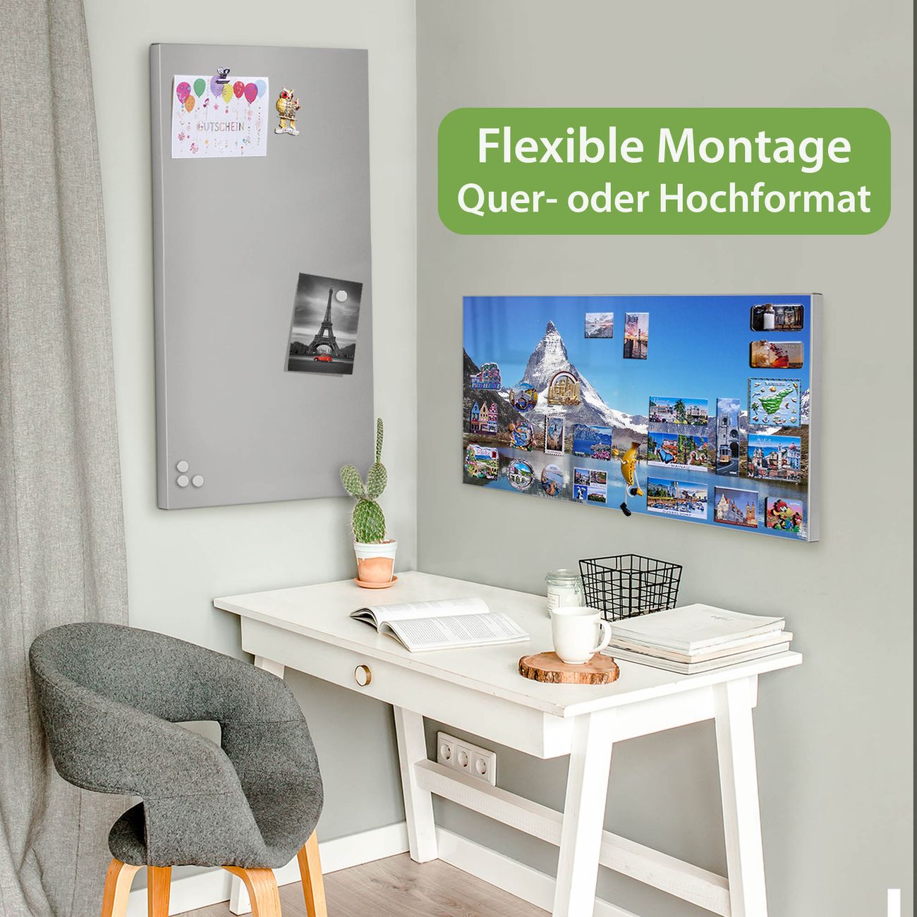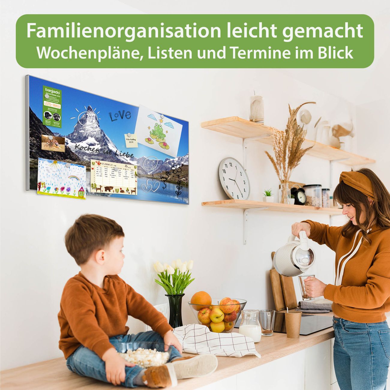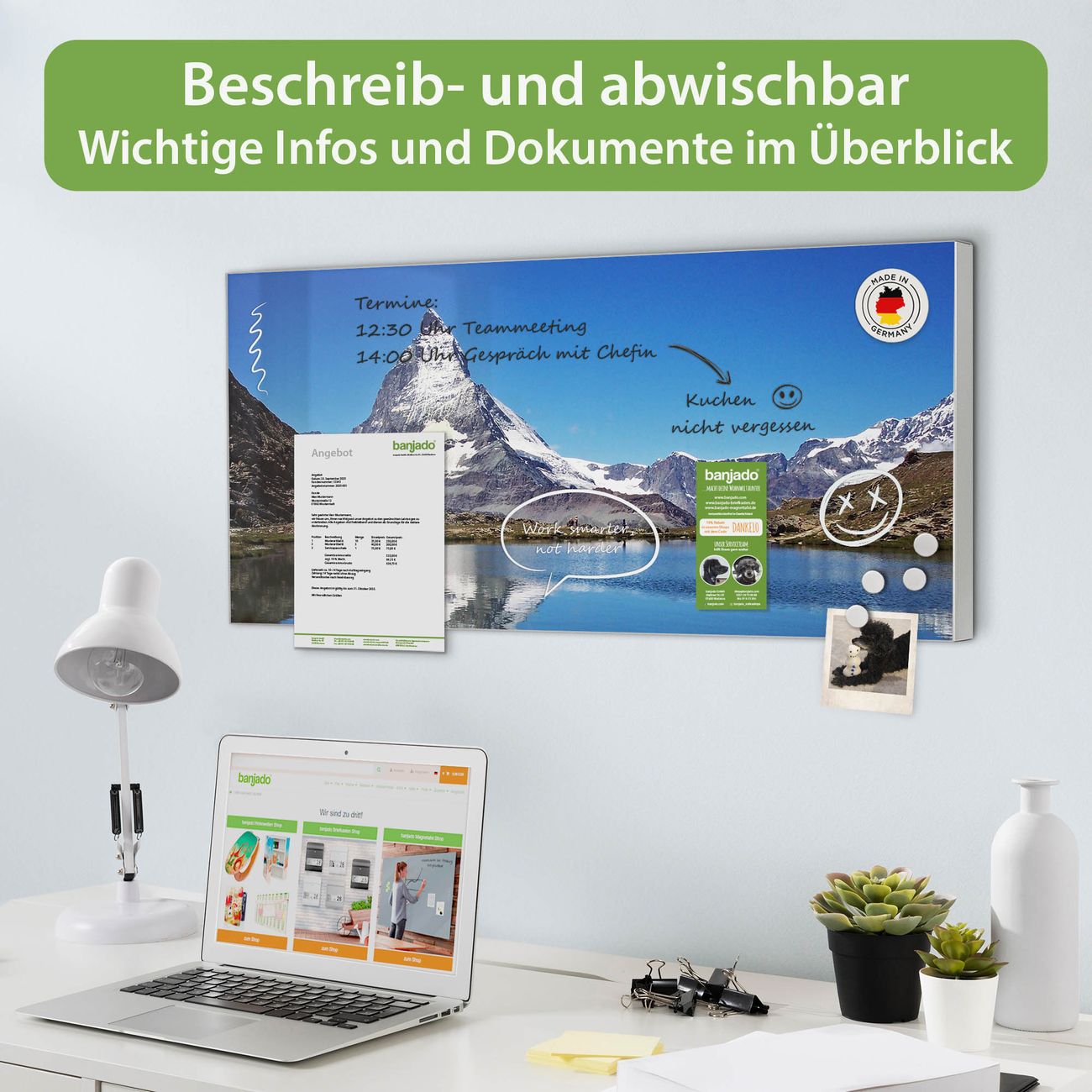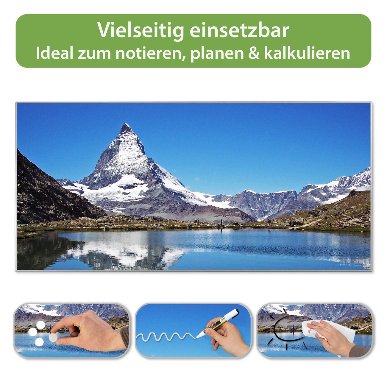 FUNKTION: Die banjado Magnettafel 78x37 cm im Design Motiv Matterhorn vereint Funktionalität und modernes Wohndesign auf stilvolle Weise. Diese hochwertige Magnetwand aus Metall hilft Ihnen dabei, Notizen, Fotos, Termine, Einkaufslisten oder Rezepte übersichtlich zu organisieren. Als praktisches Memoboard sorgt sie für Struktur im Alltag und setzt gleichzeitig einen dekorativen Akzent an Ihrer Wand. DESIGN: Die Metalltafel besteht aus robustem, lackiertem Stahl und ist mit allen handelsüblichen Magneten nutzbar. Besonders praktisch ist die beschreibbare Oberfläche. Sie können die Magnettafel ganz einfach mit Kreidestiften beschriften und die Inhalte bei Bedarf mit einem feuchten Tuch wieder entfernen. So eignet sich das Memoboard ideal für Wochenpläne, Menüpläne, To Do Listen oder kreative Botschaften. DETAILS: Mit ihrem großzügigen Querformat von 78x37 cm bietet die Magnettafel ausreichend Platz für Ihre Organisation. Das Motiv Motiv Matterhorn bringt eine warme, natürliche Optik in Küche, Flur, Büro oder Homeoffice und wirkt auch ohne Magnete oder Beschriftung wie ein modernes Wandbild. NUTZEN: Auf der Rückseite befinden sich vorgefertigte Löcher für eine schnelle und unkomplizierte Wandmontage. Jede banjado Magnettafel wird in Deutschland gefertigt und steht für Qualität, Langlebigkeit und liebevolle Verarbeitung. Dieses beschreibbare Memoboard ist die perfekte Kombination aus Metalltafel, Designobjekt und praktischer Magnetwand für Ihren Alltag. BANJADO: Wir sind ein kleines Team aus dem Herzen von Sachsen. Wir fertigen alle Artikel von Hand für Sie an, Sie erhalten keine preiswerte Importware. Auf Wunsch können Sie auch Ihr eigenes Foto auf die Magnettafel aufbringen, schreiben Sie uns an. Herzlichst, Ihr banjado-Team