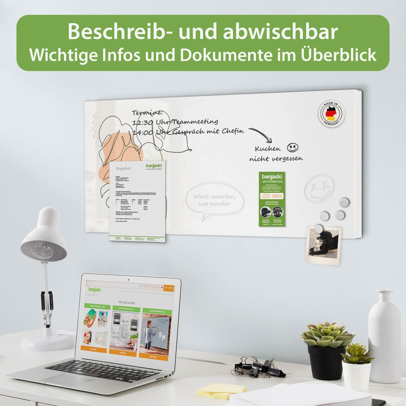 FUNKTION: Die banjado Magnettafel 78x37 cm im Design Motiv Minimalistische Pflanzen Lineart vereint Funktionalität und modernes Wohndesign auf stilvolle Weise. Diese hochwertige Magnetwand aus Metall hilft Ihnen dabei, Notizen, Fotos, Termine, Einkaufslisten oder Rezepte übersichtlich zu organisieren. Als praktisches Memoboard sorgt sie für Struktur im Alltag und setzt gleichzeitig einen dekorativen Akzent an Ihrer Wand. DESIGN: Die Metalltafel besteht aus robustem, lackiertem Stahl und ist mit allen handelsüblichen Magneten nutzbar. Besonders praktisch ist die beschreibbare Oberfläche. Sie können die Magnettafel ganz einfach mit Kreidestiften beschriften und die Inhalte bei Bedarf mit einem feuchten Tuch wieder entfernen. So eignet sich das Memoboard ideal für Wochenpläne, Menüpläne, To Do Listen oder kreative Botschaften. DETAILS: Mit ihrem großzügigen Querformat von 78x37 cm bietet die Magnettafel ausreichend Platz für Ihre Organisation. Das Motiv Motiv Minimalistische Pflanzen Lineart bringt eine warme, natürliche Optik in Küche, Flur, Büro oder Homeoffice und wirkt auch ohne Magnete oder Beschriftung wie ein modernes Wandbild. NUTZEN: Auf der Rückseite befinden sich vorgefertigte Löcher für eine schnelle und unkomplizierte Wandmontage. Jede banjado Magnettafel wird in Deutschland gefertigt und steht für Qualität, Langlebigkeit und liebevolle Verarbeitung. Dieses beschreibbare Memoboard ist die perfekte Kombination aus Metalltafel, Designobjekt und praktischer Magnetwand für Ihren Alltag. BANJADO: Wir sind ein kleines Team aus dem Herzen von Sachsen. Wir fertigen alle Artikel von Hand für Sie an, Sie erhalten keine preiswerte Importware. Auf Wunsch können Sie auch Ihr eigenes Foto auf die Magnettafel aufbringen, schreiben Sie uns an. Herzlichst, Ihr banjado-Team
