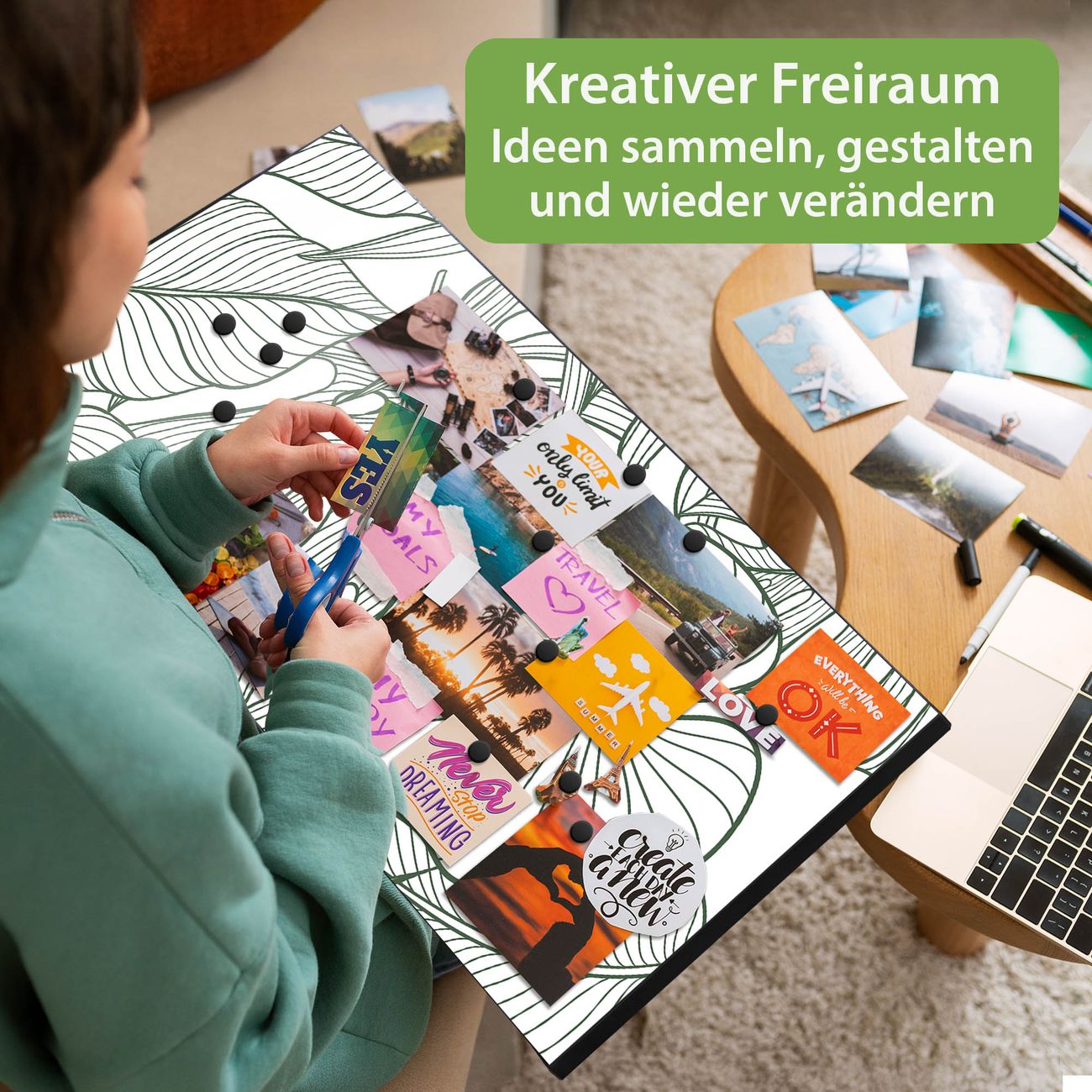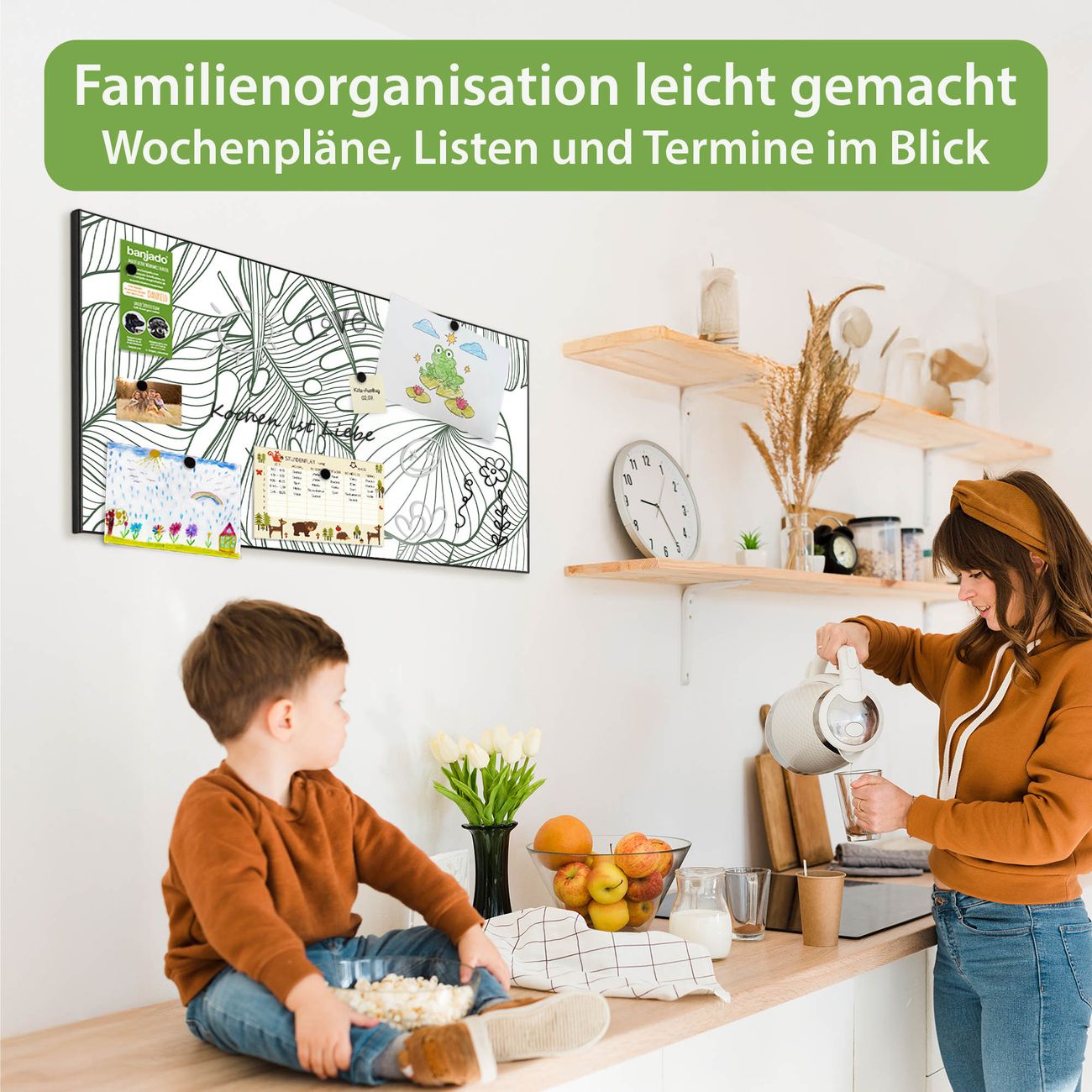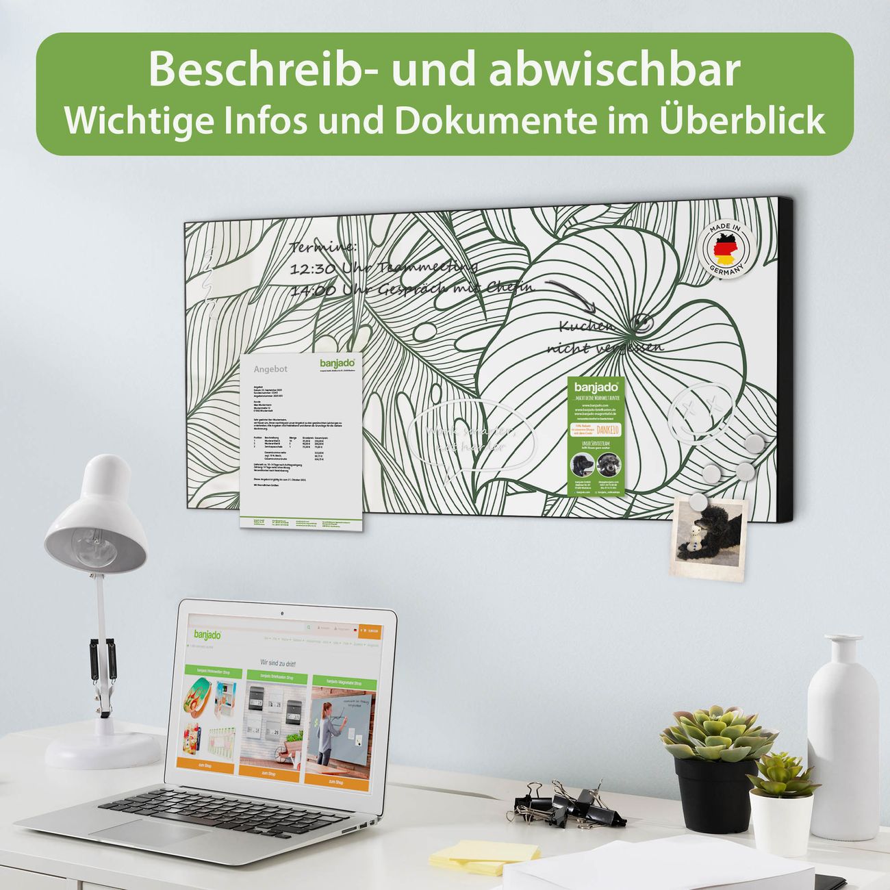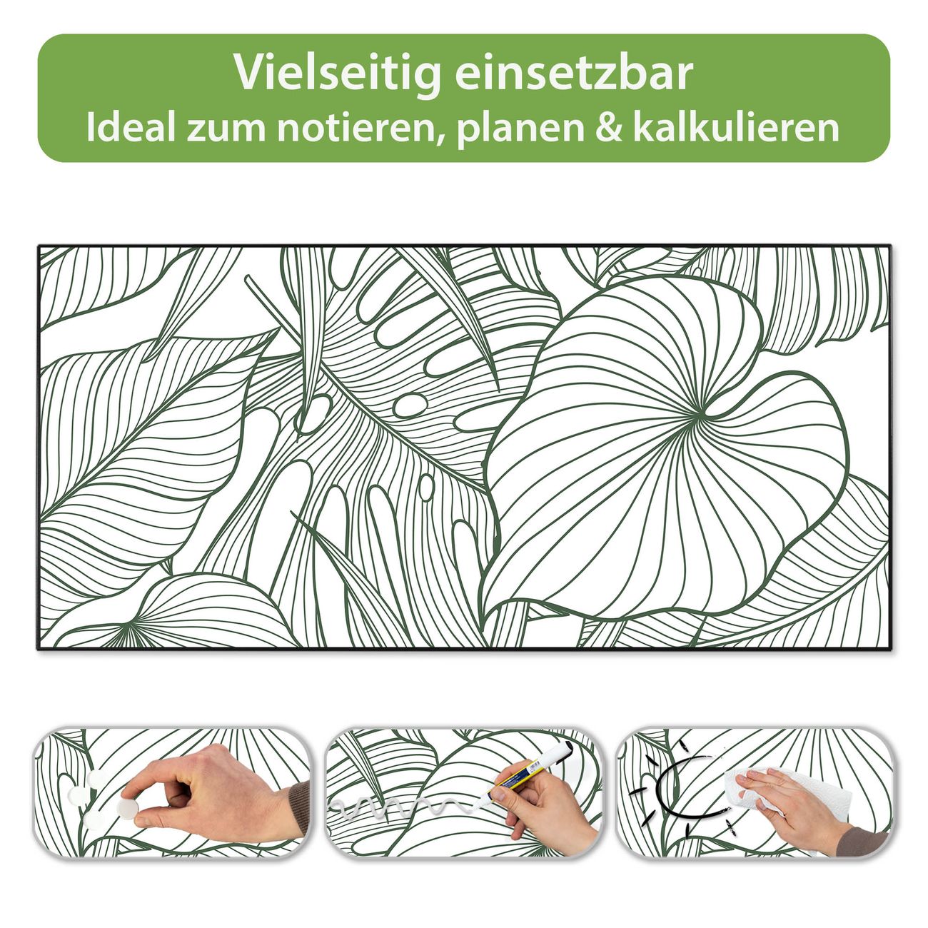 FUNKTION: Die banjado Magnettafel 78x37 cm im Design Motiv Monstera 2 vereint Funktionalität und modernes Wohndesign auf stilvolle Weise. Diese hochwertige Magnetwand aus Metall hilft Ihnen dabei, Notizen, Fotos, Termine, Einkaufslisten oder Rezepte übersichtlich zu organisieren. Als praktisches Memoboard sorgt sie für Struktur im Alltag und setzt gleichzeitig einen dekorativen Akzent an Ihrer Wand. DESIGN: Die Metalltafel besteht aus robustem, lackiertem Stahl und ist mit allen handelsüblichen Magneten nutzbar. Besonders praktisch ist die beschreibbare Oberfläche. Sie können die Magnettafel ganz einfach mit Kreidestiften beschriften und die Inhalte bei Bedarf mit einem feuchten Tuch wieder entfernen. So eignet sich das Memoboard ideal für Wochenpläne, Menüpläne, To Do Listen oder kreative Botschaften. DETAILS: Mit ihrem großzügigen Querformat von 78x37 cm bietet die Magnettafel ausreichend Platz für Ihre Organisation. Das Motiv Motiv Monstera 2 bringt eine warme, natürliche Optik in Küche, Flur, Büro oder Homeoffice und wirkt auch ohne Magnete oder Beschriftung wie ein modernes Wandbild. NUTZEN: Auf der Rückseite befinden sich vorgefertigte Löcher für eine schnelle und unkomplizierte Wandmontage. Jede banjado Magnettafel wird in Deutschland gefertigt und steht für Qualität, Langlebigkeit und liebevolle Verarbeitung. Dieses beschreibbare Memoboard ist die perfekte Kombination aus Metalltafel, Designobjekt und praktischer Magnetwand für Ihren Alltag. BANJADO: Wir sind ein kleines Team aus dem Herzen von Sachsen. Wir fertigen alle Artikel von Hand für Sie an, Sie erhalten keine preiswerte Importware. Auf Wunsch können Sie auch Ihr eigenes Foto auf die Magnettafel aufbringen, schreiben Sie uns an. Herzlichst, Ihr banjado-Team