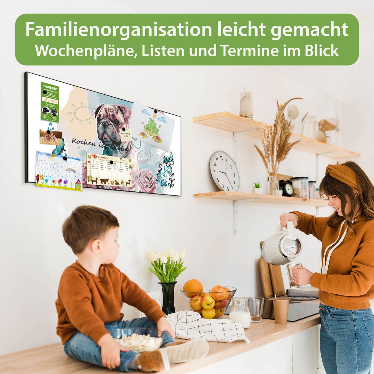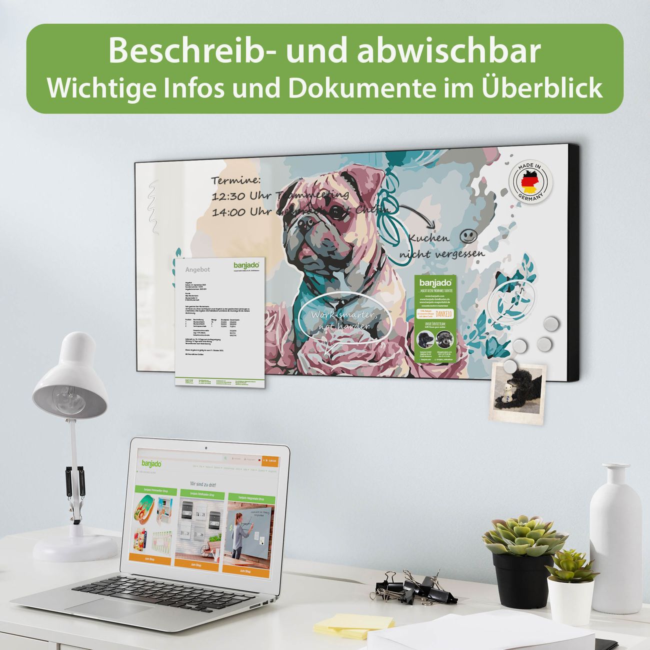 FUNKTION: Die banjado Magnettafel 78x37 cm im Design Motiv Mops mit Ballons Aquarell vereint Funktionalität und modernes Wohndesign auf stilvolle Weise. Diese hochwertige Magnetwand aus Metall hilft Ihnen dabei, Notizen, Fotos, Termine, Einkaufslisten oder Rezepte übersichtlich zu organisieren. Als praktisches Memoboard sorgt sie für Struktur im Alltag und setzt gleichzeitig einen dekorativen Akzent an Ihrer Wand. DESIGN: Die Metalltafel besteht aus robustem, lackiertem Stahl und ist mit allen handelsüblichen Magneten nutzbar. Besonders praktisch ist die beschreibbare Oberfläche. Sie können die Magnettafel ganz einfach mit Kreidestiften beschriften und die Inhalte bei Bedarf mit einem feuchten Tuch wieder entfernen. So eignet sich das Memoboard ideal für Wochenpläne, Menüpläne, To Do Listen oder kreative Botschaften. DETAILS: Mit ihrem großzügigen Querformat von 78x37 cm bietet die Magnettafel ausreichend Platz für Ihre Organisation. Das Motiv Motiv Mops mit Ballons Aquarell bringt eine warme, natürliche Optik in Küche, Flur, Büro oder Homeoffice und wirkt auch ohne Magnete oder Beschriftung wie ein modernes Wandbild. NUTZEN: Auf der Rückseite befinden sich vorgefertigte Löcher für eine schnelle und unkomplizierte Wandmontage. Jede banjado Magnettafel wird in Deutschland gefertigt und steht für Qualität, Langlebigkeit und liebevolle Verarbeitung. Dieses beschreibbare Memoboard ist die perfekte Kombination aus Metalltafel, Designobjekt und praktischer Magnetwand für Ihren Alltag. BANJADO: Wir sind ein kleines Team aus dem Herzen von Sachsen. Wir fertigen alle Artikel von Hand für Sie an, Sie erhalten keine preiswerte Importware. Auf Wunsch können Sie auch Ihr eigenes Foto auf die Magnettafel aufbringen, schreiben Sie uns an. Herzlichst, Ihr banjado-Team