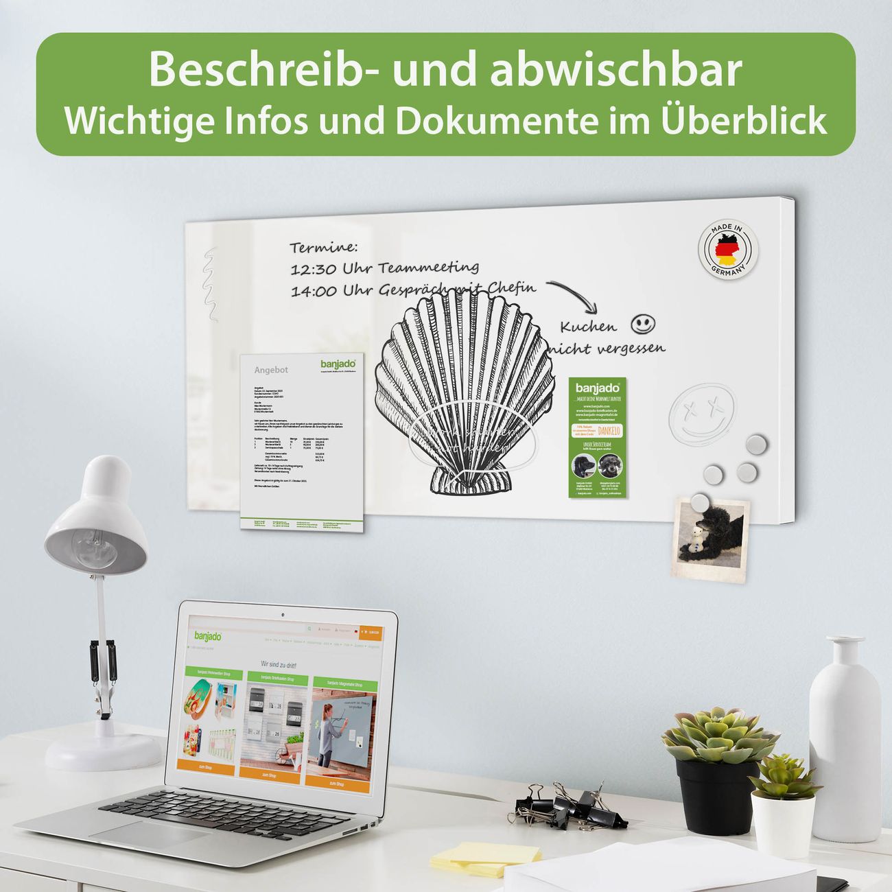 FUNKTION: Die banjado Magnettafel 78x37 cm im Design Motiv Muschel 6 vereint Funktionalität und modernes Wohndesign auf stilvolle Weise. Diese hochwertige Magnetwand aus Metall hilft Ihnen dabei, Notizen, Fotos, Termine, Einkaufslisten oder Rezepte übersichtlich zu organisieren. Als praktisches Memoboard sorgt sie für Struktur im Alltag und setzt gleichzeitig einen dekorativen Akzent an Ihrer Wand. DESIGN: Die Metalltafel besteht aus robustem, lackiertem Stahl und ist mit allen handelsüblichen Magneten nutzbar. Besonders praktisch ist die beschreibbare Oberfläche. Sie können die Magnettafel ganz einfach mit Kreidestiften beschriften und die Inhalte bei Bedarf mit einem feuchten Tuch wieder entfernen. So eignet sich das Memoboard ideal für Wochenpläne, Menüpläne, To Do Listen oder kreative Botschaften. DETAILS: Mit ihrem großzügigen Querformat von 78x37 cm bietet die Magnettafel ausreichend Platz für Ihre Organisation. Das Motiv Motiv Muschel 6 bringt eine warme, natürliche Optik in Küche, Flur, Büro oder Homeoffice und wirkt auch ohne Magnete oder Beschriftung wie ein modernes Wandbild. NUTZEN: Auf der Rückseite befinden sich vorgefertigte Löcher für eine schnelle und unkomplizierte Wandmontage. Jede banjado Magnettafel wird in Deutschland gefertigt und steht für Qualität, Langlebigkeit und liebevolle Verarbeitung. Dieses beschreibbare Memoboard ist die perfekte Kombination aus Metalltafel, Designobjekt und praktischer Magnetwand für Ihren Alltag. BANJADO: Wir sind ein kleines Team aus dem Herzen von Sachsen. Wir fertigen alle Artikel von Hand für Sie an, Sie erhalten keine preiswerte Importware. Auf Wunsch können Sie auch Ihr eigenes Foto auf die Magnettafel aufbringen, schreiben Sie uns an. Herzlichst, Ihr banjado-Team