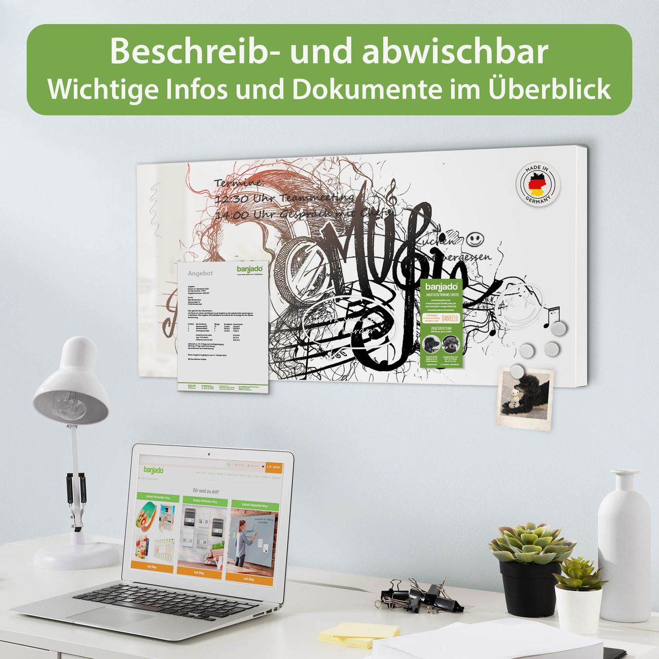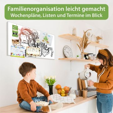 FUNKTION: Die banjado Magnettafel 78x37 cm im Design Motiv Musikalische Illustration vereint Funktionalität und modernes Wohndesign auf stilvolle Weise. Diese hochwertige Magnetwand aus Metall hilft Ihnen dabei, Notizen, Fotos, Termine, Einkaufslisten oder Rezepte übersichtlich zu organisieren. Als praktisches Memoboard sorgt sie für Struktur im Alltag und setzt gleichzeitig einen dekorativen Akzent an Ihrer Wand. DESIGN: Die Metalltafel besteht aus robustem, lackiertem Stahl und ist mit allen handelsüblichen Magneten nutzbar. Besonders praktisch ist die beschreibbare Oberfläche. Sie können die Magnettafel ganz einfach mit Kreidestiften beschriften und die Inhalte bei Bedarf mit einem feuchten Tuch wieder entfernen. So eignet sich das Memoboard ideal für Wochenpläne, Menüpläne, To Do Listen oder kreative Botschaften. DETAILS: Mit ihrem großzügigen Querformat von 78x37 cm bietet die Magnettafel ausreichend Platz für Ihre Organisation. Das Motiv Motiv Musikalische Illustration bringt eine warme, natürliche Optik in Küche, Flur, Büro oder Homeoffice und wirkt auch ohne Magnete oder Beschriftung wie ein modernes Wandbild. NUTZEN: Auf der Rückseite befinden sich vorgefertigte Löcher für eine schnelle und unkomplizierte Wandmontage. Jede banjado Magnettafel wird in Deutschland gefertigt und steht für Qualität, Langlebigkeit und liebevolle Verarbeitung. Dieses beschreibbare Memoboard ist die perfekte Kombination aus Metalltafel, Designobjekt und praktischer Magnetwand für Ihren Alltag. BANJADO: Wir sind ein kleines Team aus dem Herzen von Sachsen. Wir fertigen alle Artikel von Hand für Sie an, Sie erhalten keine preiswerte Importware. Auf Wunsch können Sie auch Ihr eigenes Foto auf die Magnettafel aufbringen, schreiben Sie uns an. Herzlichst, Ihr banjado-Team