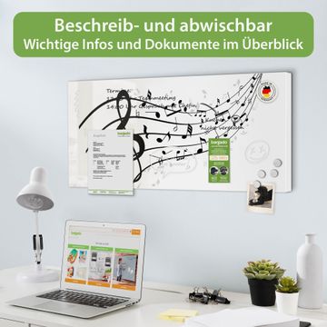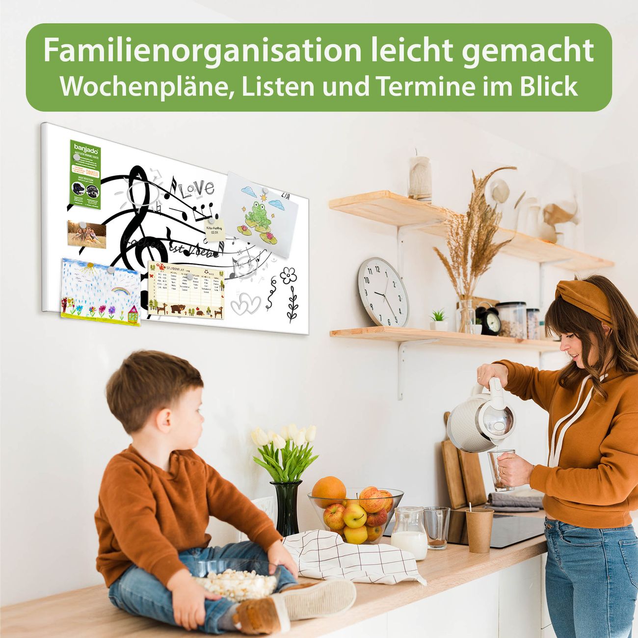 FUNKTION: Die banjado Magnettafel 78x37 cm im Design Motiv Musikalische Noten vereint Funktionalität und modernes Wohndesign auf stilvolle Weise. Diese hochwertige Magnetwand aus Metall hilft Ihnen dabei, Notizen, Fotos, Termine, Einkaufslisten oder Rezepte übersichtlich zu organisieren. Als praktisches Memoboard sorgt sie für Struktur im Alltag und setzt gleichzeitig einen dekorativen Akzent an Ihrer Wand. DESIGN: Die Metalltafel besteht aus robustem, lackiertem Stahl und ist mit allen handelsüblichen Magneten nutzbar. Besonders praktisch ist die beschreibbare Oberfläche. Sie können die Magnettafel ganz einfach mit Kreidestiften beschriften und die Inhalte bei Bedarf mit einem feuchten Tuch wieder entfernen. So eignet sich das Memoboard ideal für Wochenpläne, Menüpläne, To Do Listen oder kreative Botschaften. DETAILS: Mit ihrem großzügigen Querformat von 78x37 cm bietet die Magnettafel ausreichend Platz für Ihre Organisation. Das Motiv Motiv Musikalische Noten bringt eine warme, natürliche Optik in Küche, Flur, Büro oder Homeoffice und wirkt auch ohne Magnete oder Beschriftung wie ein modernes Wandbild. NUTZEN: Auf der Rückseite befinden sich vorgefertigte Löcher für eine schnelle und unkomplizierte Wandmontage. Jede banjado Magnettafel wird in Deutschland gefertigt und steht für Qualität, Langlebigkeit und liebevolle Verarbeitung. Dieses beschreibbare Memoboard ist die perfekte Kombination aus Metalltafel, Designobjekt und praktischer Magnetwand für Ihren Alltag. BANJADO: Wir sind ein kleines Team aus dem Herzen von Sachsen. Wir fertigen alle Artikel von Hand für Sie an, Sie erhalten keine preiswerte Importware. Auf Wunsch können Sie auch Ihr eigenes Foto auf die Magnettafel aufbringen, schreiben Sie uns an. Herzlichst, Ihr banjado-Team
