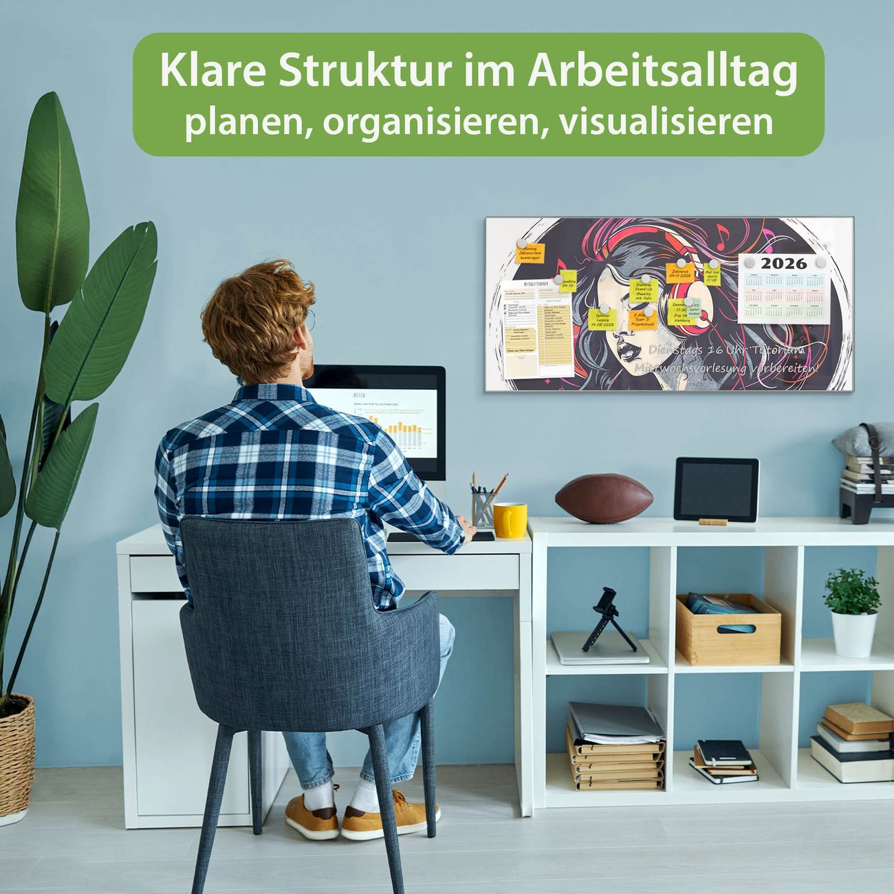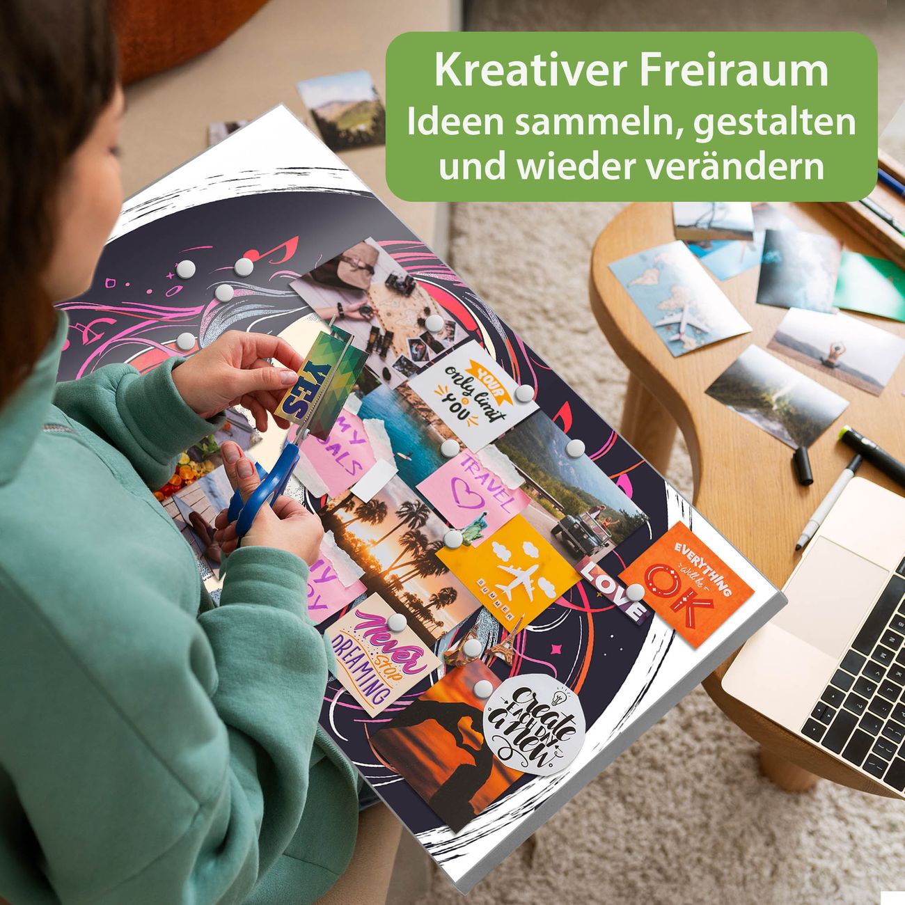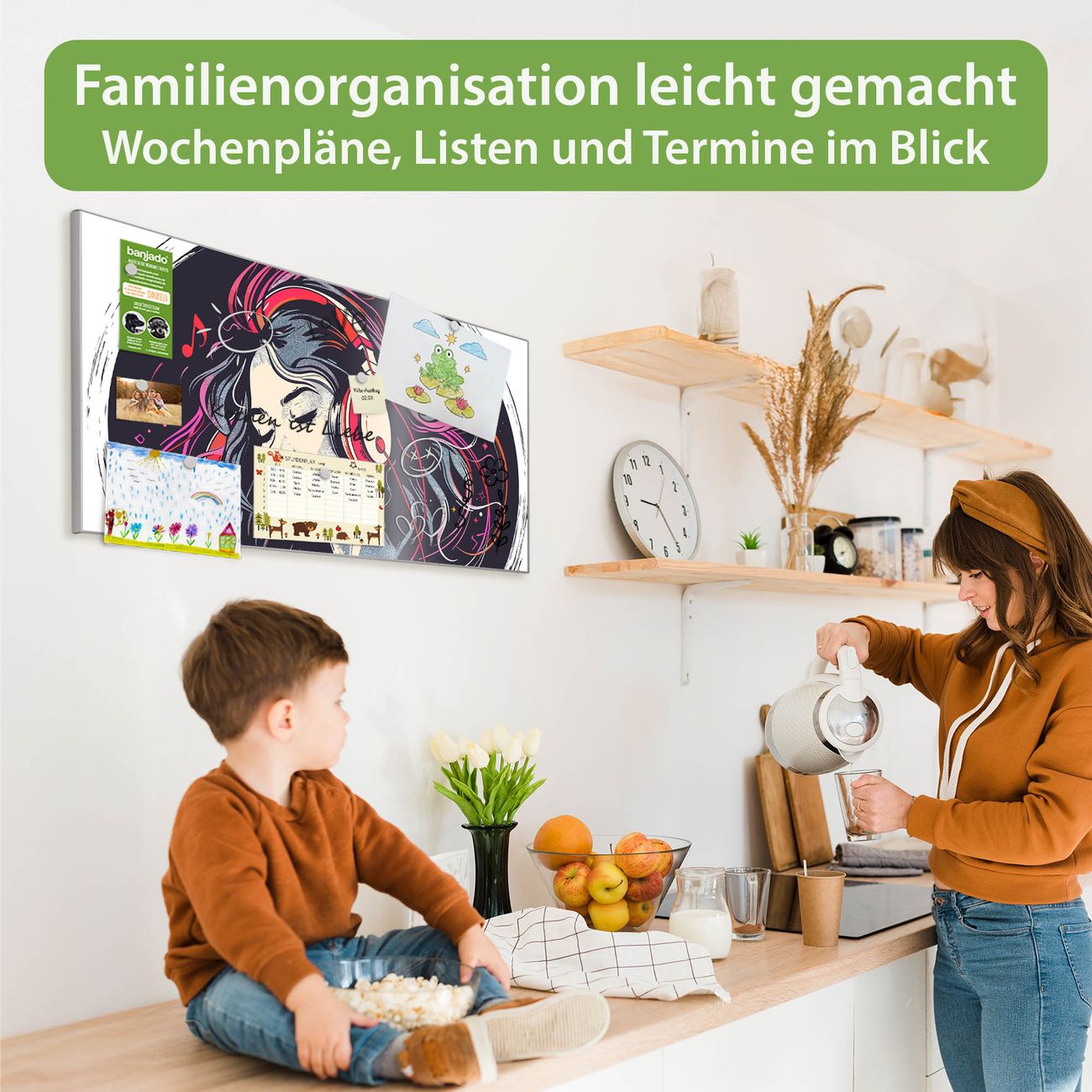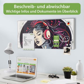 FUNKTION: Die banjado Magnettafel 78x37 cm im Design Motiv Musikalischer Traum vereint Funktionalität und modernes Wohndesign auf stilvolle Weise. Diese hochwertige Magnetwand aus Metall hilft Ihnen dabei, Notizen, Fotos, Termine, Einkaufslisten oder Rezepte übersichtlich zu organisieren. Als praktisches Memoboard sorgt sie für Struktur im Alltag und setzt gleichzeitig einen dekorativen Akzent an Ihrer Wand. DESIGN: Die Metalltafel besteht aus robustem, lackiertem Stahl und ist mit allen handelsüblichen Magneten nutzbar. Besonders praktisch ist die beschreibbare Oberfläche. Sie können die Magnettafel ganz einfach mit Kreidestiften beschriften und die Inhalte bei Bedarf mit einem feuchten Tuch wieder entfernen. So eignet sich das Memoboard ideal für Wochenpläne, Menüpläne, To Do Listen oder kreative Botschaften. DETAILS: Mit ihrem großzügigen Querformat von 78x37 cm bietet die Magnettafel ausreichend Platz für Ihre Organisation. Das Motiv Motiv Musikalischer Traum bringt eine warme, natürliche Optik in Küche, Flur, Büro oder Homeoffice und wirkt auch ohne Magnete oder Beschriftung wie ein modernes Wandbild. NUTZEN: Auf der Rückseite befinden sich vorgefertigte Löcher für eine schnelle und unkomplizierte Wandmontage. Jede banjado Magnettafel wird in Deutschland gefertigt und steht für Qualität, Langlebigkeit und liebevolle Verarbeitung. Dieses beschreibbare Memoboard ist die perfekte Kombination aus Metalltafel, Designobjekt und praktischer Magnetwand für Ihren Alltag. BANJADO: Wir sind ein kleines Team aus dem Herzen von Sachsen. Wir fertigen alle Artikel von Hand für Sie an, Sie erhalten keine preiswerte Importware. Auf Wunsch können Sie auch Ihr eigenes Foto auf die Magnettafel aufbringen, schreiben Sie uns an. Herzlichst, Ihr banjado-Team