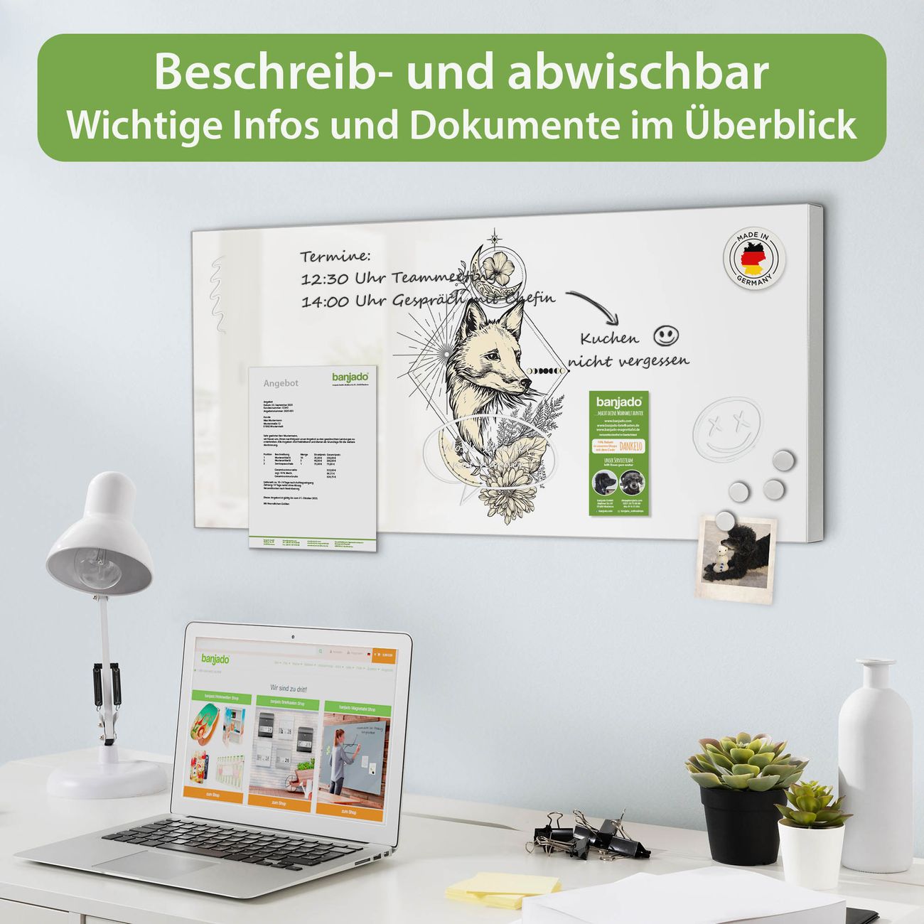 FUNKTION: Die banjado Magnettafel 78x37 cm im Design Motiv Mystischer Fuchs vereint Funktionalität und modernes Wohndesign auf stilvolle Weise. Diese hochwertige Magnetwand aus Metall hilft Ihnen dabei, Notizen, Fotos, Termine, Einkaufslisten oder Rezepte übersichtlich zu organisieren. Als praktisches Memoboard sorgt sie für Struktur im Alltag und setzt gleichzeitig einen dekorativen Akzent an Ihrer Wand. DESIGN: Die Metalltafel besteht aus robustem, lackiertem Stahl und ist mit allen handelsüblichen Magneten nutzbar. Besonders praktisch ist die beschreibbare Oberfläche. Sie können die Magnettafel ganz einfach mit Kreidestiften beschriften und die Inhalte bei Bedarf mit einem feuchten Tuch wieder entfernen. So eignet sich das Memoboard ideal für Wochenpläne, Menüpläne, To Do Listen oder kreative Botschaften. DETAILS: Mit ihrem großzügigen Querformat von 78x37 cm bietet die Magnettafel ausreichend Platz für Ihre Organisation. Das Motiv Motiv Mystischer Fuchs bringt eine warme, natürliche Optik in Küche, Flur, Büro oder Homeoffice und wirkt auch ohne Magnete oder Beschriftung wie ein modernes Wandbild. NUTZEN: Auf der Rückseite befinden sich vorgefertigte Löcher für eine schnelle und unkomplizierte Wandmontage. Jede banjado Magnettafel wird in Deutschland gefertigt und steht für Qualität, Langlebigkeit und liebevolle Verarbeitung. Dieses beschreibbare Memoboard ist die perfekte Kombination aus Metalltafel, Designobjekt und praktischer Magnetwand für Ihren Alltag. BANJADO: Wir sind ein kleines Team aus dem Herzen von Sachsen. Wir fertigen alle Artikel von Hand für Sie an, Sie erhalten keine preiswerte Importware. Auf Wunsch können Sie auch Ihr eigenes Foto auf die Magnettafel aufbringen, schreiben Sie uns an. Herzlichst, Ihr banjado-Team