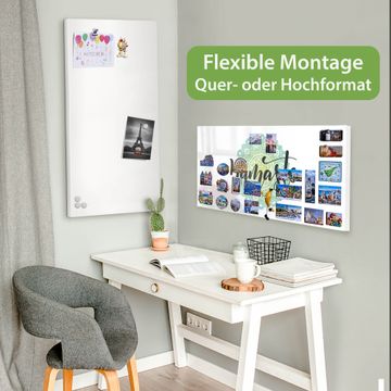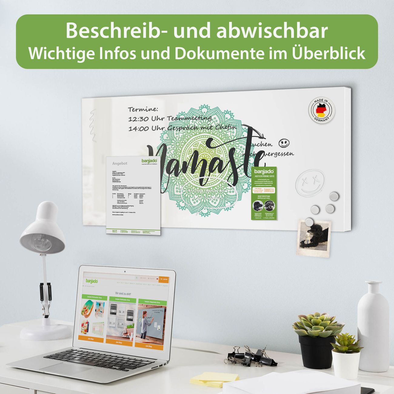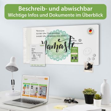 FUNKTION: Die banjado Magnettafel 78x37 cm im Design Motiv Namaste Mandala vereint Funktionalität und modernes Wohndesign auf stilvolle Weise. Diese hochwertige Magnetwand aus Metall hilft Ihnen dabei, Notizen, Fotos, Termine, Einkaufslisten oder Rezepte übersichtlich zu organisieren. Als praktisches Memoboard sorgt sie für Struktur im Alltag und setzt gleichzeitig einen dekorativen Akzent an Ihrer Wand. DESIGN: Die Metalltafel besteht aus robustem, lackiertem Stahl und ist mit allen handelsüblichen Magneten nutzbar. Besonders praktisch ist die beschreibbare Oberfläche. Sie können die Magnettafel ganz einfach mit Kreidestiften beschriften und die Inhalte bei Bedarf mit einem feuchten Tuch wieder entfernen. So eignet sich das Memoboard ideal für Wochenpläne, Menüpläne, To Do Listen oder kreative Botschaften. DETAILS: Mit ihrem großzügigen Querformat von 78x37 cm bietet die Magnettafel ausreichend Platz für Ihre Organisation. Das Motiv Motiv Namaste Mandala bringt eine warme, natürliche Optik in Küche, Flur, Büro oder Homeoffice und wirkt auch ohne Magnete oder Beschriftung wie ein modernes Wandbild. NUTZEN: Auf der Rückseite befinden sich vorgefertigte Löcher für eine schnelle und unkomplizierte Wandmontage. Jede banjado Magnettafel wird in Deutschland gefertigt und steht für Qualität, Langlebigkeit und liebevolle Verarbeitung. Dieses beschreibbare Memoboard ist die perfekte Kombination aus Metalltafel, Designobjekt und praktischer Magnetwand für Ihren Alltag. BANJADO: Wir sind ein kleines Team aus dem Herzen von Sachsen. Wir fertigen alle Artikel von Hand für Sie an, Sie erhalten keine preiswerte Importware. Auf Wunsch können Sie auch Ihr eigenes Foto auf die Magnettafel aufbringen, schreiben Sie uns an. Herzlichst, Ihr banjado-Team