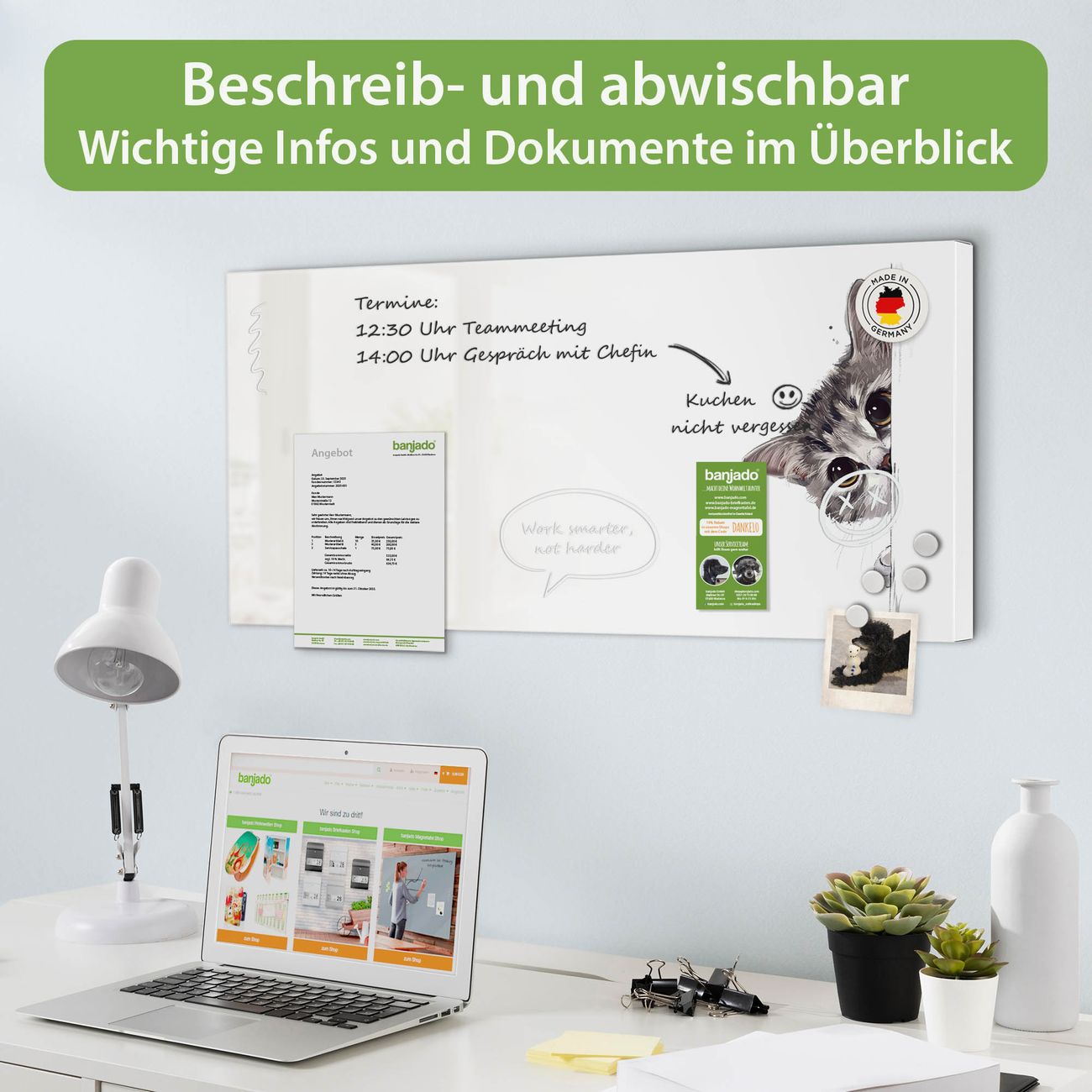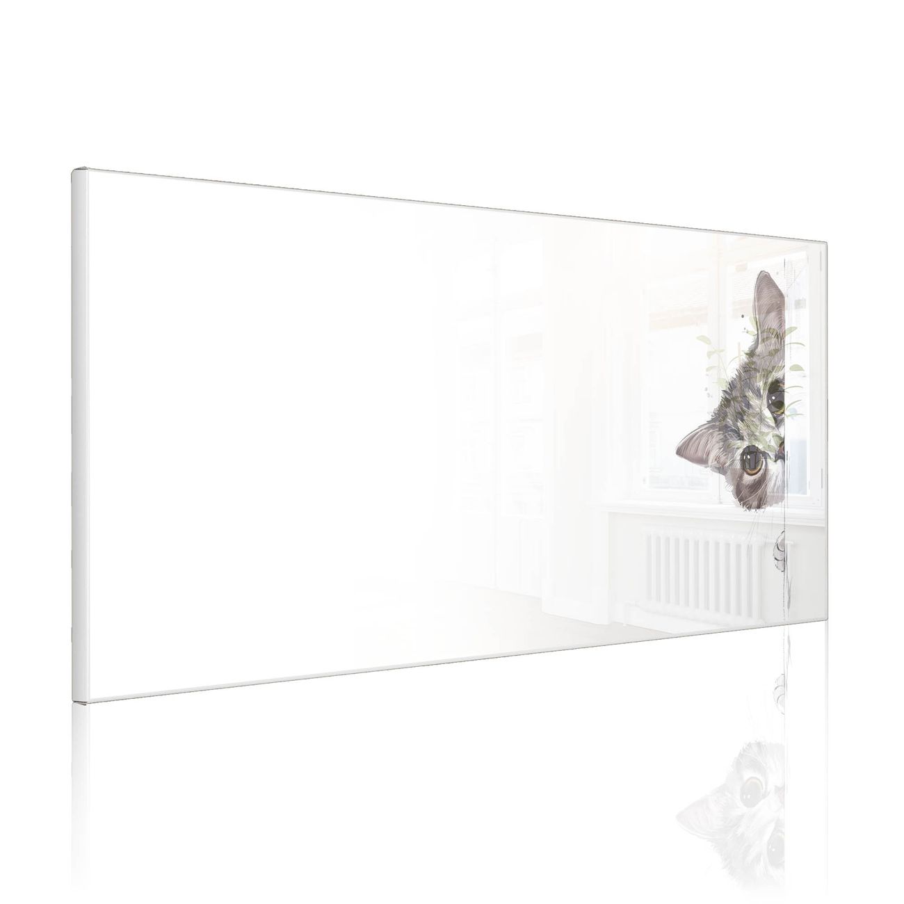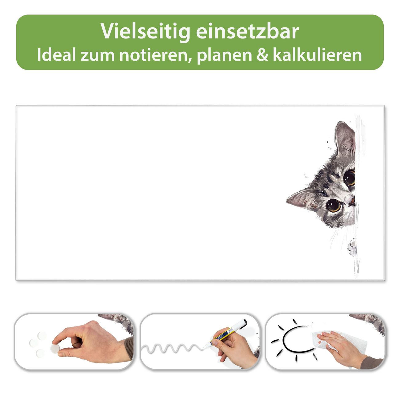 FUNKTION: Die banjado Magnettafel 78x37 cm im Design Motiv Neugierige Katze vereint Funktionalität und modernes Wohndesign auf stilvolle Weise. Diese hochwertige Magnetwand aus Metall hilft Ihnen dabei, Notizen, Fotos, Termine, Einkaufslisten oder Rezepte übersichtlich zu organisieren. Als praktisches Memoboard sorgt sie für Struktur im Alltag und setzt gleichzeitig einen dekorativen Akzent an Ihrer Wand. DESIGN: Die Metalltafel besteht aus robustem, lackiertem Stahl und ist mit allen handelsüblichen Magneten nutzbar. Besonders praktisch ist die beschreibbare Oberfläche. Sie können die Magnettafel ganz einfach mit Kreidestiften beschriften und die Inhalte bei Bedarf mit einem feuchten Tuch wieder entfernen. So eignet sich das Memoboard ideal für Wochenpläne, Menüpläne, To Do Listen oder kreative Botschaften. DETAILS: Mit ihrem großzügigen Querformat von 78x37 cm bietet die Magnettafel ausreichend Platz für Ihre Organisation. Das Motiv Motiv Neugierige Katze bringt eine warme, natürliche Optik in Küche, Flur, Büro oder Homeoffice und wirkt auch ohne Magnete oder Beschriftung wie ein modernes Wandbild. NUTZEN: Auf der Rückseite befinden sich vorgefertigte Löcher für eine schnelle und unkomplizierte Wandmontage. Jede banjado Magnettafel wird in Deutschland gefertigt und steht für Qualität, Langlebigkeit und liebevolle Verarbeitung. Dieses beschreibbare Memoboard ist die perfekte Kombination aus Metalltafel, Designobjekt und praktischer Magnetwand für Ihren Alltag. BANJADO: Wir sind ein kleines Team aus dem Herzen von Sachsen. Wir fertigen alle Artikel von Hand für Sie an, Sie erhalten keine preiswerte Importware. Auf Wunsch können Sie auch Ihr eigenes Foto auf die Magnettafel aufbringen, schreiben Sie uns an. Herzlichst, Ihr banjado-Team
