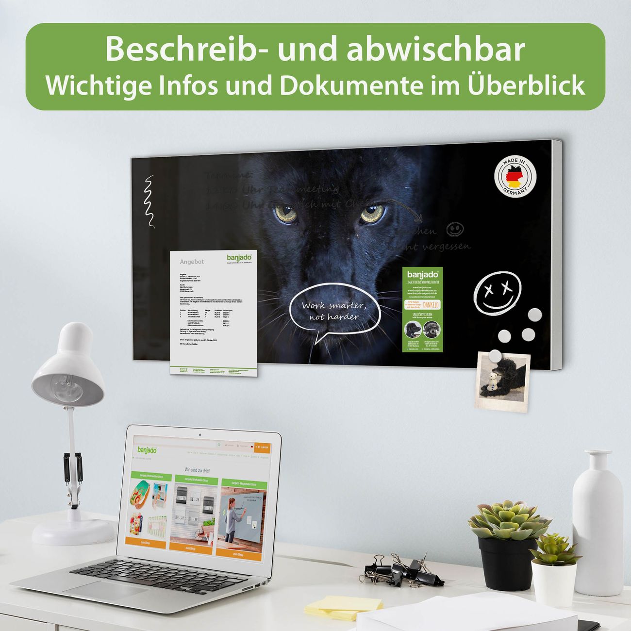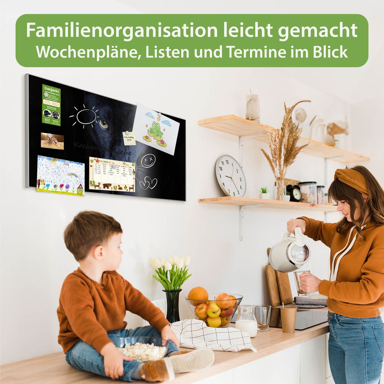 FUNKTION: Die banjado Magnettafel 78x37 cm im Design Motiv Nora vereint Funktionalität und modernes Wohndesign auf stilvolle Weise. Diese hochwertige Magnetwand aus Metall hilft Ihnen dabei, Notizen, Fotos, Termine, Einkaufslisten oder Rezepte übersichtlich zu organisieren. Als praktisches Memoboard sorgt sie für Struktur im Alltag und setzt gleichzeitig einen dekorativen Akzent an Ihrer Wand. DESIGN: Die Metalltafel besteht aus robustem, lackiertem Stahl und ist mit allen handelsüblichen Magneten nutzbar. Besonders praktisch ist die beschreibbare Oberfläche. Sie können die Magnettafel ganz einfach mit Kreidestiften beschriften und die Inhalte bei Bedarf mit einem feuchten Tuch wieder entfernen. So eignet sich das Memoboard ideal für Wochenpläne, Menüpläne, To Do Listen oder kreative Botschaften. DETAILS: Mit ihrem großzügigen Querformat von 78x37 cm bietet die Magnettafel ausreichend Platz für Ihre Organisation. Das Motiv Motiv Nora bringt eine warme, natürliche Optik in Küche, Flur, Büro oder Homeoffice und wirkt auch ohne Magnete oder Beschriftung wie ein modernes Wandbild. NUTZEN: Auf der Rückseite befinden sich vorgefertigte Löcher für eine schnelle und unkomplizierte Wandmontage. Jede banjado Magnettafel wird in Deutschland gefertigt und steht für Qualität, Langlebigkeit und liebevolle Verarbeitung. Dieses beschreibbare Memoboard ist die perfekte Kombination aus Metalltafel, Designobjekt und praktischer Magnetwand für Ihren Alltag. BANJADO: Wir sind ein kleines Team aus dem Herzen von Sachsen. Wir fertigen alle Artikel von Hand für Sie an, Sie erhalten keine preiswerte Importware. Auf Wunsch können Sie auch Ihr eigenes Foto auf die Magnettafel aufbringen, schreiben Sie uns an. Herzlichst, Ihr banjado-Team