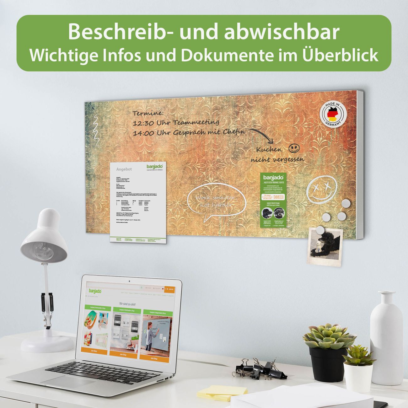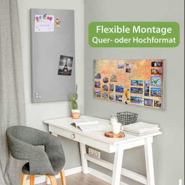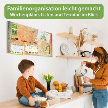 FUNKTION: Die banjado Magnettafel 78x37 cm im Design Motiv Nostalgisches Muster vereint Funktionalität und modernes Wohndesign auf stilvolle Weise. Diese hochwertige Magnetwand aus Metall hilft Ihnen dabei, Notizen, Fotos, Termine, Einkaufslisten oder Rezepte übersichtlich zu organisieren. Als praktisches Memoboard sorgt sie für Struktur im Alltag und setzt gleichzeitig einen dekorativen Akzent an Ihrer Wand. DESIGN: Die Metalltafel besteht aus robustem, lackiertem Stahl und ist mit allen handelsüblichen Magneten nutzbar. Besonders praktisch ist die beschreibbare Oberfläche. Sie können die Magnettafel ganz einfach mit Kreidestiften beschriften und die Inhalte bei Bedarf mit einem feuchten Tuch wieder entfernen. So eignet sich das Memoboard ideal für Wochenpläne, Menüpläne, To Do Listen oder kreative Botschaften. DETAILS: Mit ihrem großzügigen Querformat von 78x37 cm bietet die Magnettafel ausreichend Platz für Ihre Organisation. Das Motiv Motiv Nostalgisches Muster bringt eine warme, natürliche Optik in Küche, Flur, Büro oder Homeoffice und wirkt auch ohne Magnete oder Beschriftung wie ein modernes Wandbild. NUTZEN: Auf der Rückseite befinden sich vorgefertigte Löcher für eine schnelle und unkomplizierte Wandmontage. Jede banjado Magnettafel wird in Deutschland gefertigt und steht für Qualität, Langlebigkeit und liebevolle Verarbeitung. Dieses beschreibbare Memoboard ist die perfekte Kombination aus Metalltafel, Designobjekt und praktischer Magnetwand für Ihren Alltag. BANJADO: Wir sind ein kleines Team aus dem Herzen von Sachsen. Wir fertigen alle Artikel von Hand für Sie an, Sie erhalten keine preiswerte Importware. Auf Wunsch können Sie auch Ihr eigenes Foto auf die Magnettafel aufbringen, schreiben Sie uns an. Herzlichst, Ihr banjado-Team