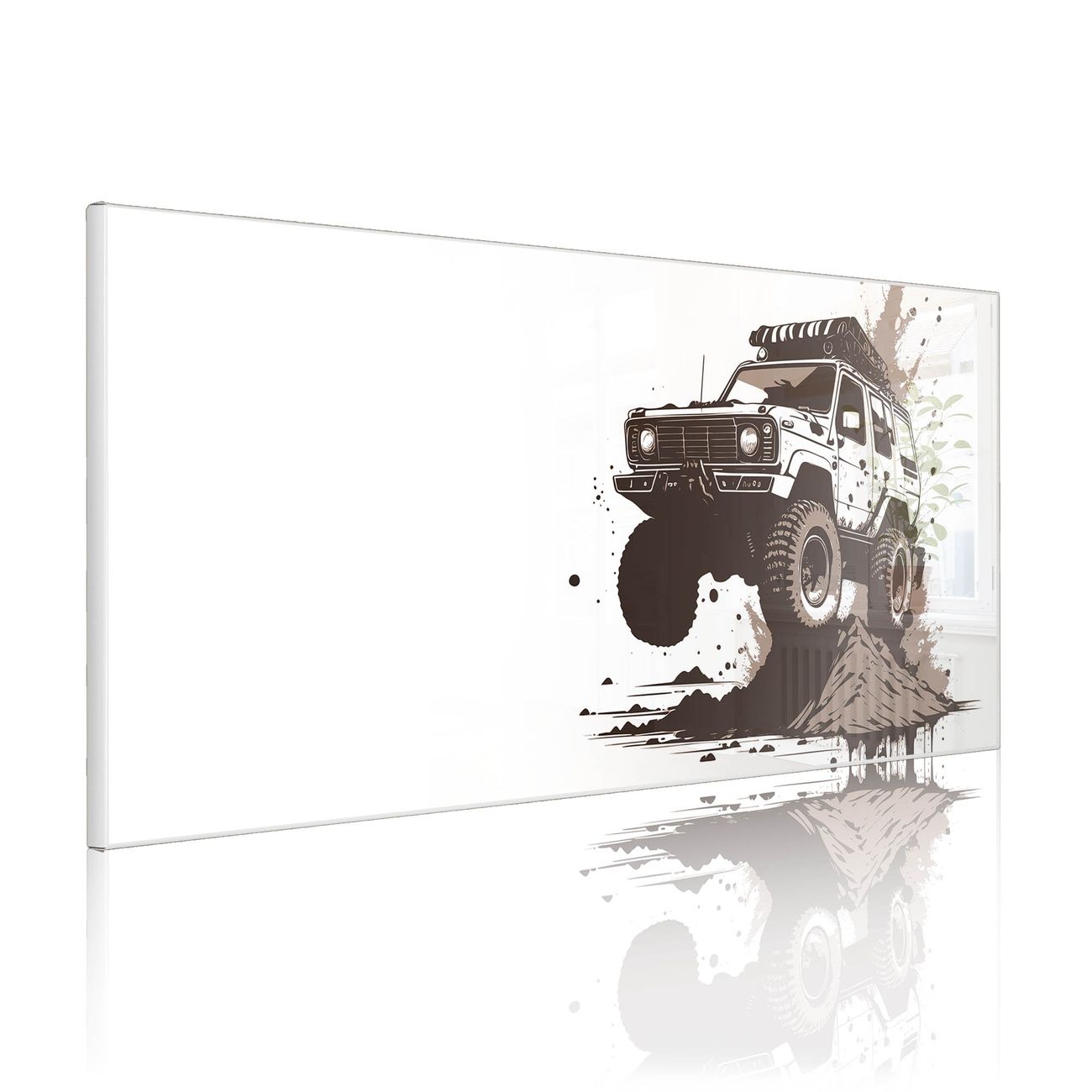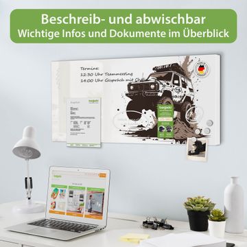 FUNKTION: Die banjado Magnettafel 78x37 cm im Design Motiv Offroad Abenteuer 3 vereint Funktionalität und modernes Wohndesign auf stilvolle Weise. Diese hochwertige Magnetwand aus Metall hilft Ihnen dabei, Notizen, Fotos, Termine, Einkaufslisten oder Rezepte übersichtlich zu organisieren. Als praktisches Memoboard sorgt sie für Struktur im Alltag und setzt gleichzeitig einen dekorativen Akzent an Ihrer Wand. DESIGN: Die Metalltafel besteht aus robustem, lackiertem Stahl und ist mit allen handelsüblichen Magneten nutzbar. Besonders praktisch ist die beschreibbare Oberfläche. Sie können die Magnettafel ganz einfach mit Kreidestiften beschriften und die Inhalte bei Bedarf mit einem feuchten Tuch wieder entfernen. So eignet sich das Memoboard ideal für Wochenpläne, Menüpläne, To Do Listen oder kreative Botschaften. DETAILS: Mit ihrem großzügigen Querformat von 78x37 cm bietet die Magnettafel ausreichend Platz für Ihre Organisation. Das Motiv Motiv Offroad Abenteuer 3 bringt eine warme, natürliche Optik in Küche, Flur, Büro oder Homeoffice und wirkt auch ohne Magnete oder Beschriftung wie ein modernes Wandbild. NUTZEN: Auf der Rückseite befinden sich vorgefertigte Löcher für eine schnelle und unkomplizierte Wandmontage. Jede banjado Magnettafel wird in Deutschland gefertigt und steht für Qualität, Langlebigkeit und liebevolle Verarbeitung. Dieses beschreibbare Memoboard ist die perfekte Kombination aus Metalltafel, Designobjekt und praktischer Magnetwand für Ihren Alltag. BANJADO: Wir sind ein kleines Team aus dem Herzen von Sachsen. Wir fertigen alle Artikel von Hand für Sie an, Sie erhalten keine preiswerte Importware. Auf Wunsch können Sie auch Ihr eigenes Foto auf die Magnettafel aufbringen, schreiben Sie uns an. Herzlichst, Ihr banjado-Team