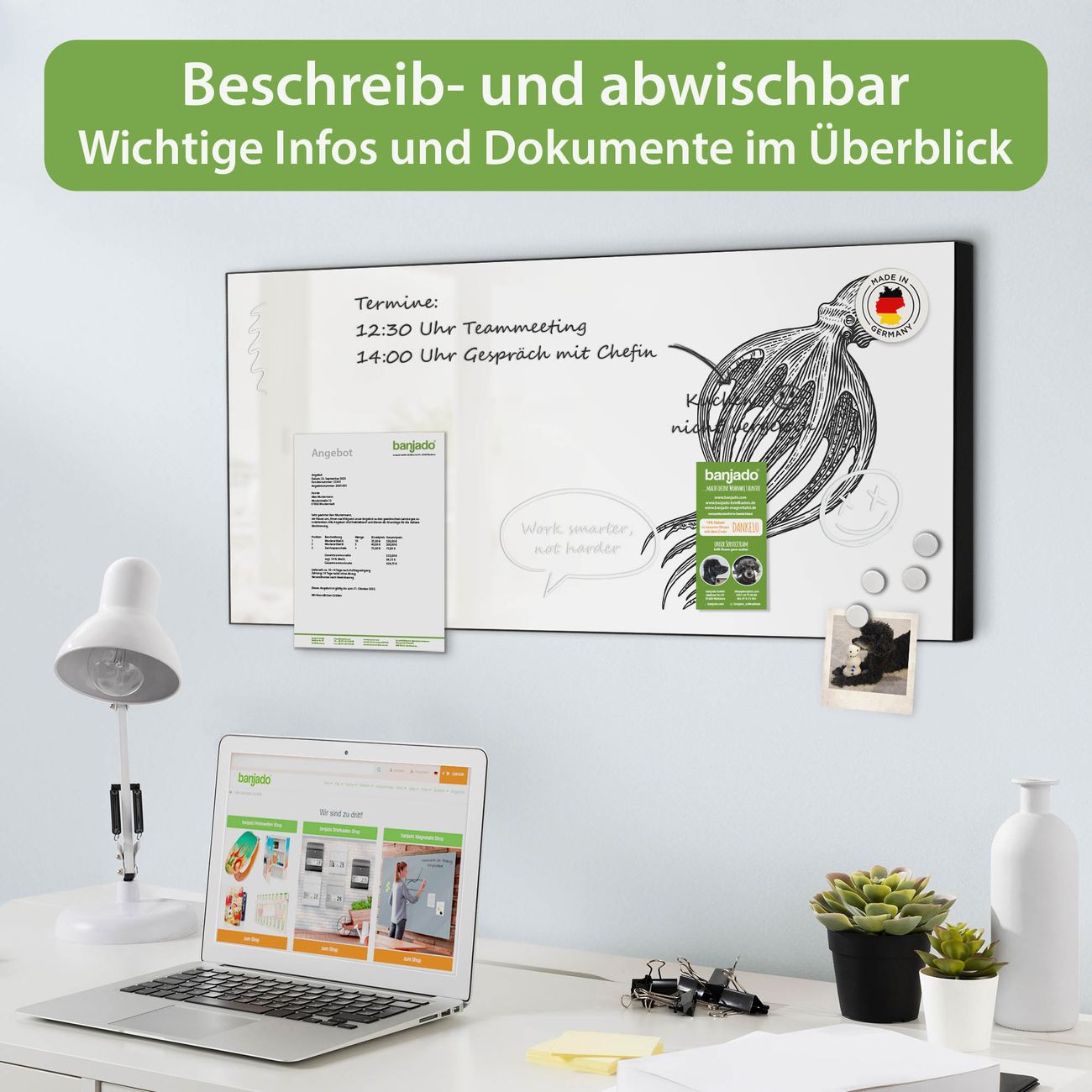 FUNKTION: Die banjado Magnettafel 78x37 cm im Design Motiv Oktopus 8 vereint Funktionalität und modernes Wohndesign auf stilvolle Weise. Diese hochwertige Magnetwand aus Metall hilft Ihnen dabei, Notizen, Fotos, Termine, Einkaufslisten oder Rezepte übersichtlich zu organisieren. Als praktisches Memoboard sorgt sie für Struktur im Alltag und setzt gleichzeitig einen dekorativen Akzent an Ihrer Wand. DESIGN: Die Metalltafel besteht aus robustem, lackiertem Stahl und ist mit allen handelsüblichen Magneten nutzbar. Besonders praktisch ist die beschreibbare Oberfläche. Sie können die Magnettafel ganz einfach mit Kreidestiften beschriften und die Inhalte bei Bedarf mit einem feuchten Tuch wieder entfernen. So eignet sich das Memoboard ideal für Wochenpläne, Menüpläne, To Do Listen oder kreative Botschaften. DETAILS: Mit ihrem großzügigen Querformat von 78x37 cm bietet die Magnettafel ausreichend Platz für Ihre Organisation. Das Motiv Motiv Oktopus 8 bringt eine warme, natürliche Optik in Küche, Flur, Büro oder Homeoffice und wirkt auch ohne Magnete oder Beschriftung wie ein modernes Wandbild. NUTZEN: Auf der Rückseite befinden sich vorgefertigte Löcher für eine schnelle und unkomplizierte Wandmontage. Jede banjado Magnettafel wird in Deutschland gefertigt und steht für Qualität, Langlebigkeit und liebevolle Verarbeitung. Dieses beschreibbare Memoboard ist die perfekte Kombination aus Metalltafel, Designobjekt und praktischer Magnetwand für Ihren Alltag. BANJADO: Wir sind ein kleines Team aus dem Herzen von Sachsen. Wir fertigen alle Artikel von Hand für Sie an, Sie erhalten keine preiswerte Importware. Auf Wunsch können Sie auch Ihr eigenes Foto auf die Magnettafel aufbringen, schreiben Sie uns an. Herzlichst, Ihr banjado-Team